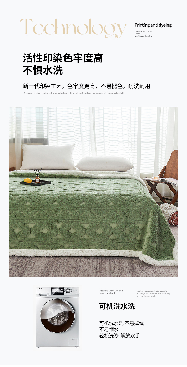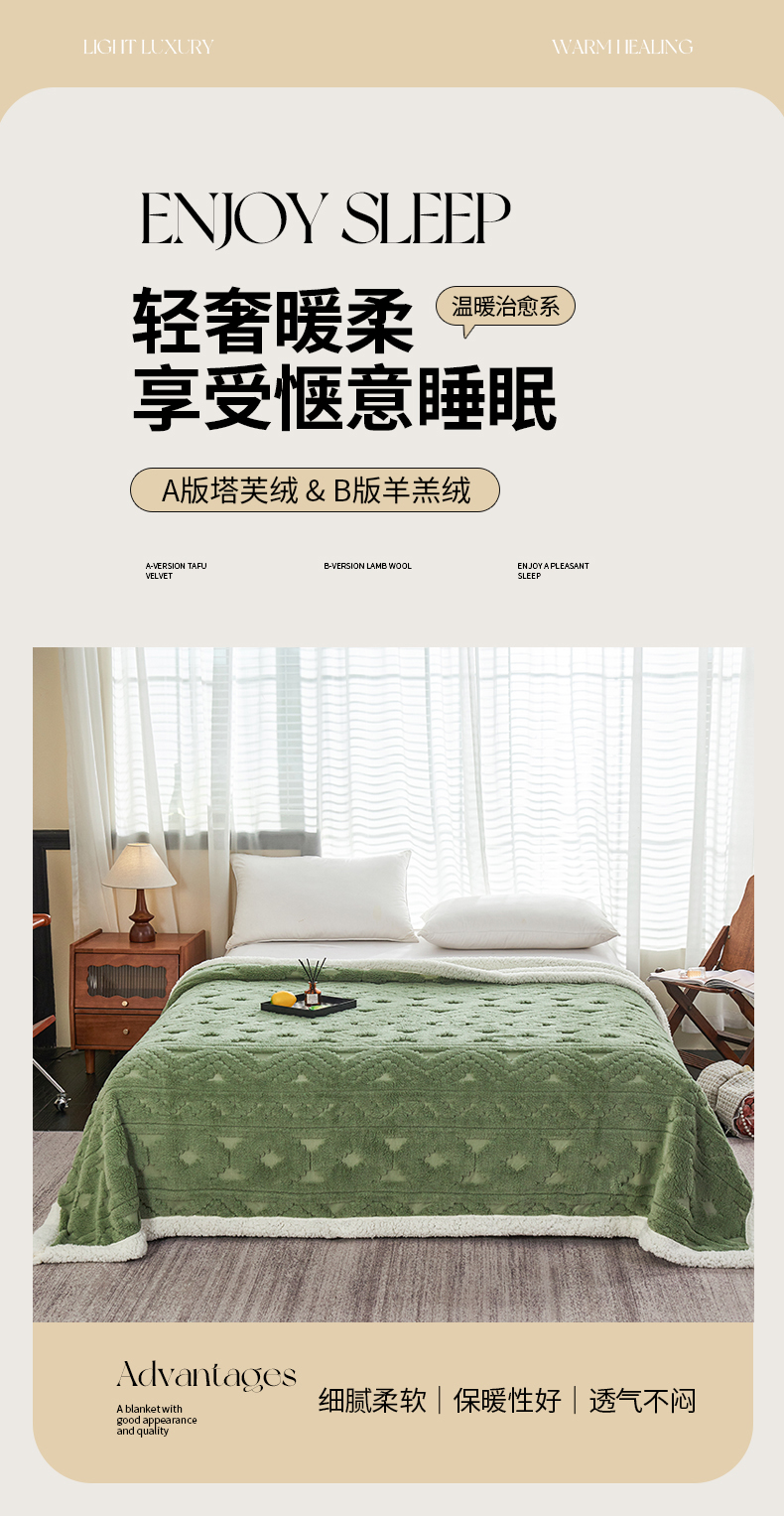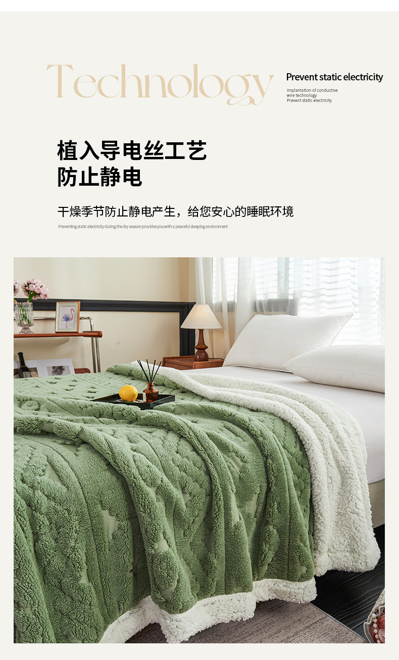 商品名称:枋梢家纺 2025新款提花舒棉绒镂空塔芙绒羊羔绒双层毛毯毯子跨境电商 韵律-果绿