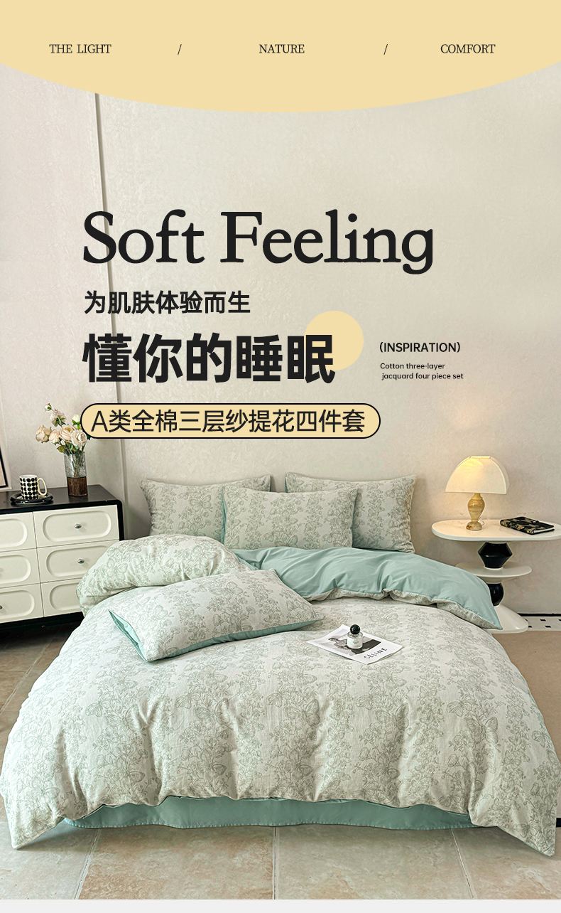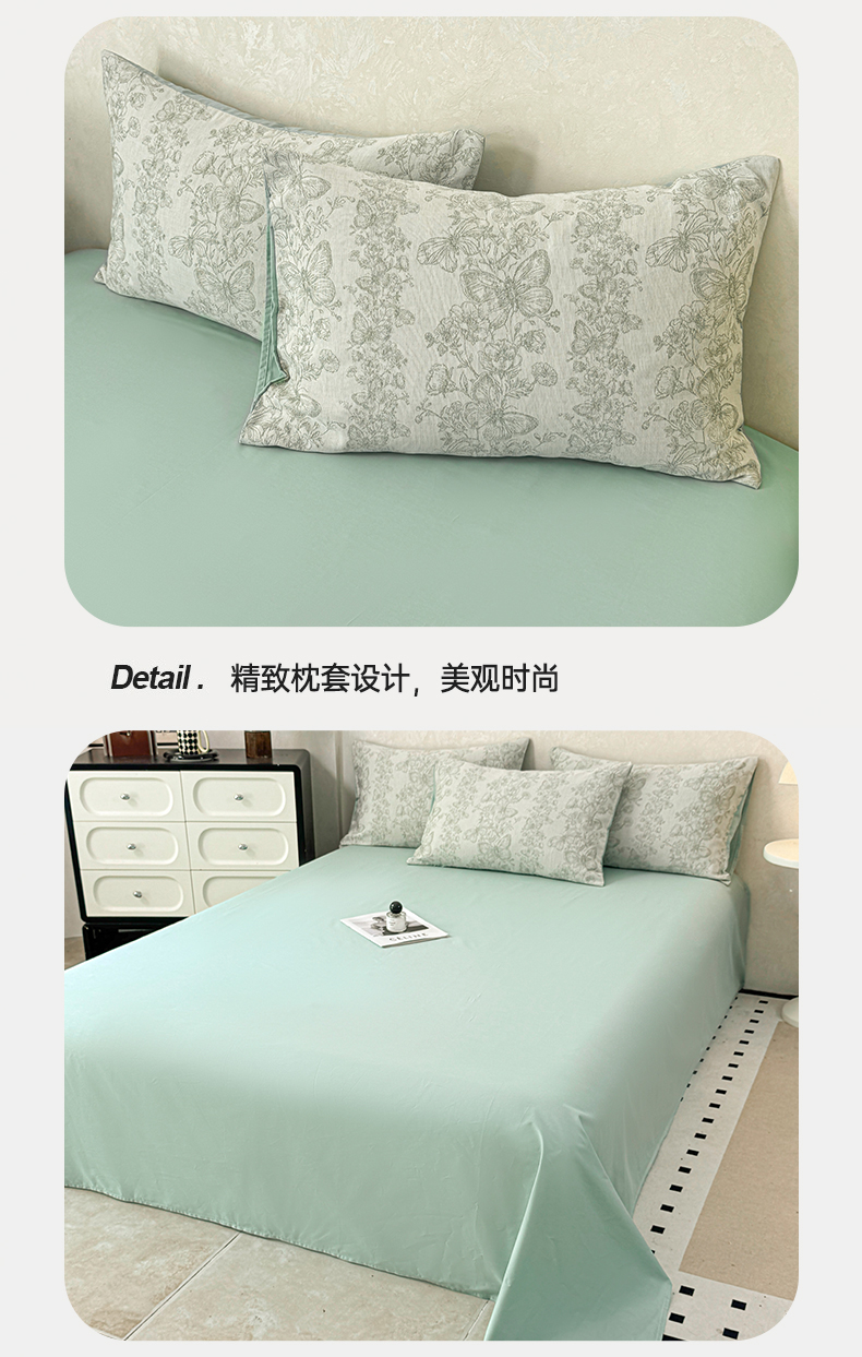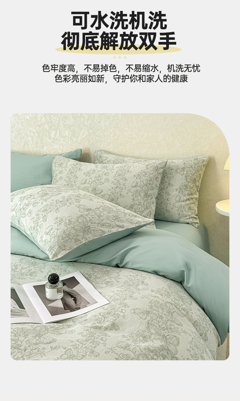 当前位置: 91家纺网 > 商品网购 > 床品套件 > 四件套 > 色织四件套 > 灰鲸2025新款A类全棉三层纱色织提花系列四件套 蝶飞-绿