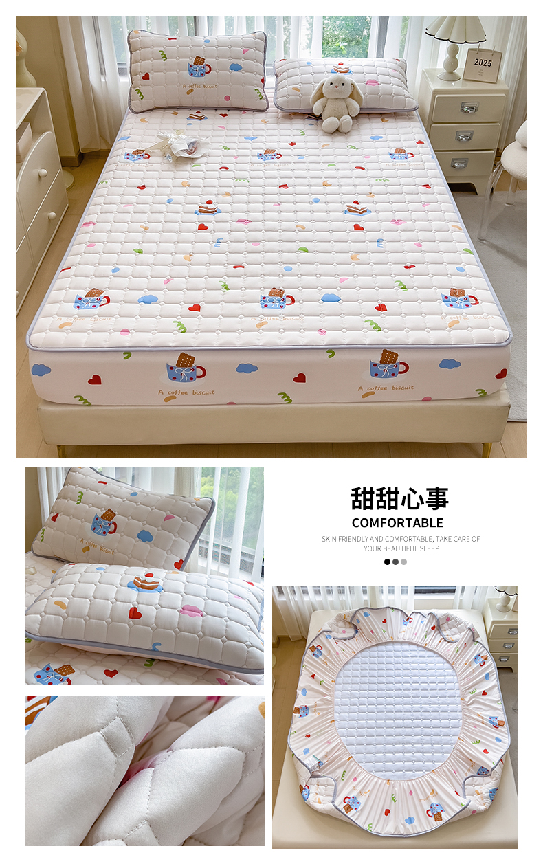 • 91家纺网 家纺一手货源 找家纺 雯豆家纺 2025四季款新品夹棉床笠三件套水洗棉磨毛小清新印花床垫保护套 甜甜心事