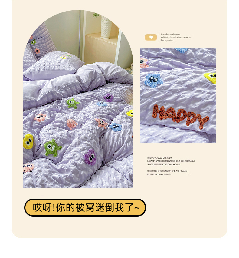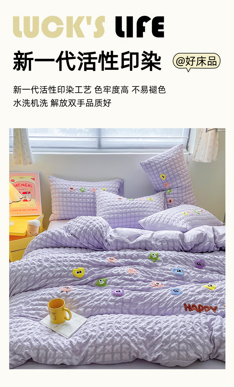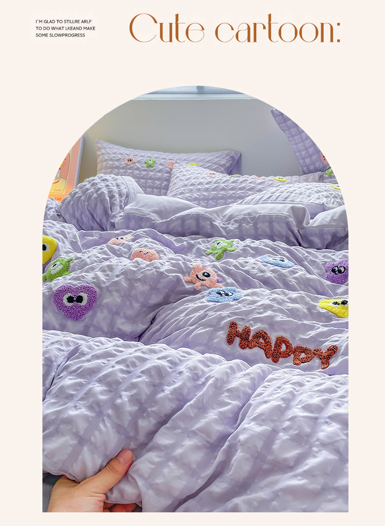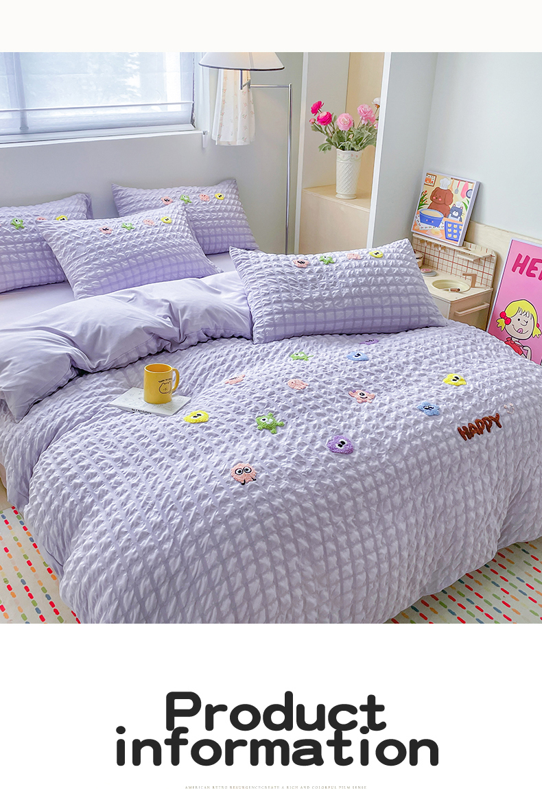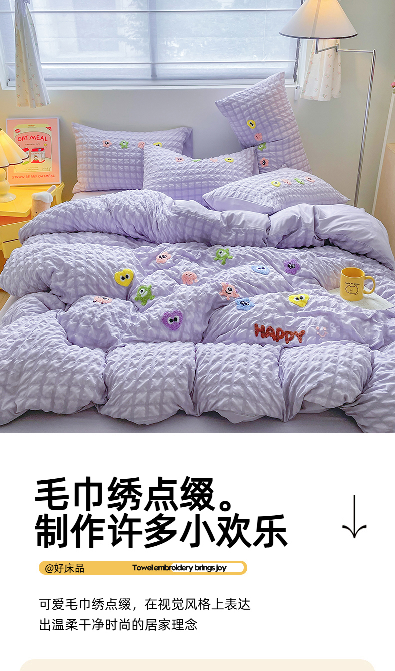 商品名称:千希家纺 2025新款高克重超柔泡泡纱毛巾绣泡芙精灵系列四件套 泡芙精灵-香芋紫