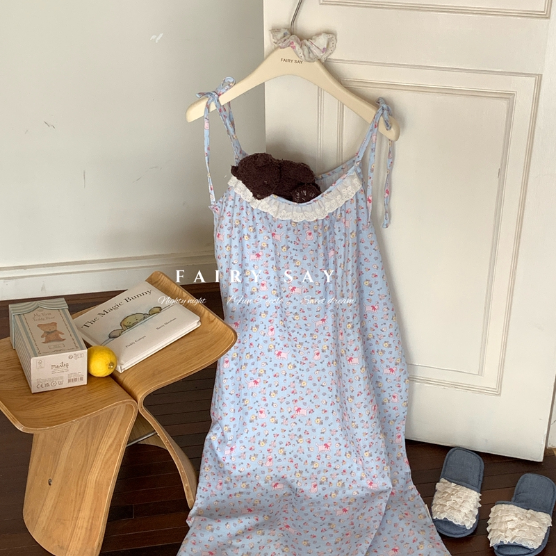 当前位置: 91家纺网 > 商品网购 > 居家日用 > 睡衣/家居服套装 > 妍景家居生活馆 2025新款纱布吊带睡裙 蓝底碎花猫咪