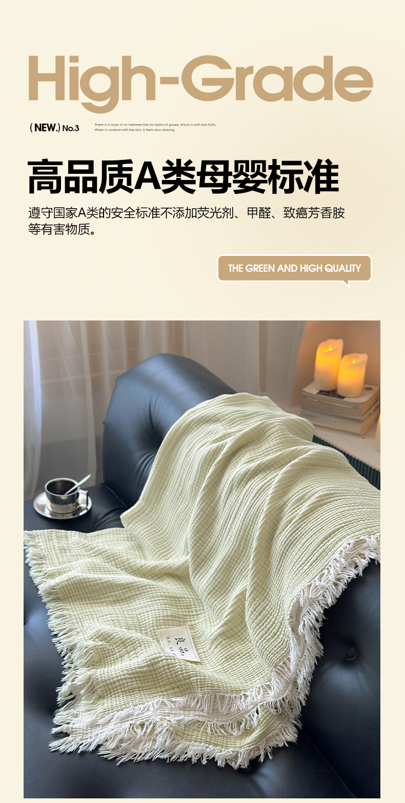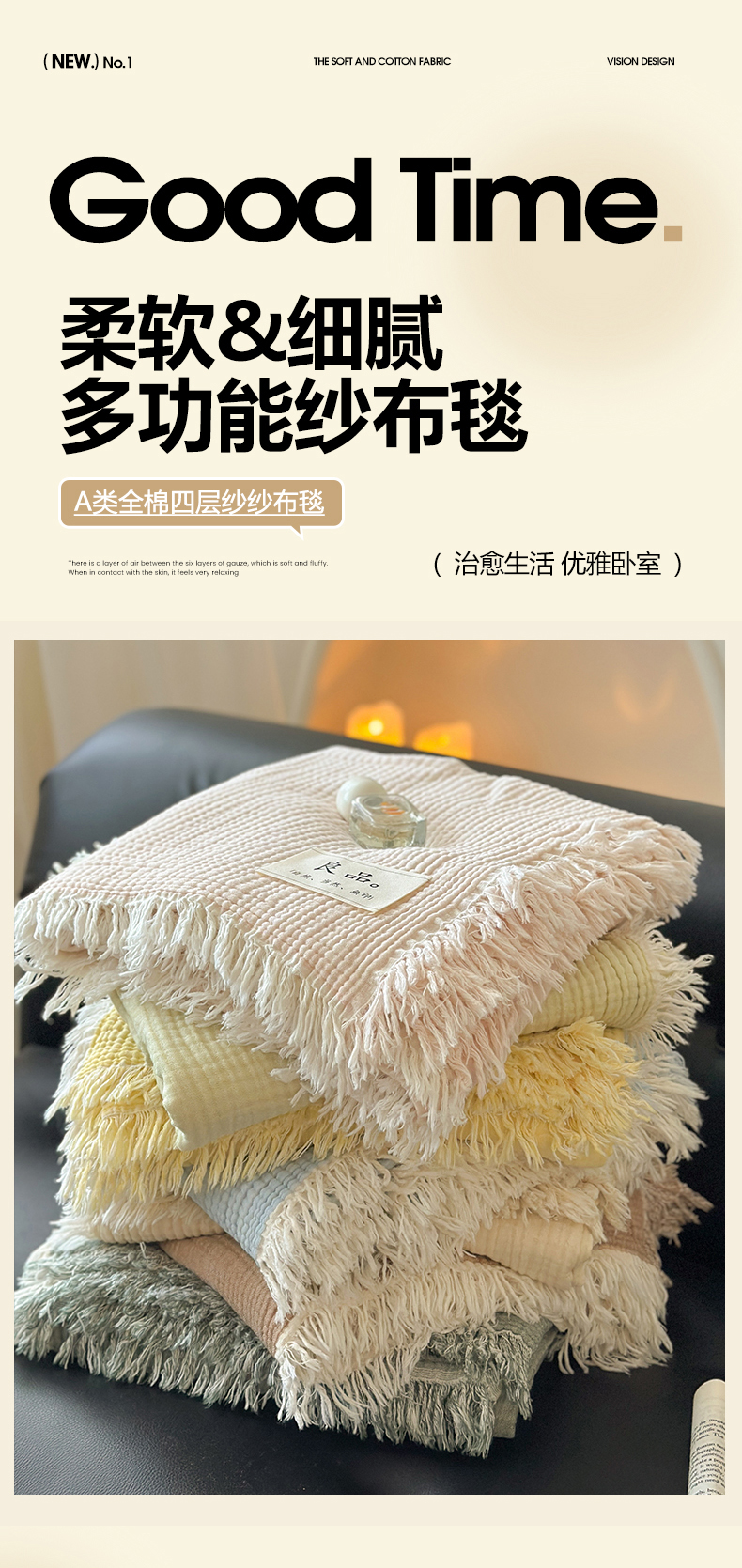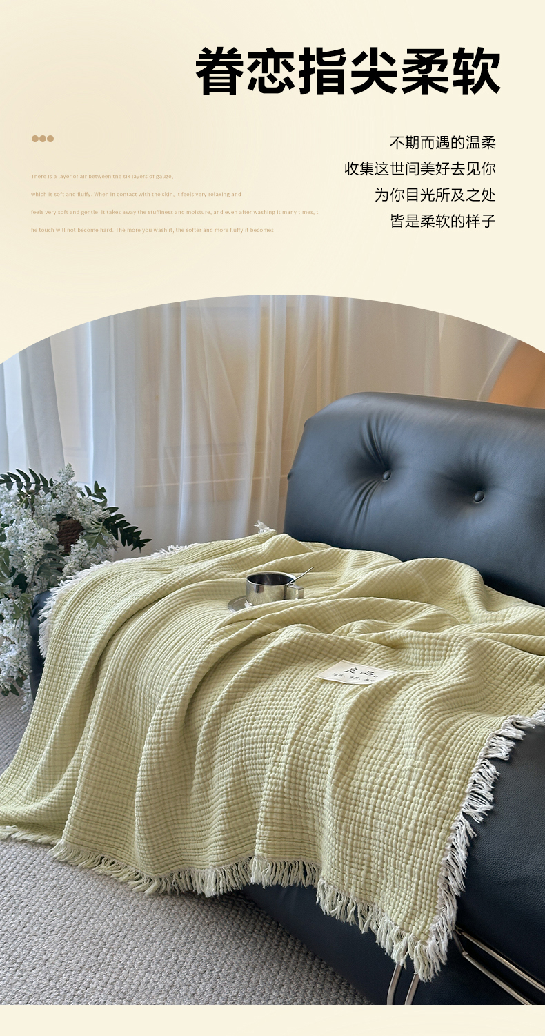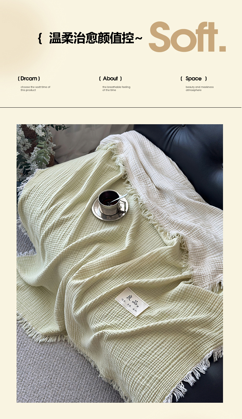 商品名称:吉象家纺 2025新款全棉纯棉四层纱流苏毯盖毯毯子 优雅-浅绿