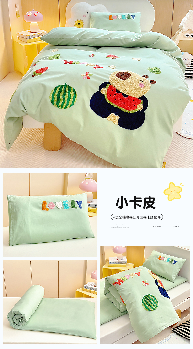 当前位置: 91家纺网 > 商品网购 > 婴童用品 > 婴童三件套 > 梵赫2025新款全棉A类5050磨毛卡通毛巾绣婴童套件幼儿园三件套 小卡皮