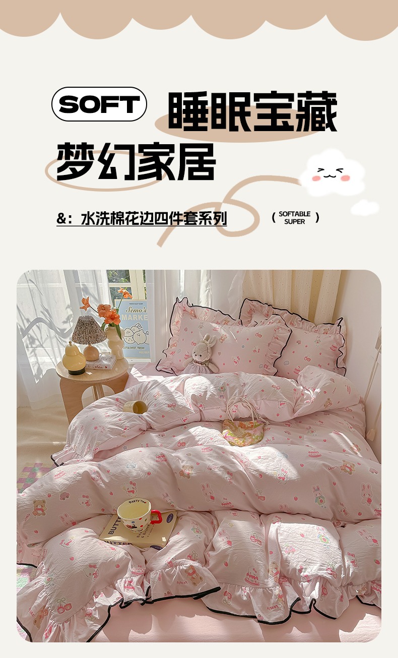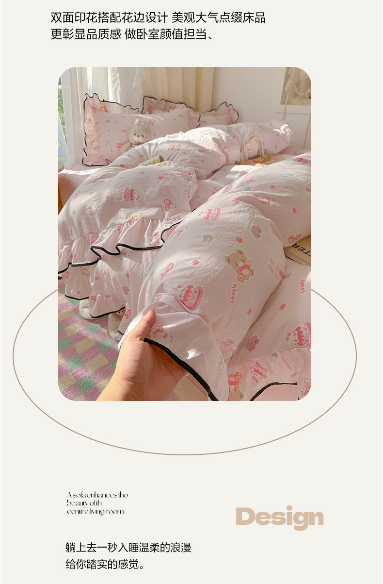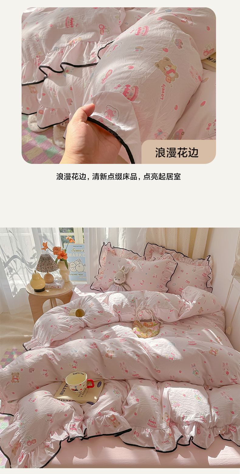 当前位置: 91家纺网 > 商品网购 > 床品套件 > 四件套 > 其它四件套 > 韩巢家纺 2025新款水洗棉大花边被套四件套直播热销款学生宿舍被罩床单三件套(提供卖家秀) 软糖猫【大花边款】