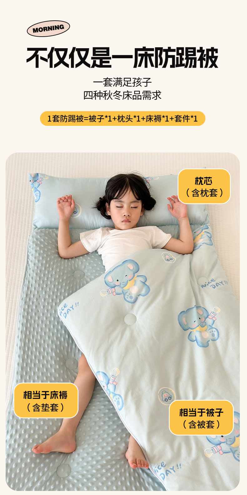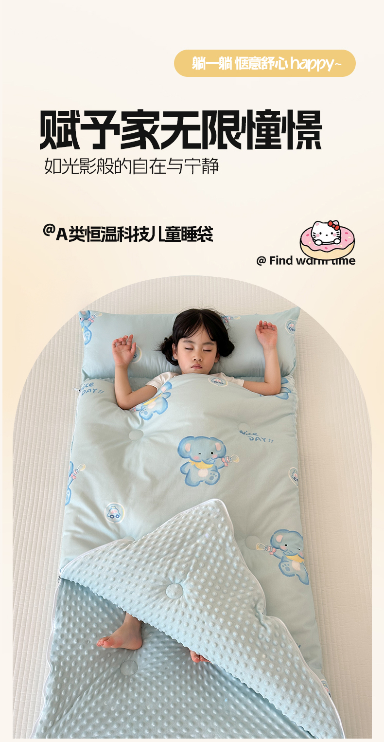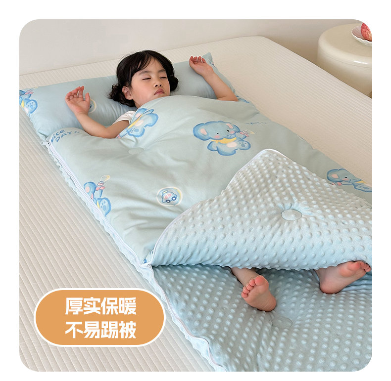 商品名称:嗨生活 2025秋冬加厚儿童睡袋全棉+豆豆绒一体防踢被儿童睡袋 快乐小象