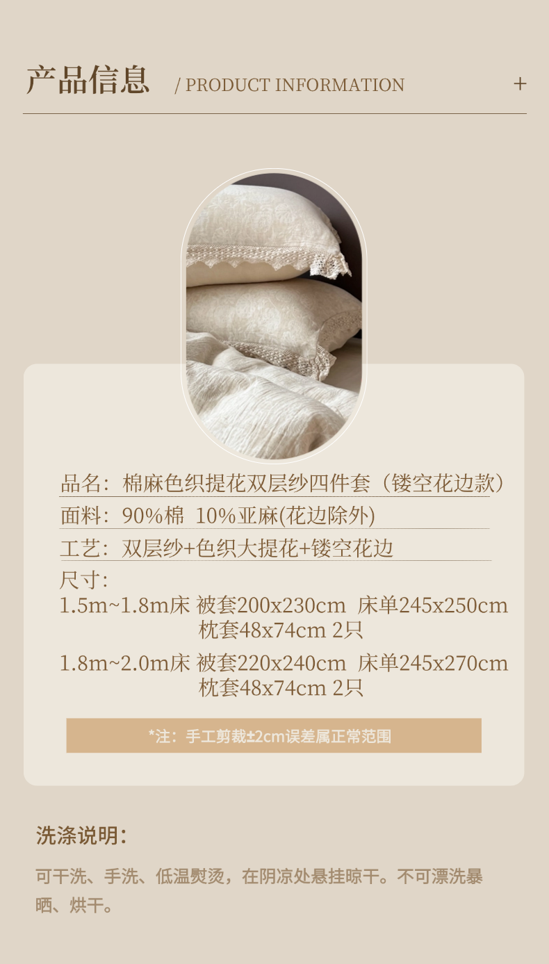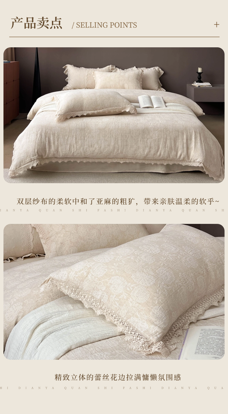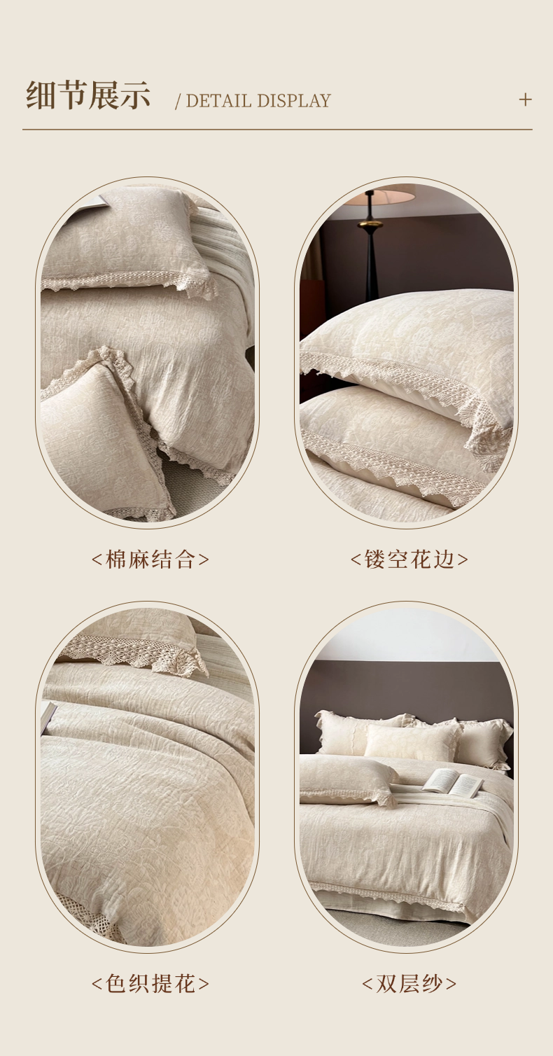 商品名称:贝尔 2025新款棉麻色织提花双层纱镂空花边款四件套 镂空花边-万物生