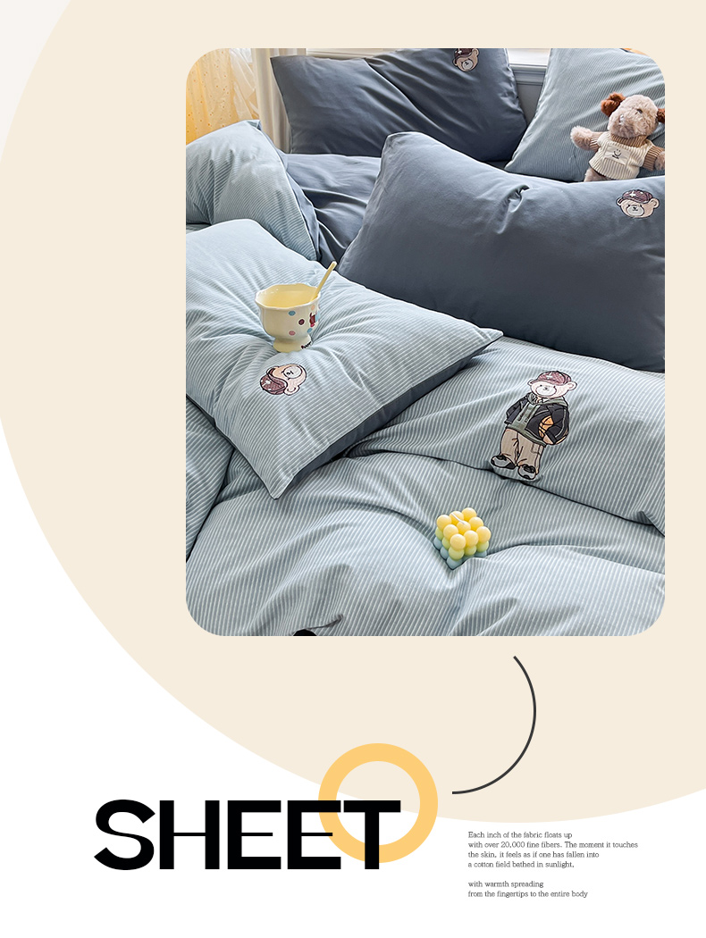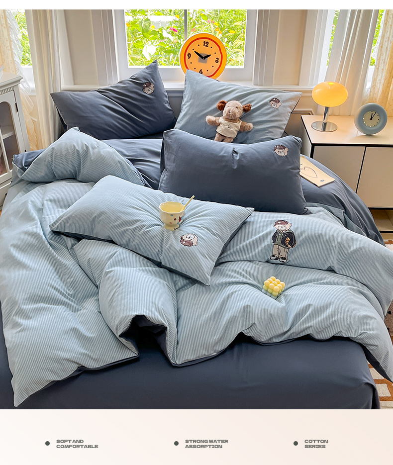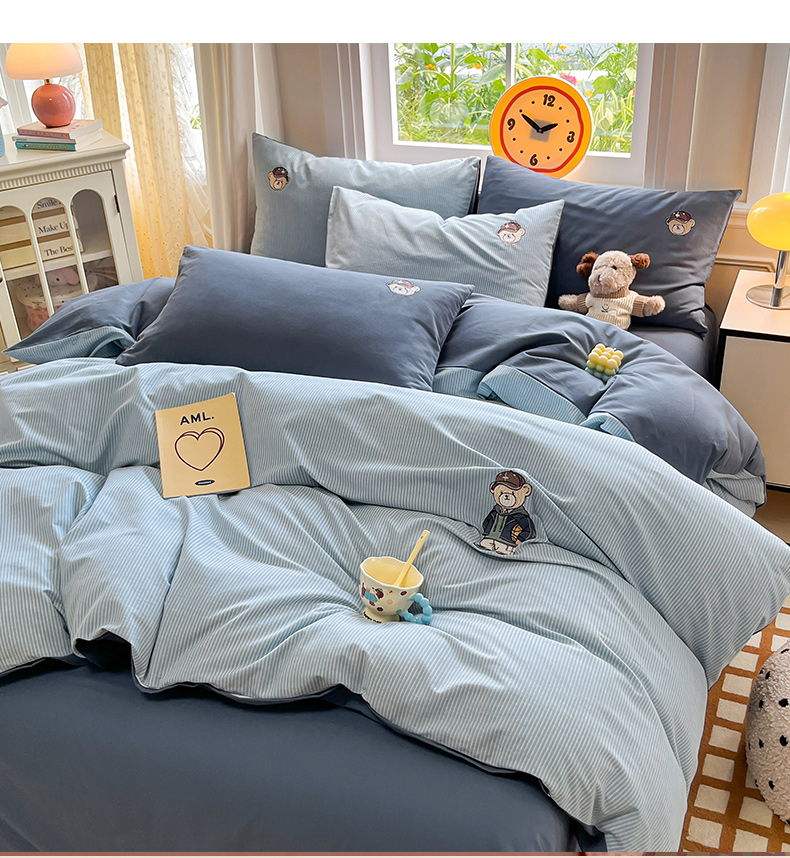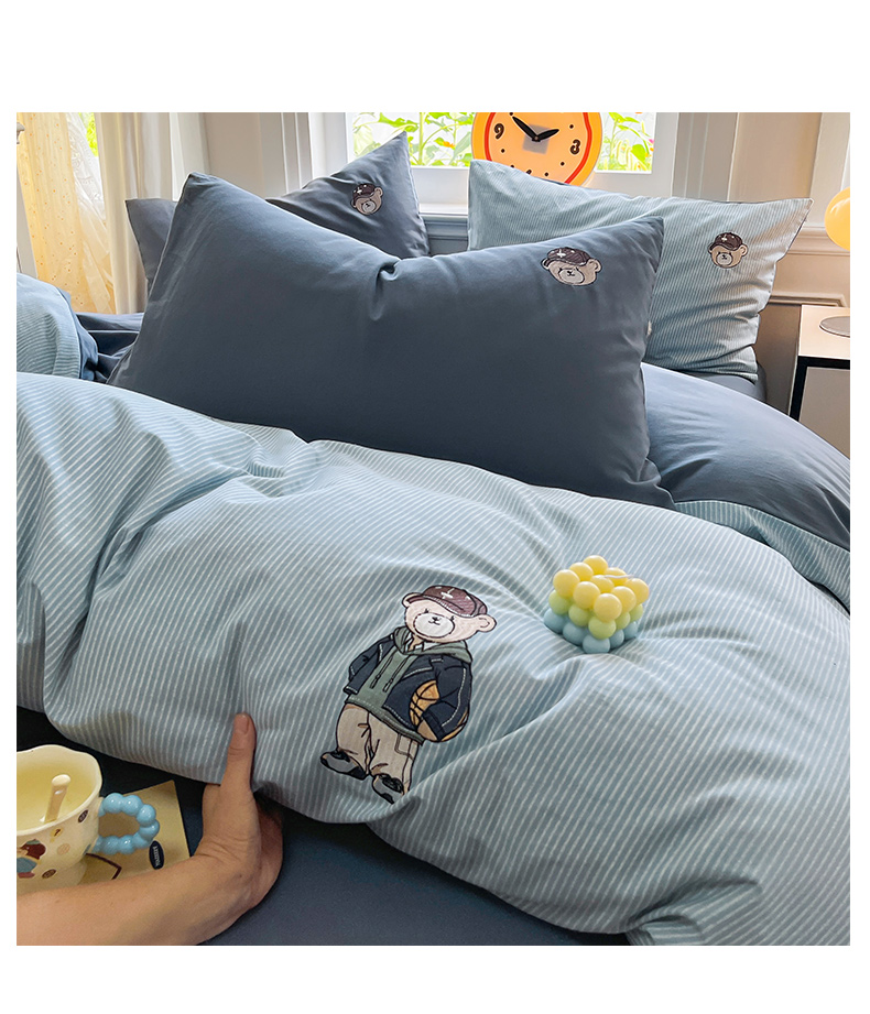 商品名称:大境 2025秋冬专版刺绣A类全棉磨毛四件套三件套 篮球小熊-蓝灰条