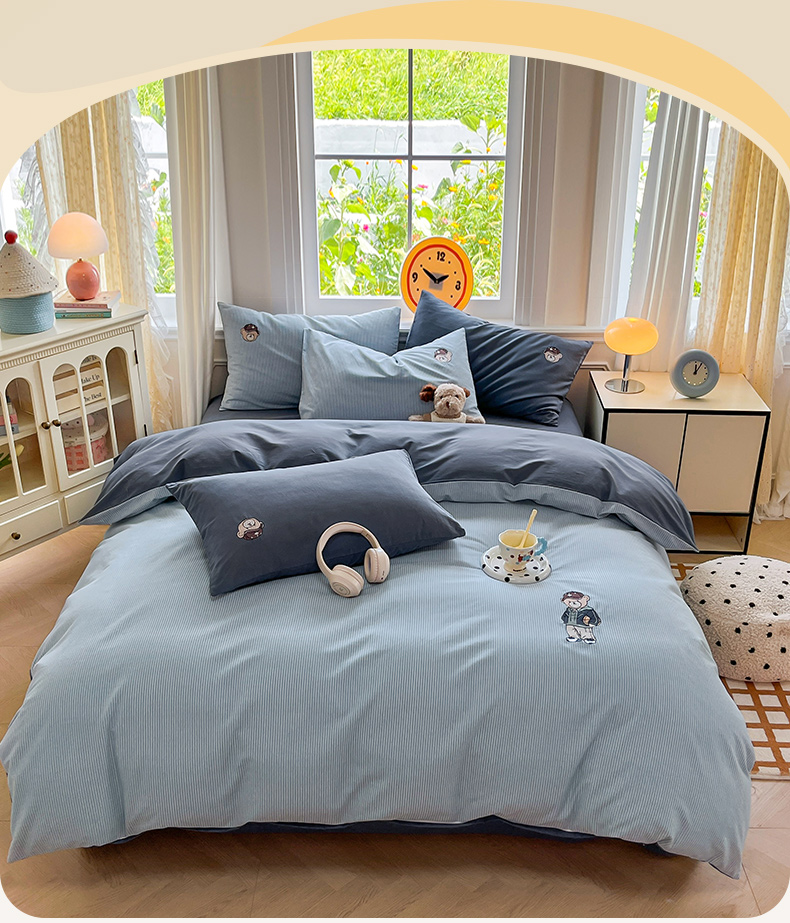 大境 2025秋冬专版刺绣A类全棉磨毛四件套三件套 篮球小熊-蓝灰条