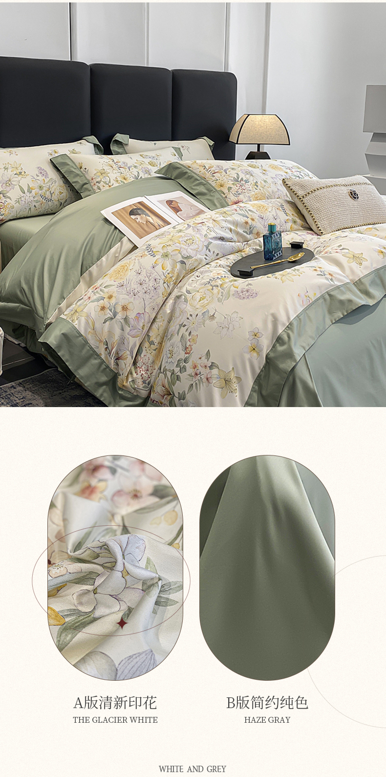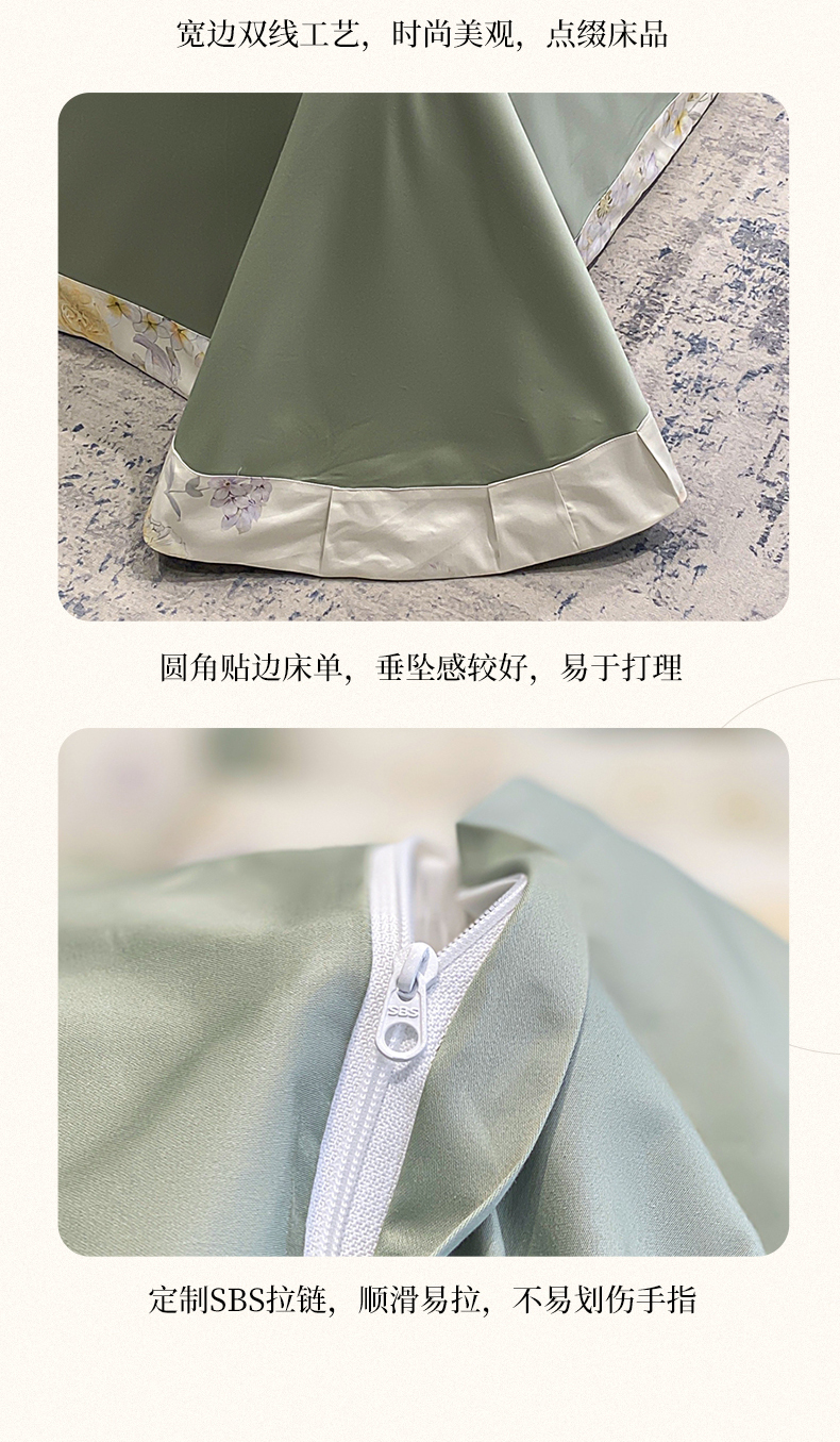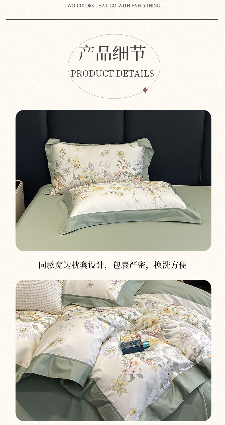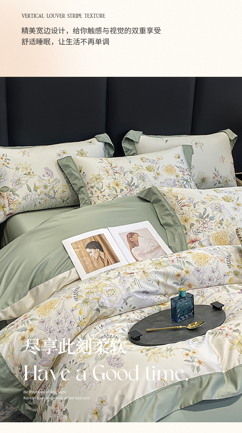 (总)娇逸家居 2025新款高克重A类数码印花牛奶绒双拼边款四件套,采薇灰,扶桑,浅影,秋灵粉,秋灵黄,秋灵绿,舜华粉,采薇米,舜华绿,仙客,栩蝶,璎珞,玉树,芸芙