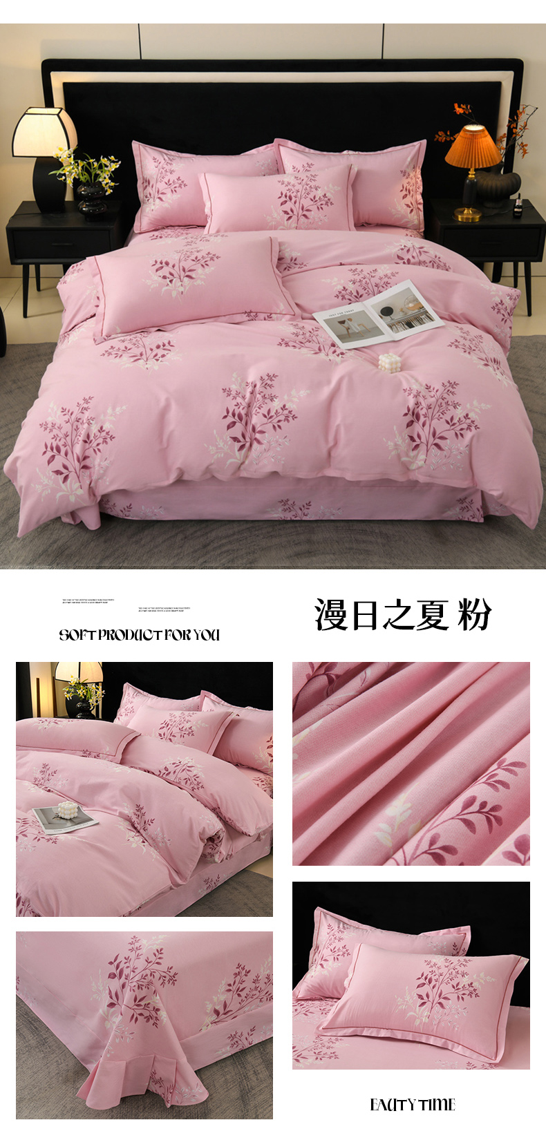 商品名称:润淳家居 2025新款百分百全棉磨毛四件套 漫日之夏 粉