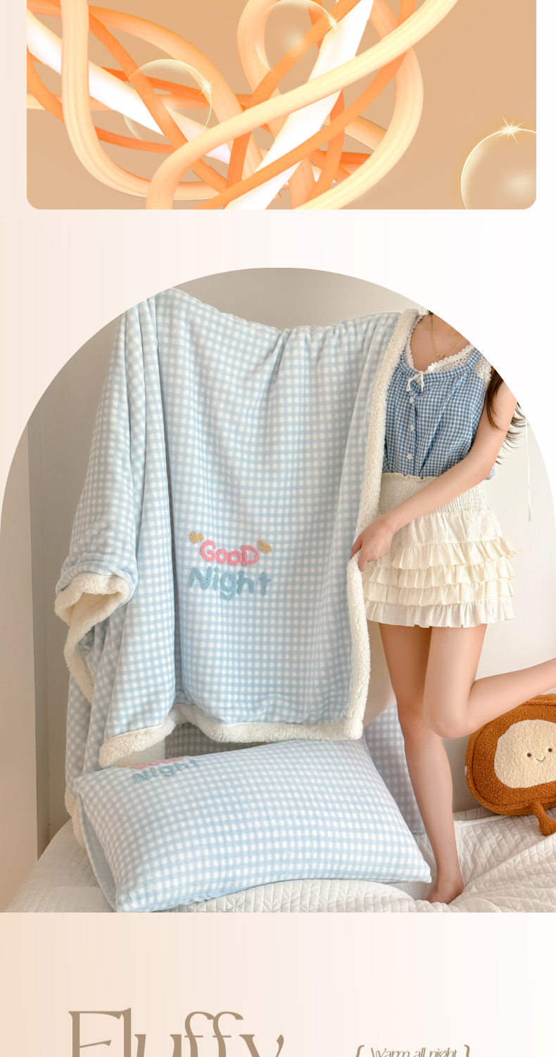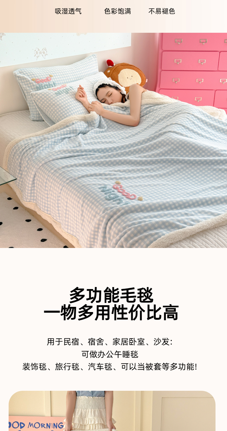商品名称:布柔 2025新款高克重加厚印花毛巾刺绣牛奶绒羊羔绒盖毯双层毛毯午休毯卡通多功能沙发毯子 泡芙蓝盖毯
