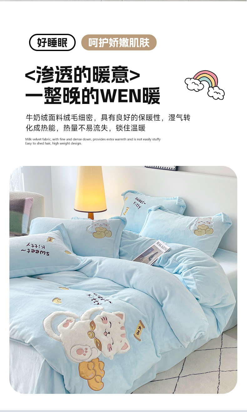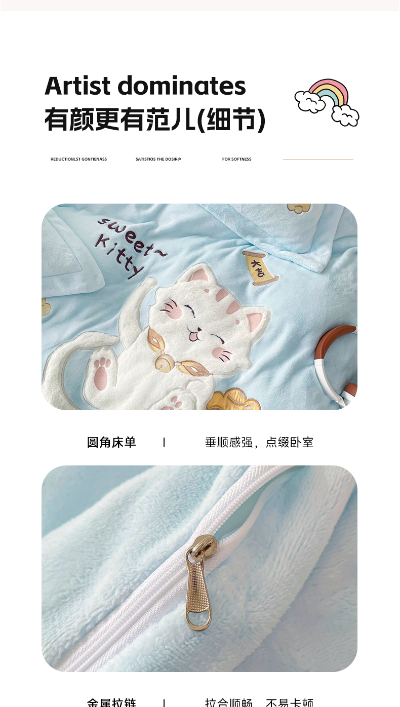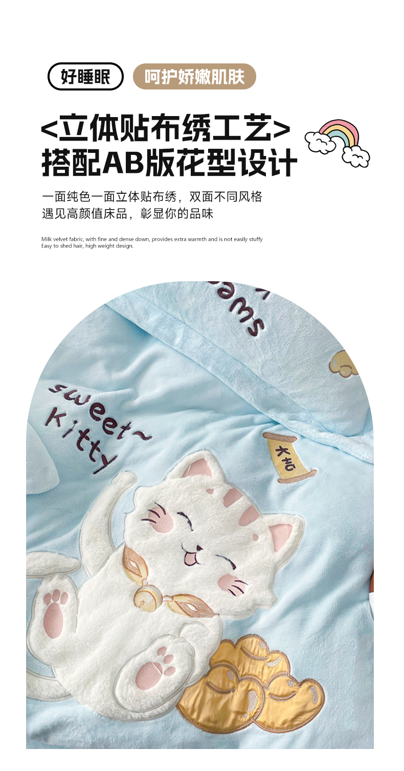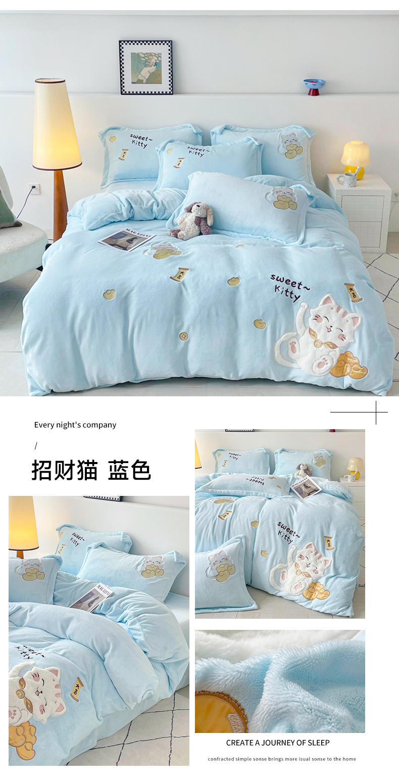 商品名称:金绣美居 2025新款卡通贴布绣款牛奶绒四件套-招财猫 招财猫-蓝