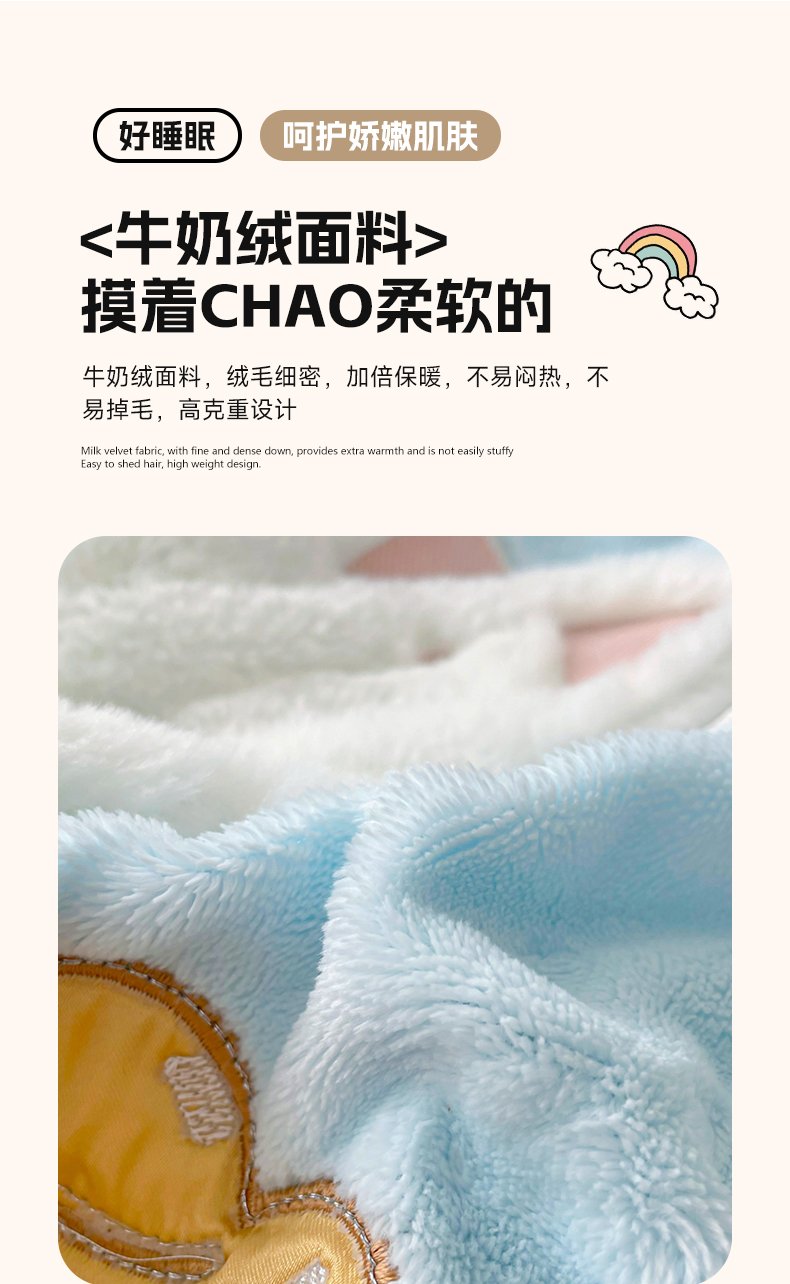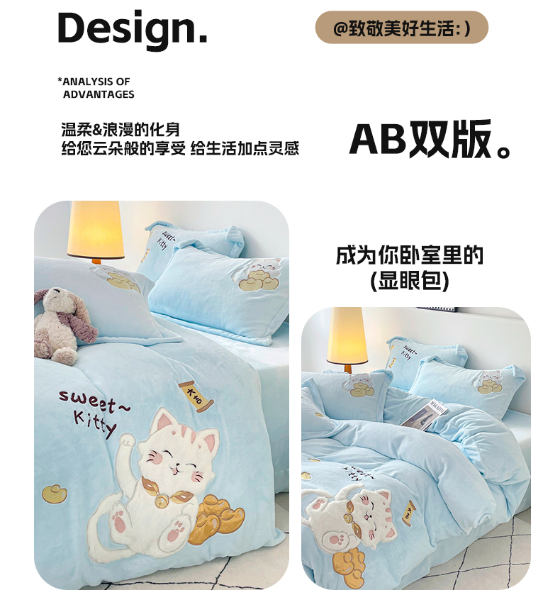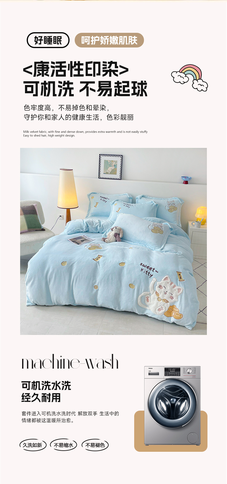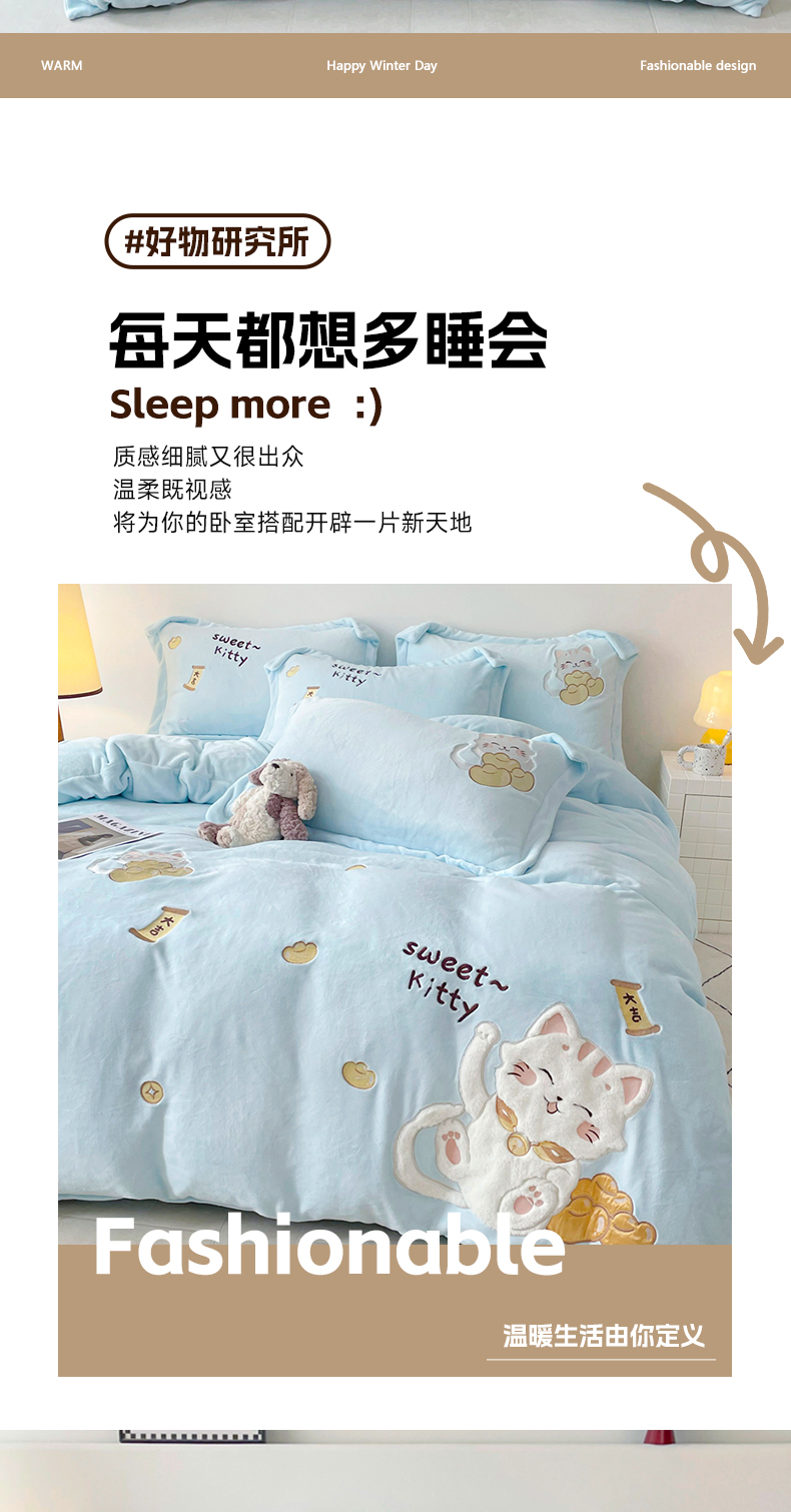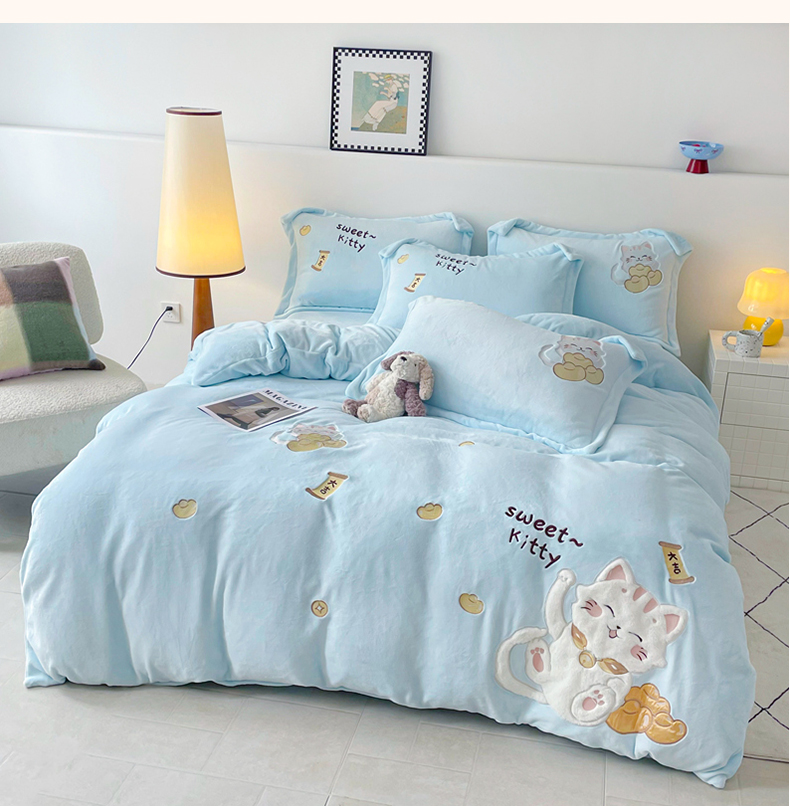 商品名称:金绣美居 2025新款卡通贴布绣款牛奶绒四件套-招财猫 招财猫-蓝