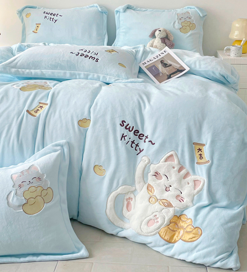 (总)金绣美居 2025新款卡通贴布绣款牛奶绒四件套-招财猫,招财猫-蓝,招财猫-粉