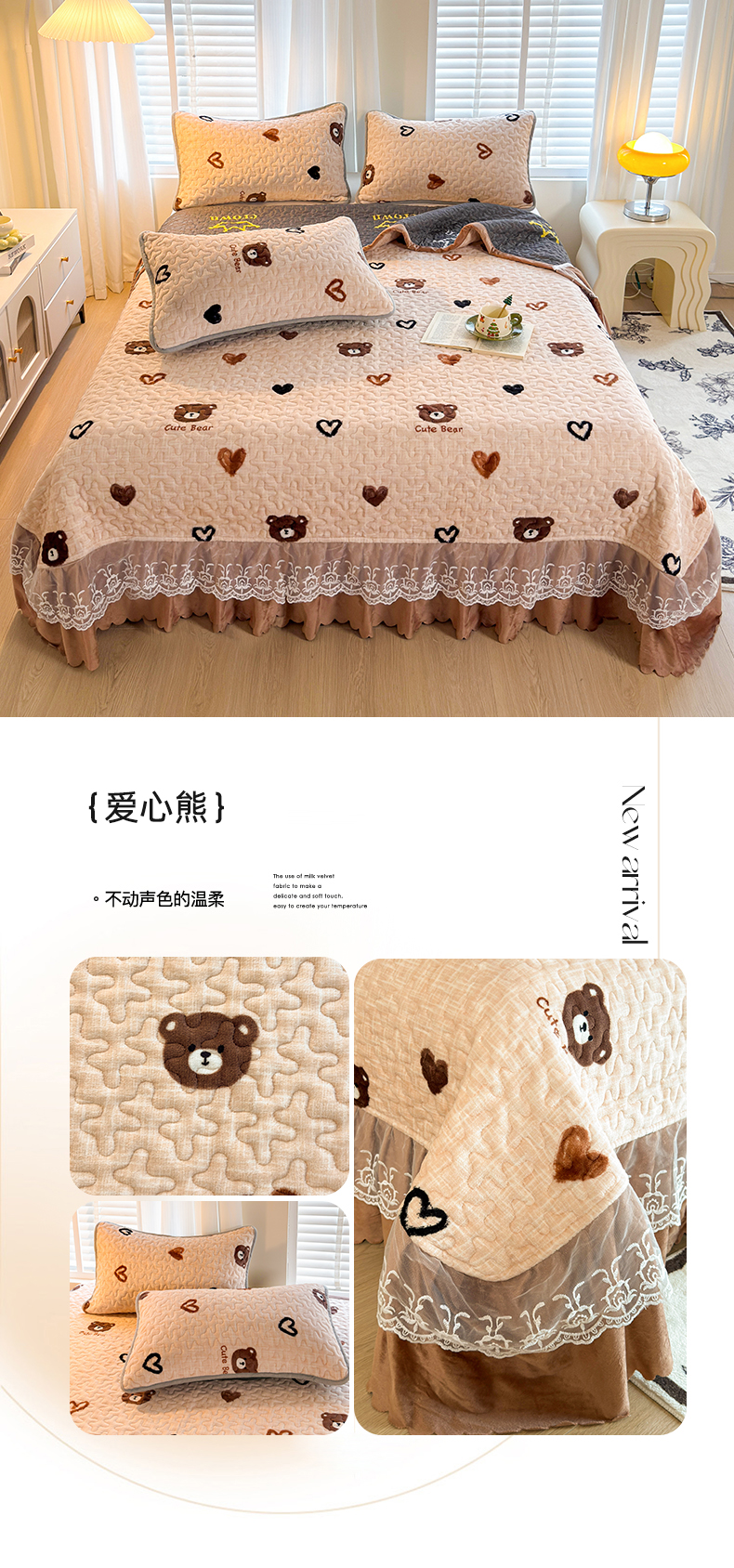 梓依家纺 2025新款牛奶绒单床裙款蕾丝床盖三件套四件套 爱心熊