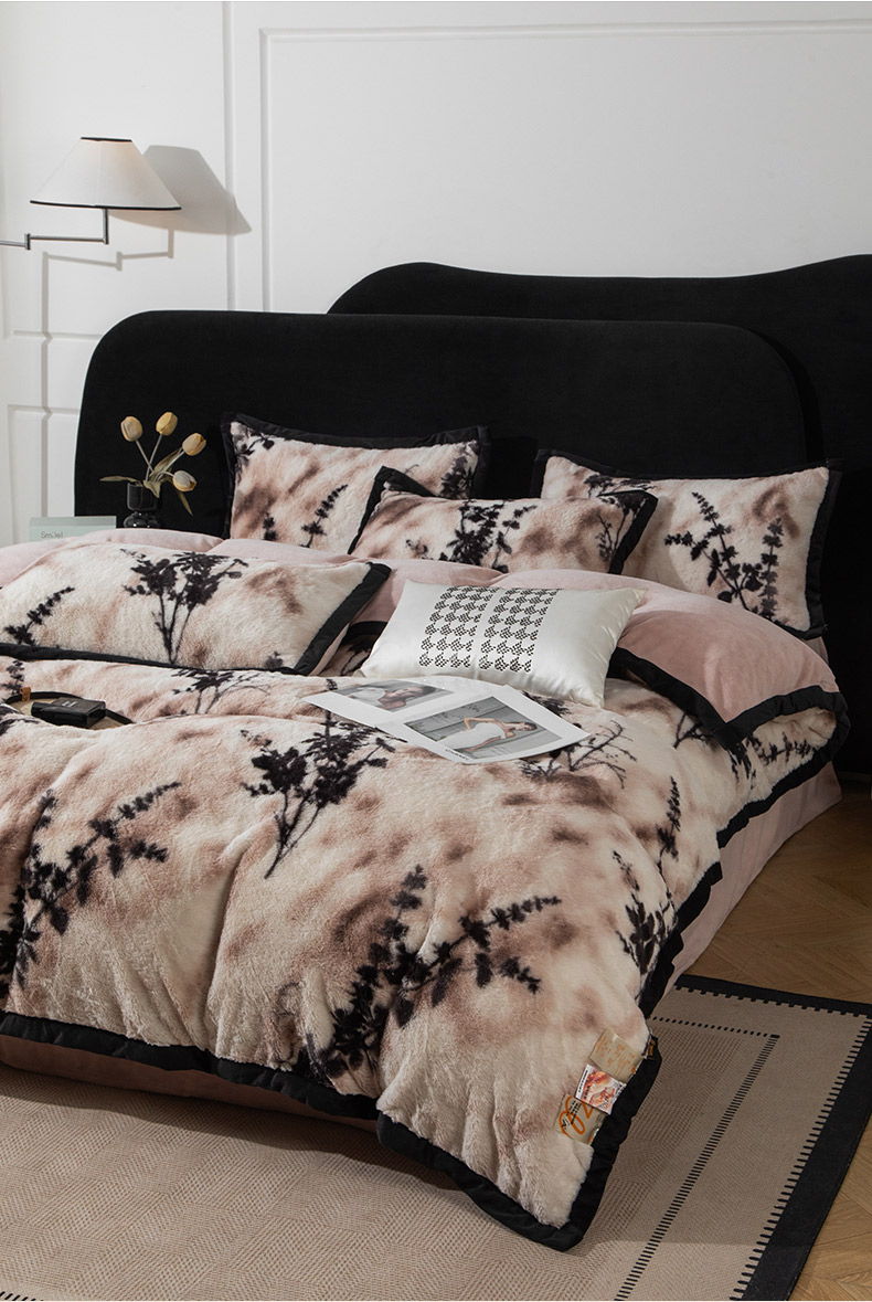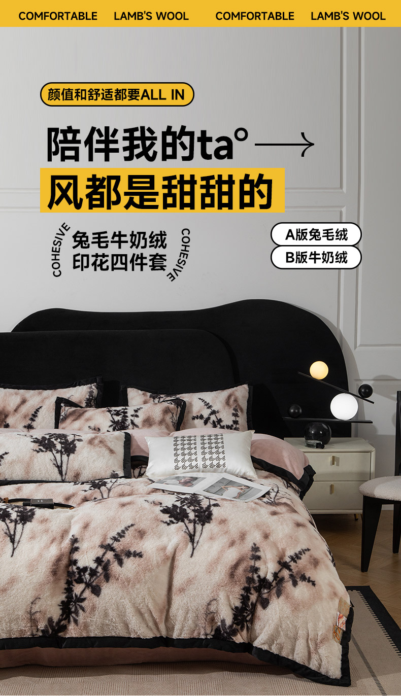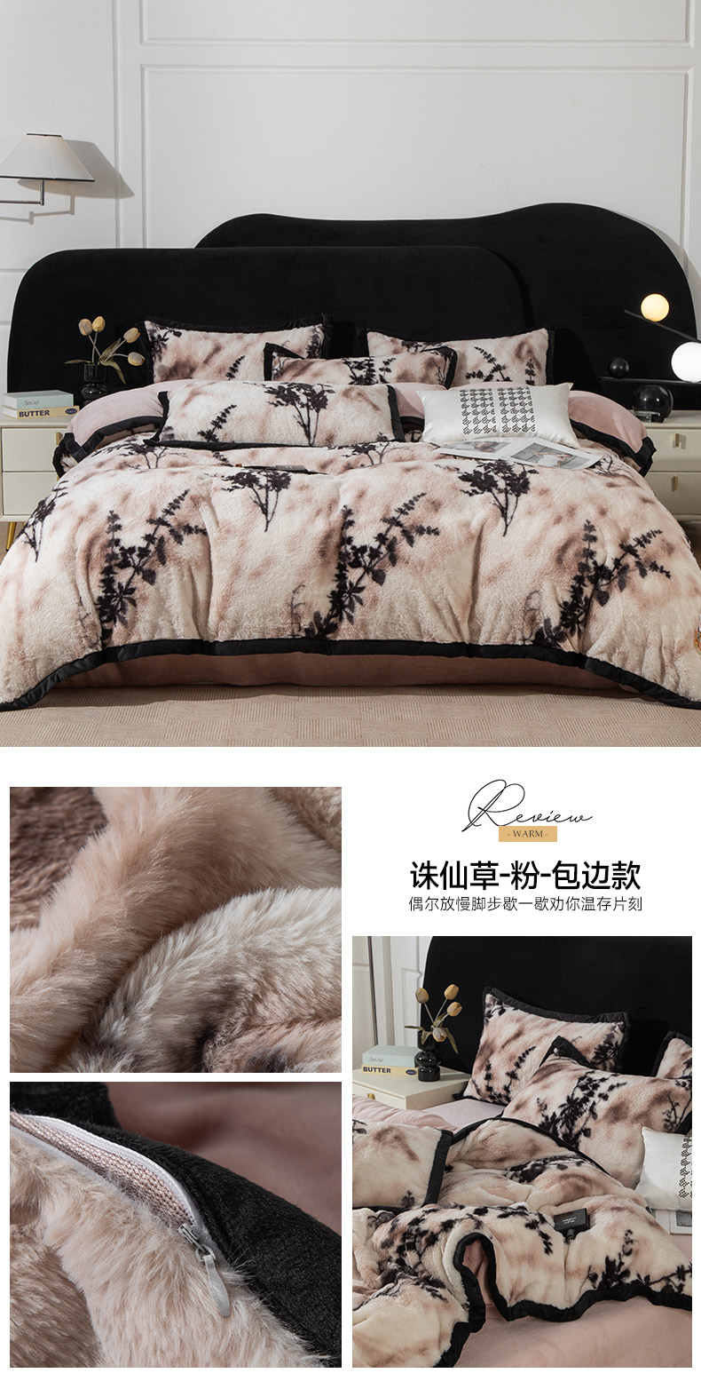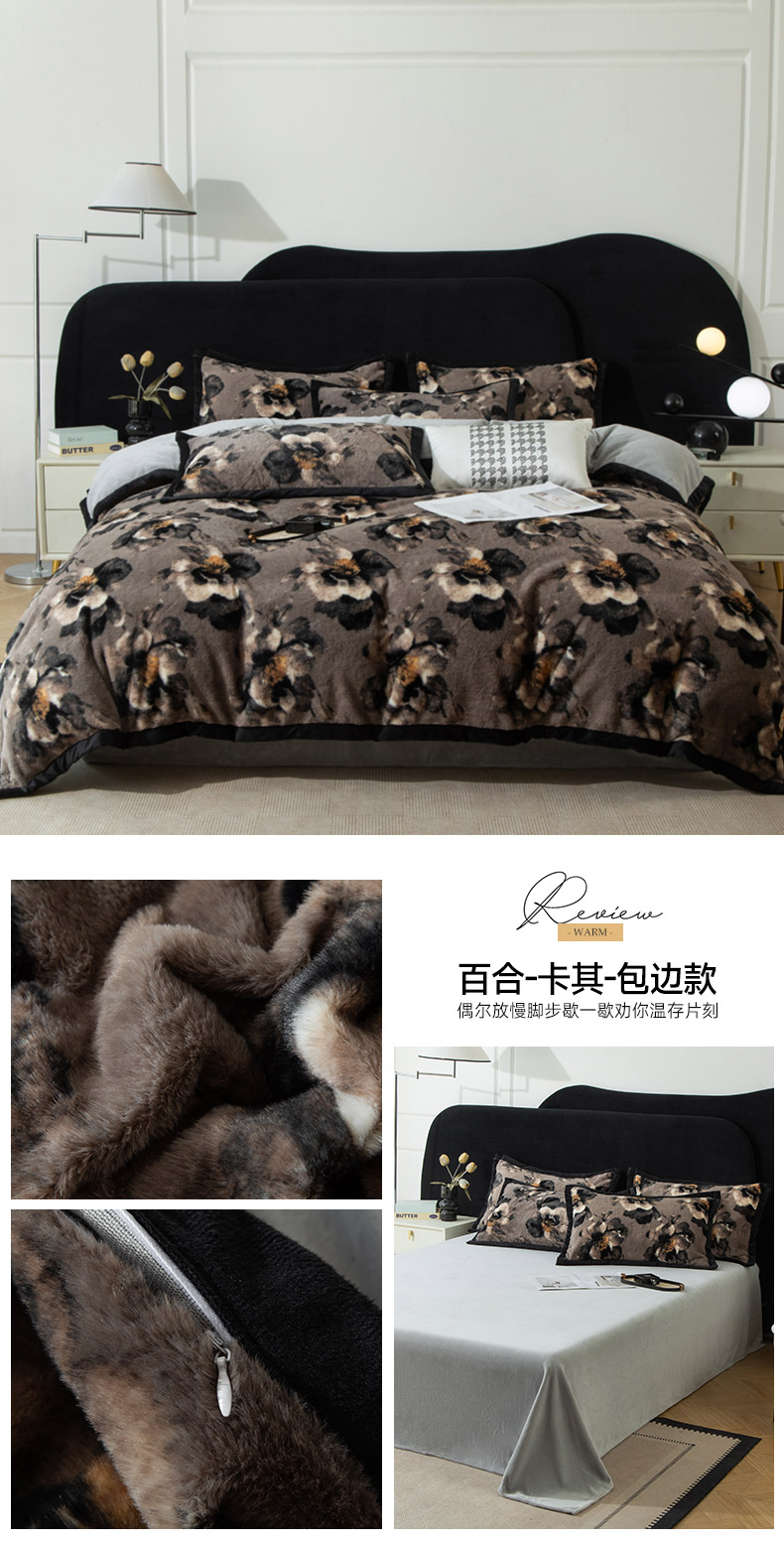 (总)库里梦家纺 2025网红直播热款10公分包边兔毛牛奶绒印花四件套-包边款,百合-卡其-包边款,黑玫瑰-咖-包边款,黑玫瑰-卡其-包边款,蝴蝶梦-灰-包边款,蝴蝶梦-咖-包边款,诛仙草-粉-包边款