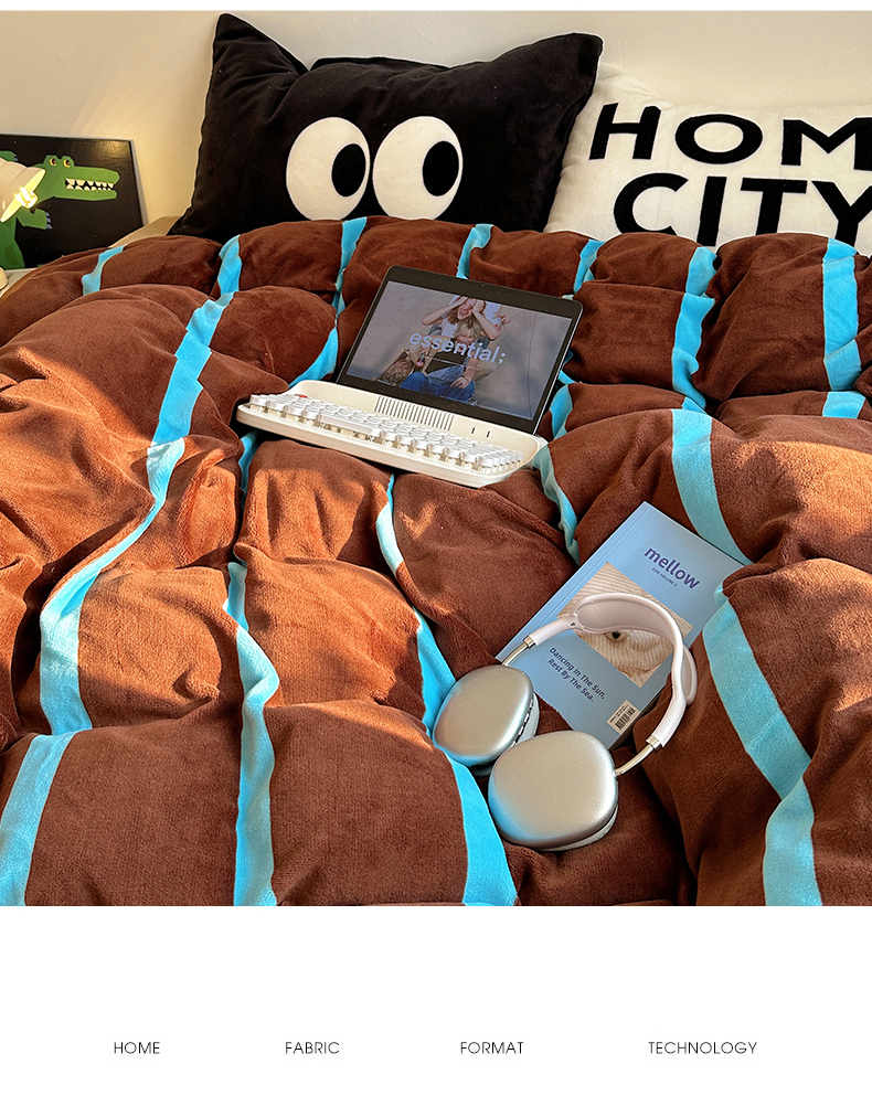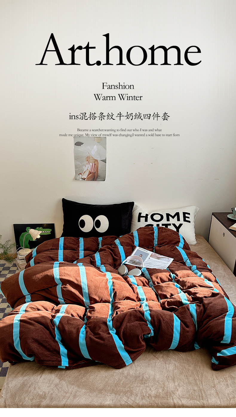 蜜宿 2025新款大眼睛混搭条纹牛奶绒四件套(小号三件套枕套默认发黑色大眼睛款!!也可以调换字母款枕套!!) 绒-ins星蓝条
