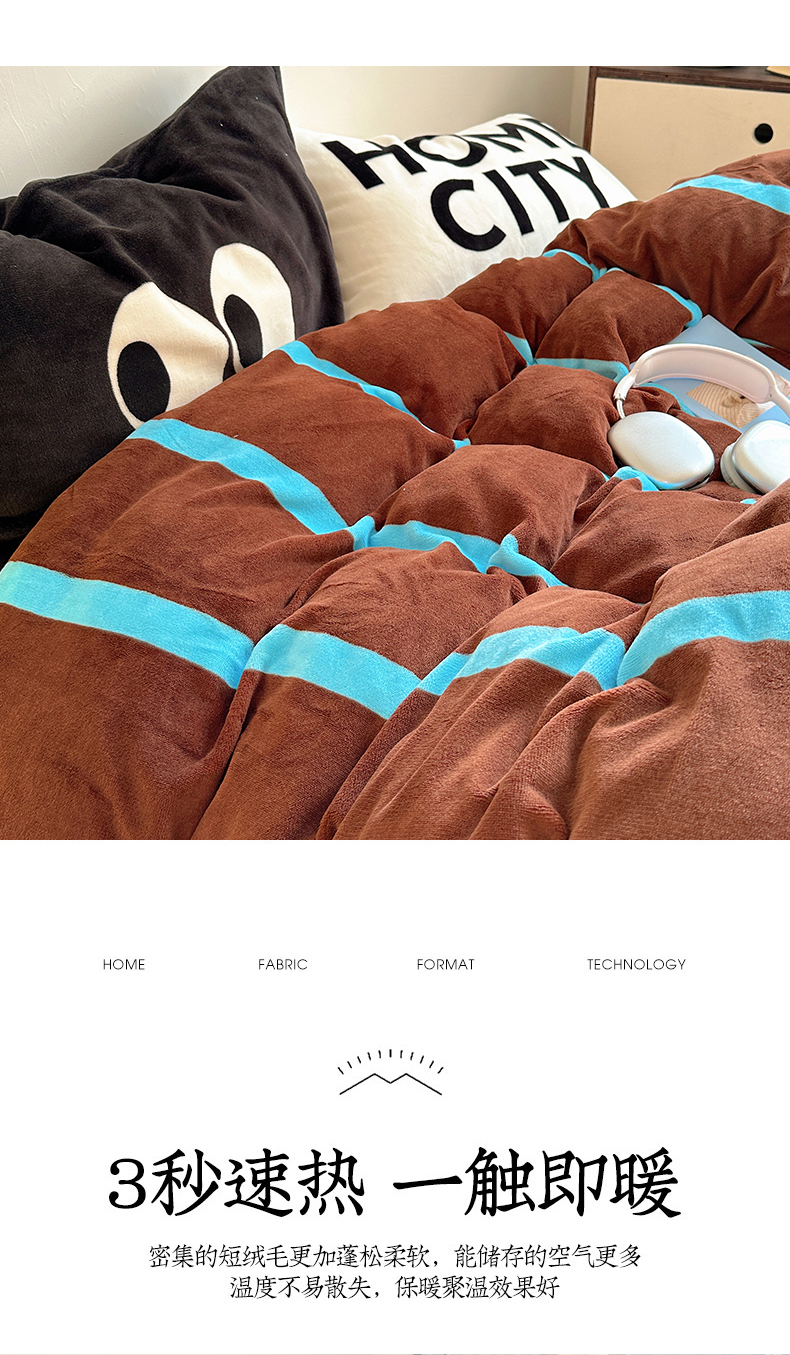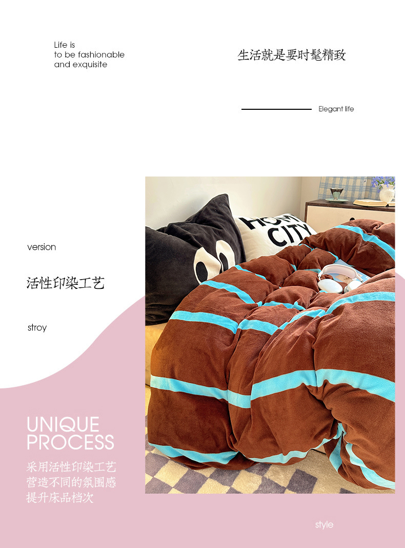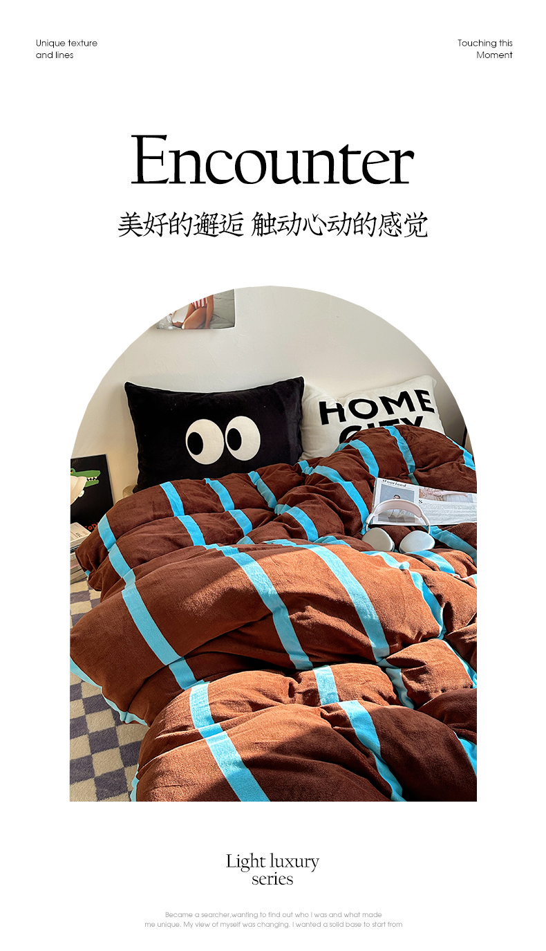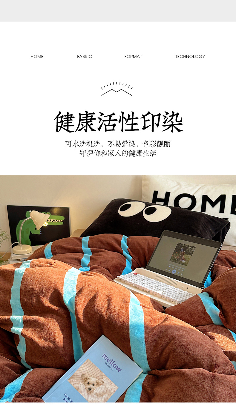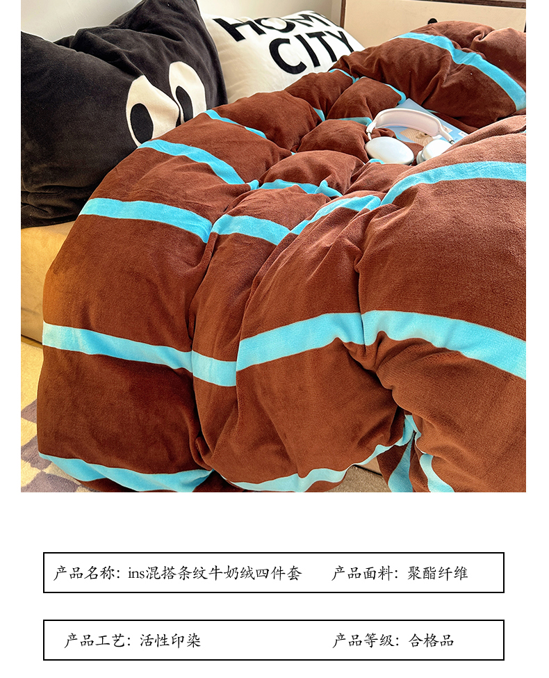 商品名称:蜜宿 2025新款大眼睛混搭条纹牛奶绒四件套(小号三件套枕套默认发黑色大眼睛款!!也可以调换字母款枕套!!) 绒-ins星蓝条