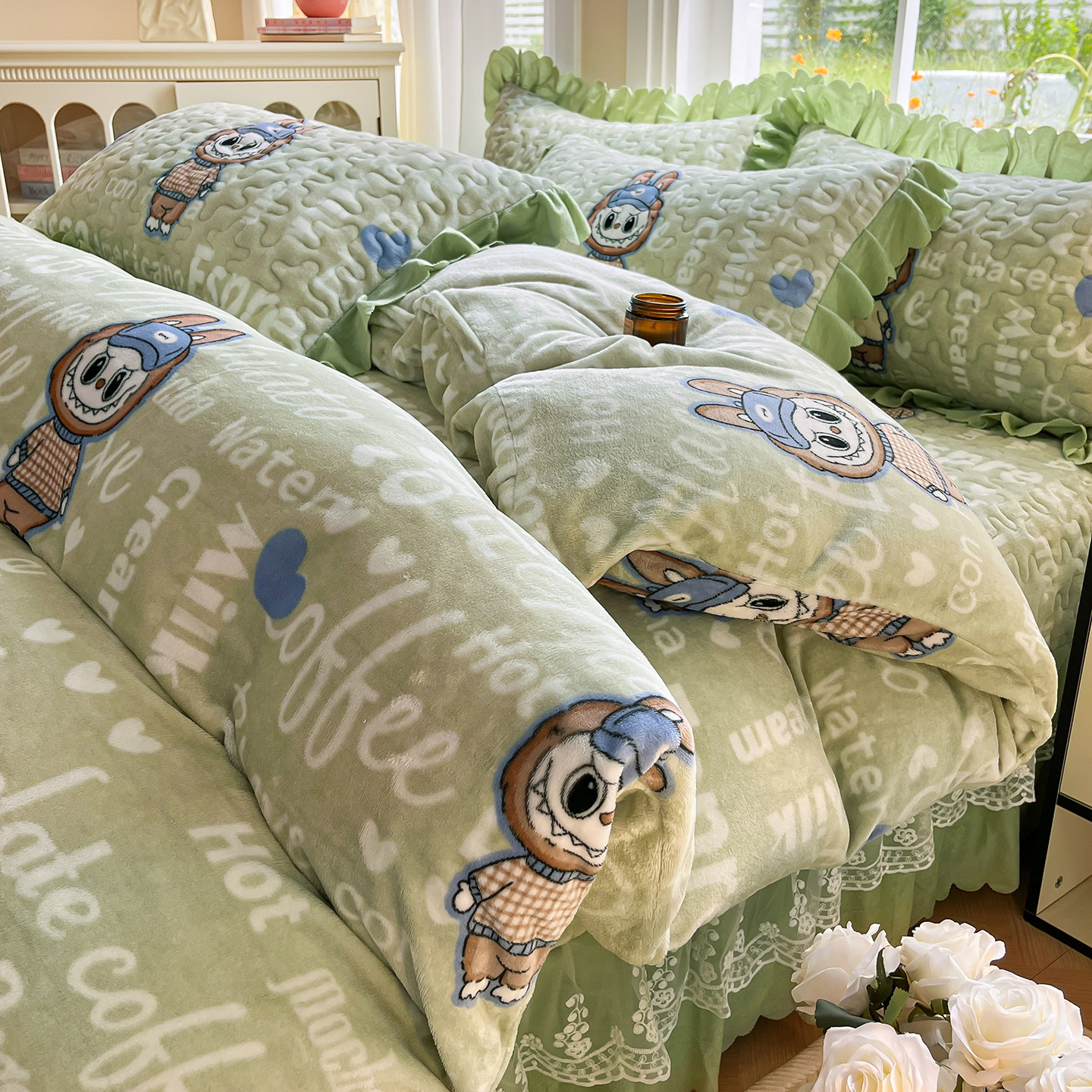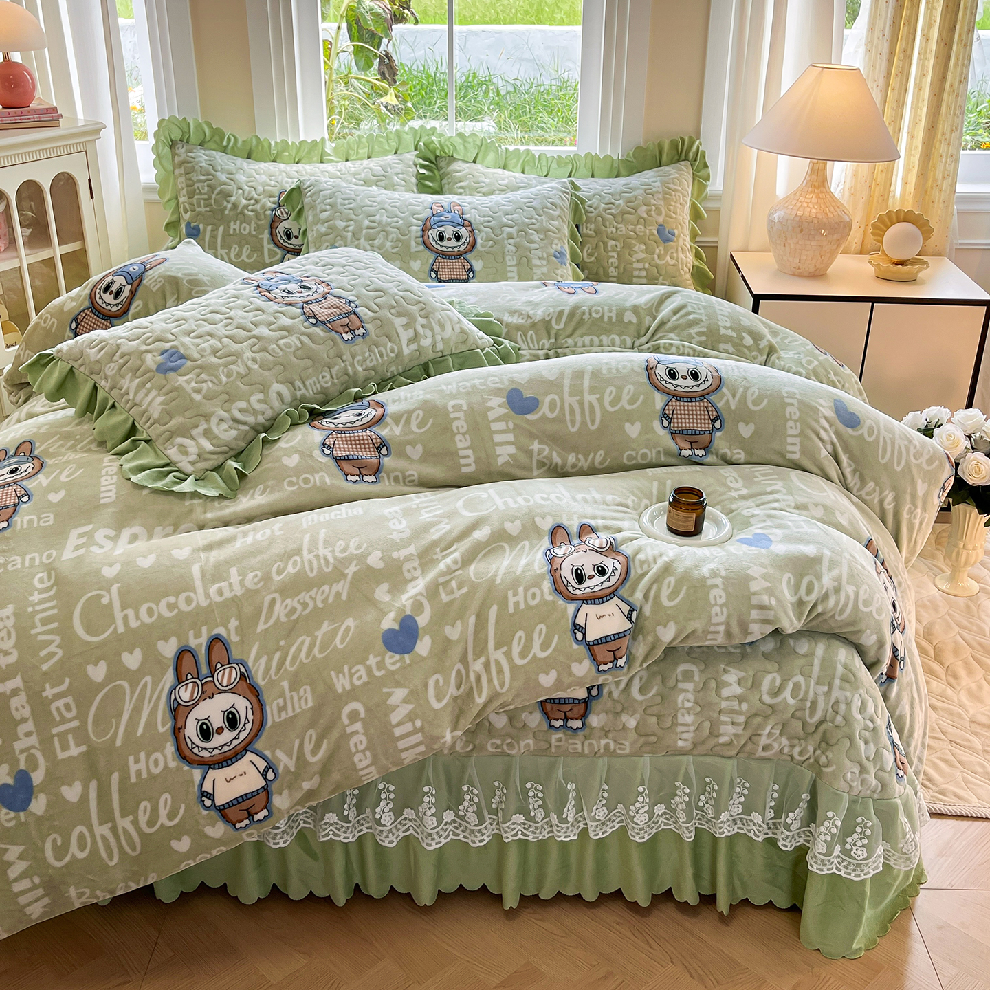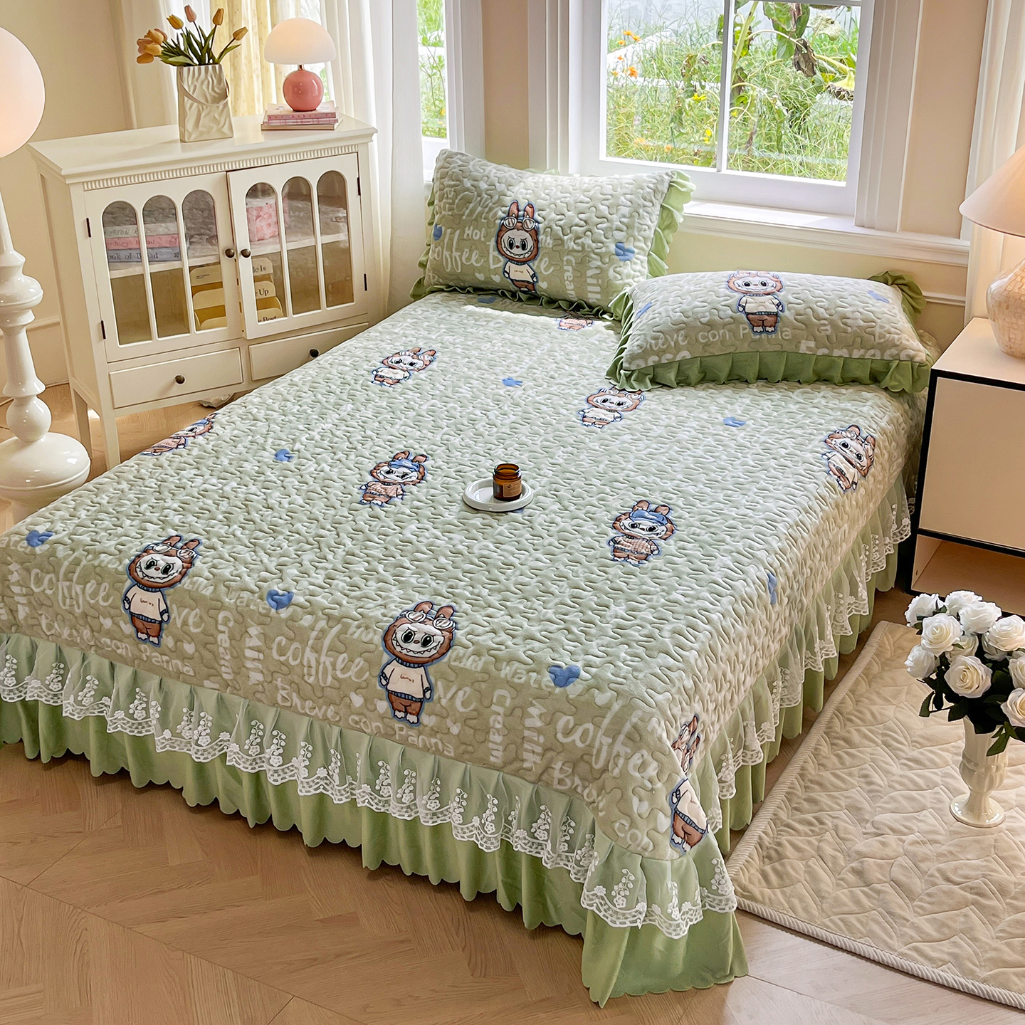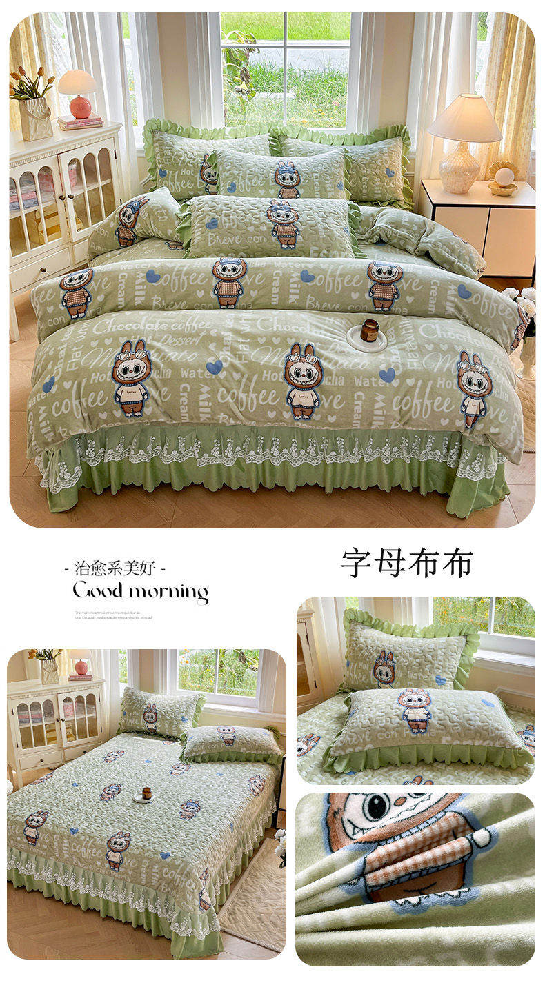当前位置: 91家纺网 > 商品网购 > 床品套件 > 四件套 > 牛奶绒四件套 > 提花大世界 2025新款爆款高克重牛奶绒印花夹棉蕾丝花边床盖床三件四件套 字母布布