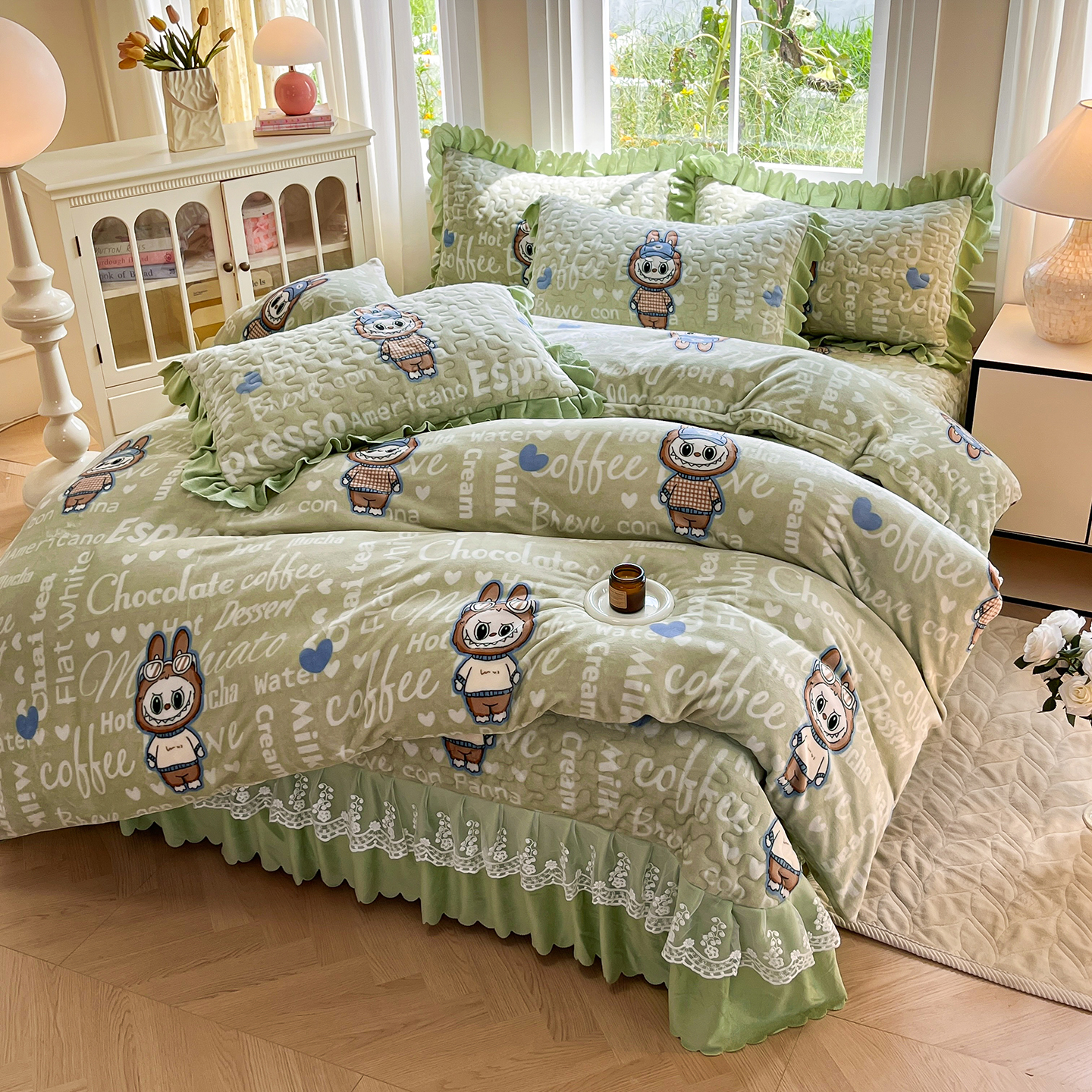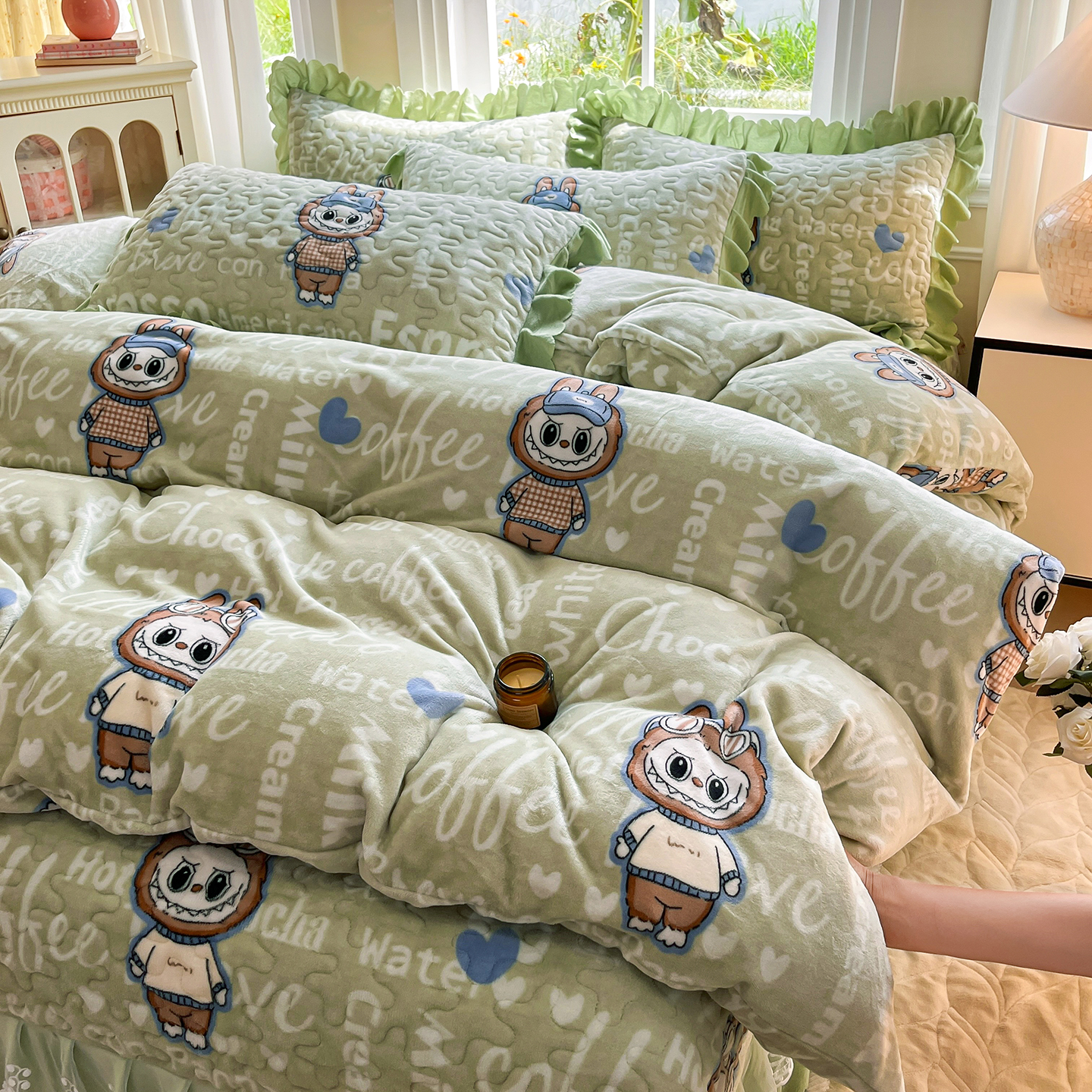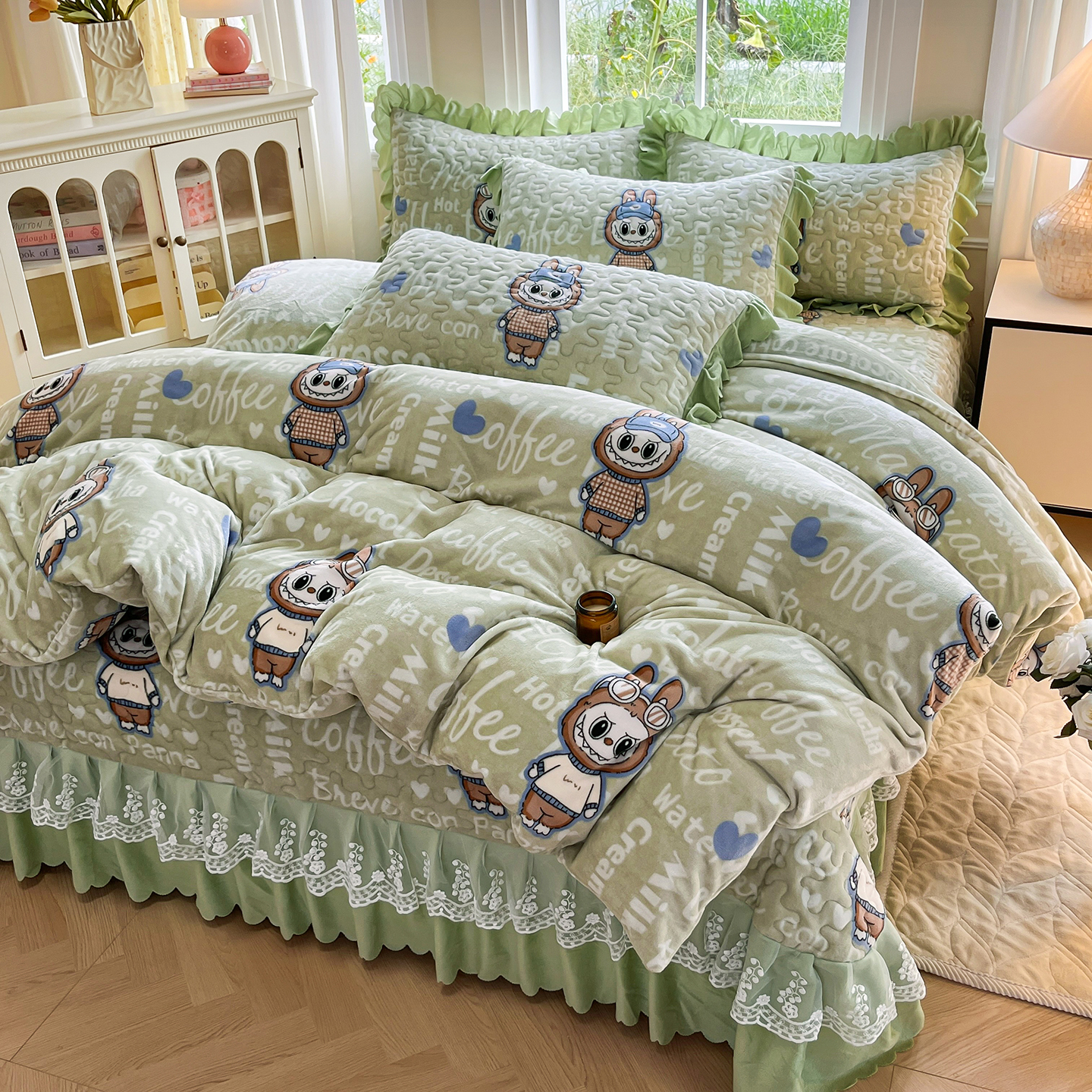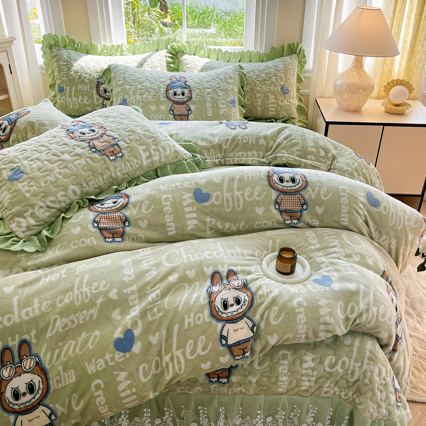 当前位置: 91家纺网 > 商品网购 > 床品套件 > 四件套 > 牛奶绒四件套 > 提花大世界 2025新款爆款高克重牛奶绒印花夹棉蕾丝花边床盖床三件四件套 字母布布