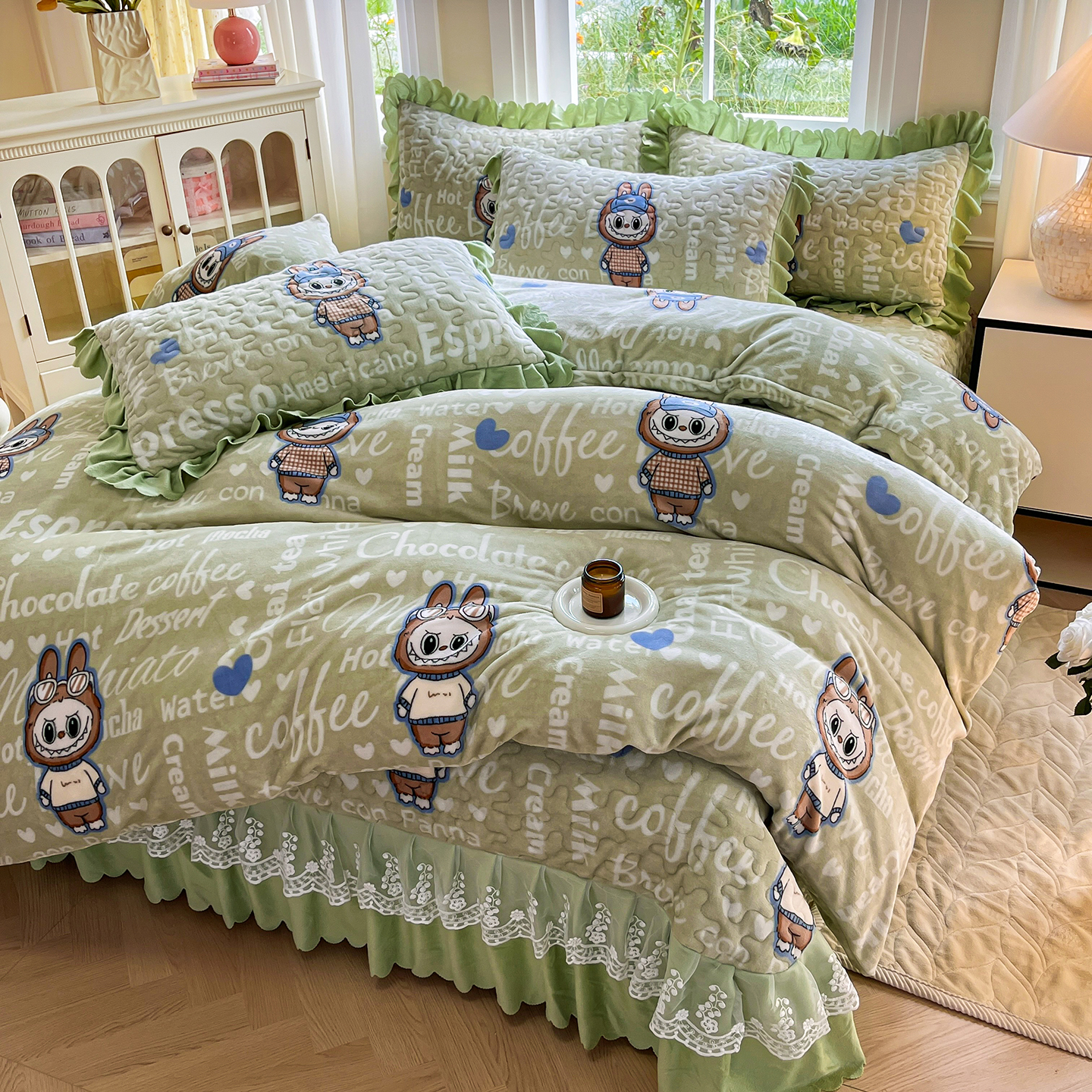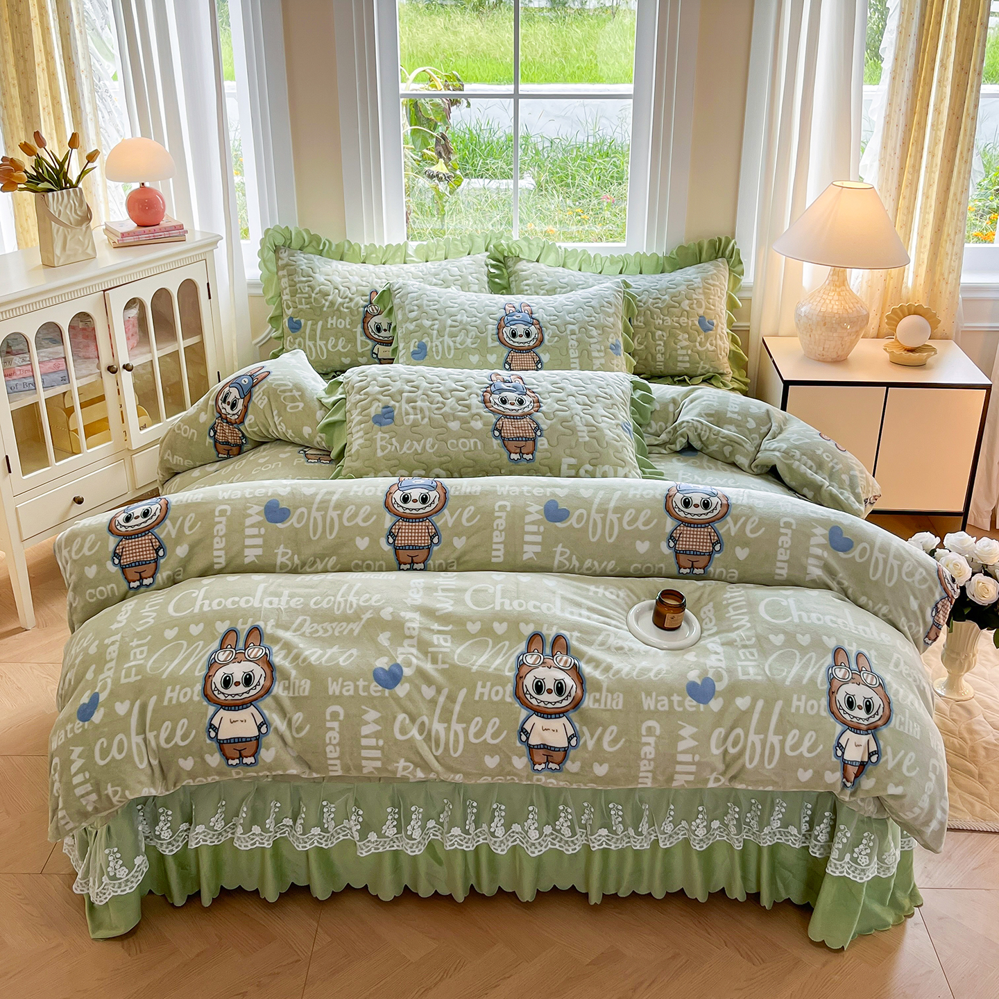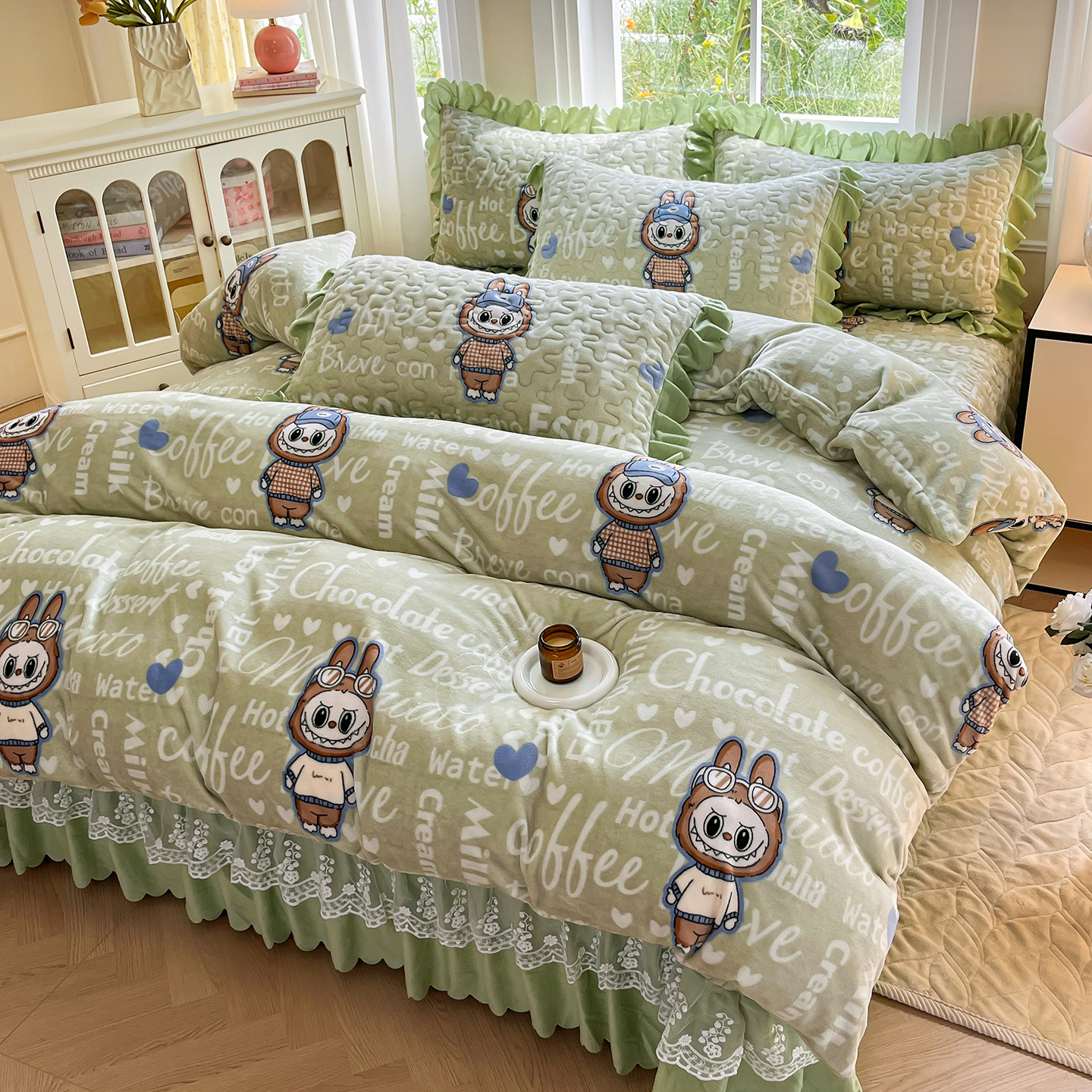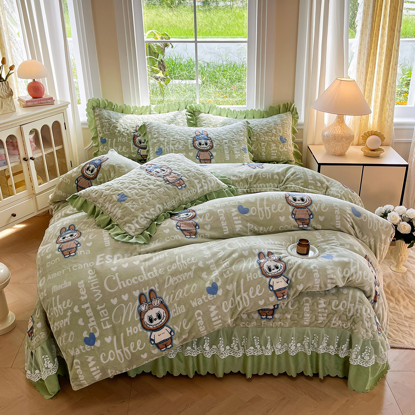 当前位置: 91家纺网 > 商品网购 > 床品套件 > 四件套 > 牛奶绒四件套 > 提花大世界 2025新款爆款高克重牛奶绒印花夹棉蕾丝花边床盖床三件四件套 字母布布