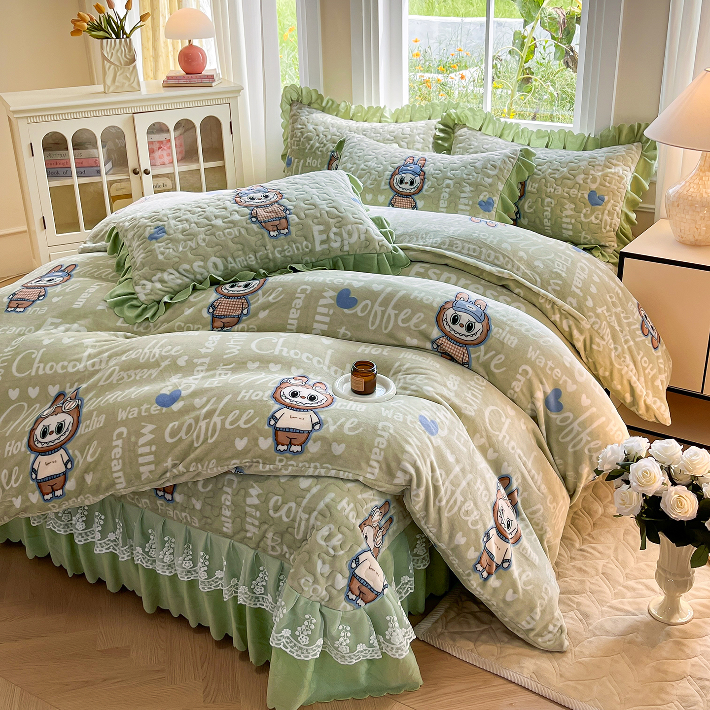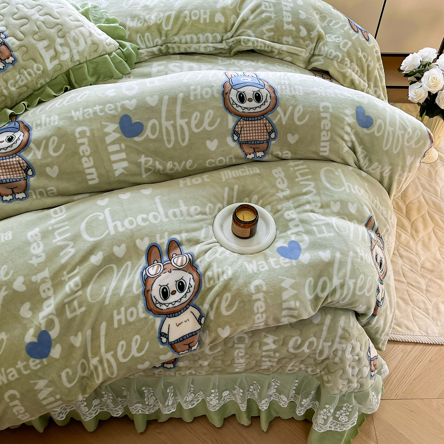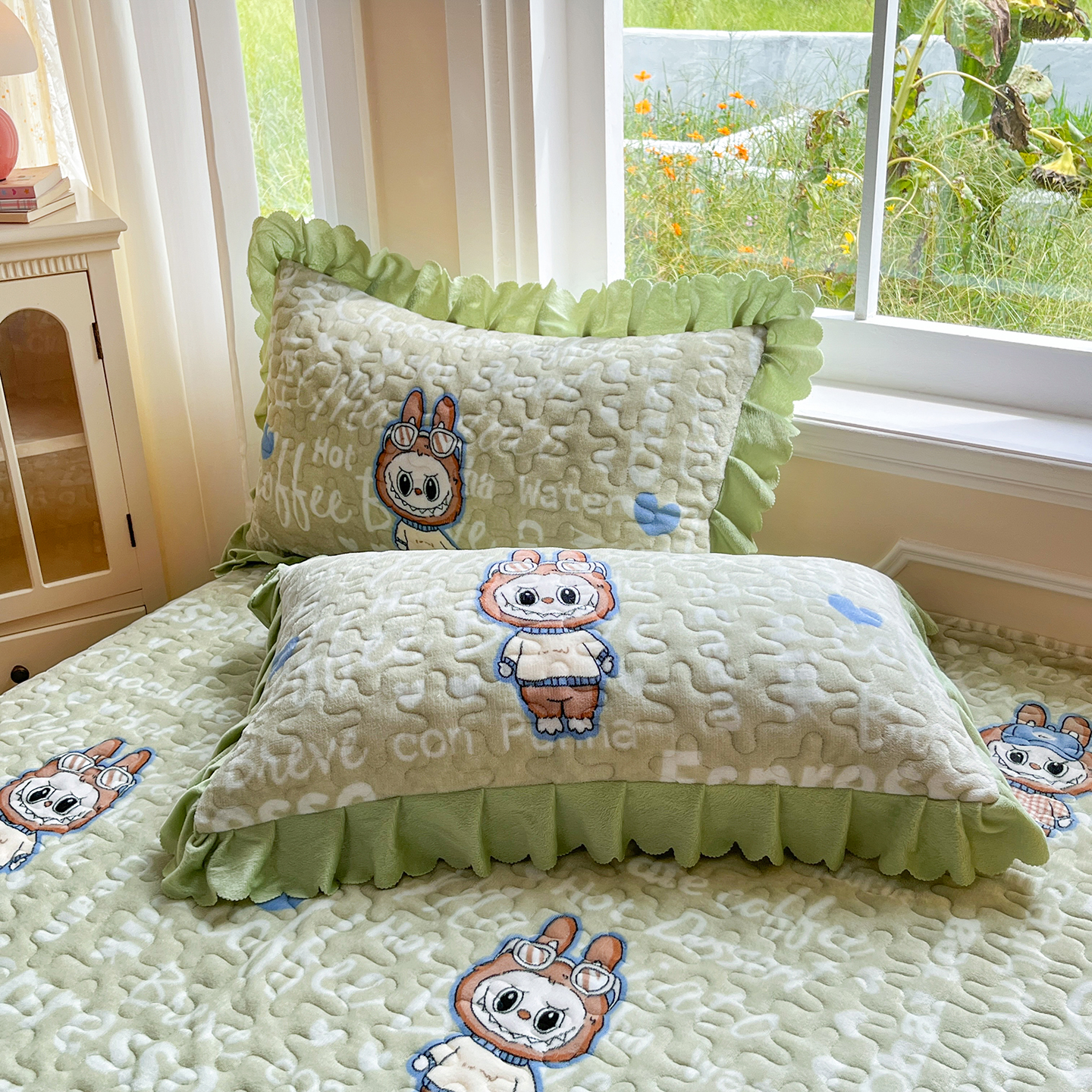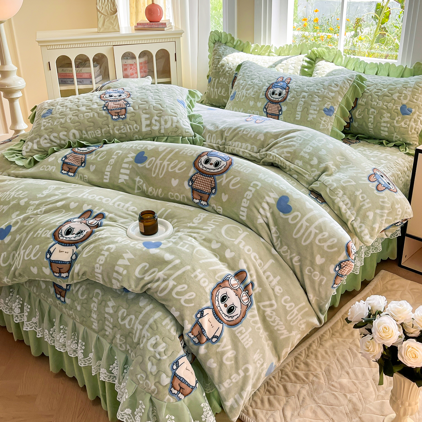 当前位置: 91家纺网 > 商品网购 > 床品套件 > 四件套 > 牛奶绒四件套 > 提花大世界 2025新款爆款高克重牛奶绒印花夹棉蕾丝花边床盖床三件四件套 字母布布