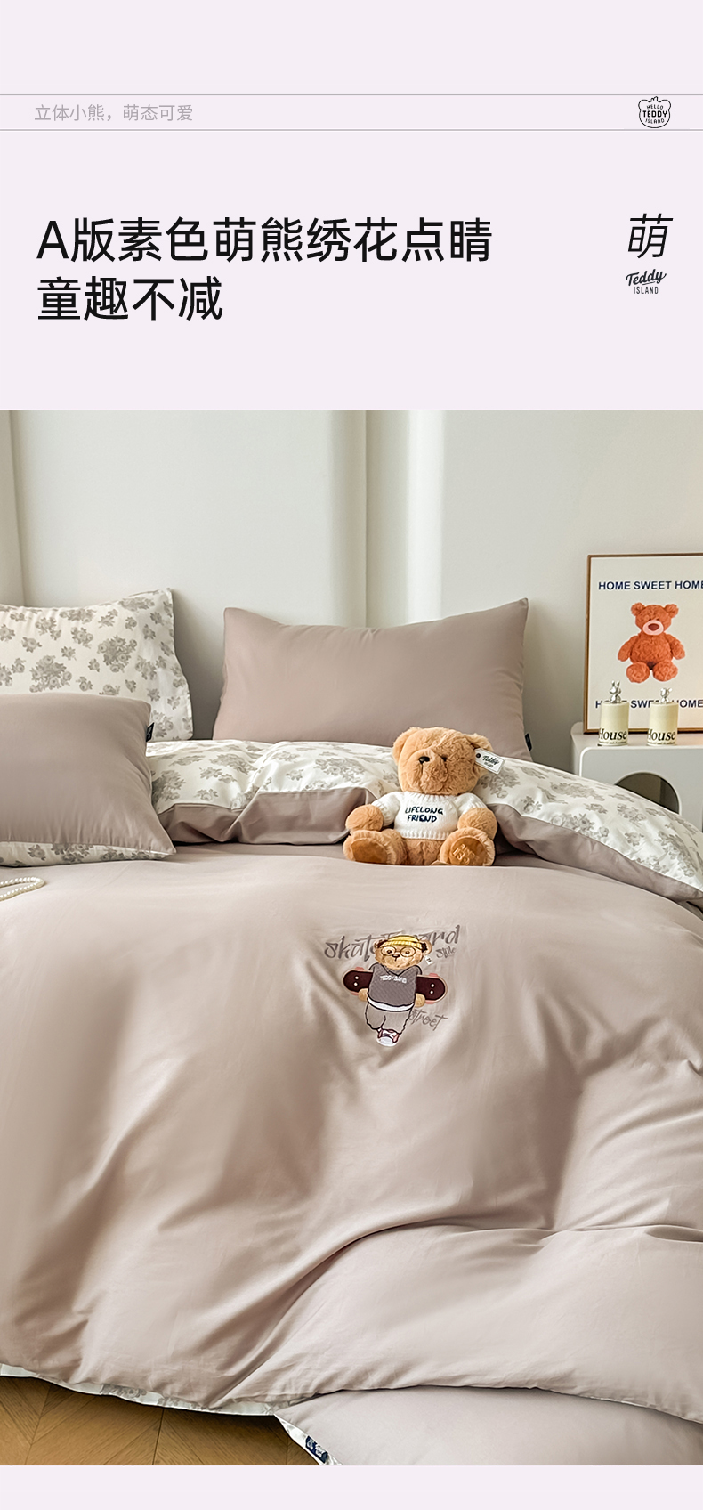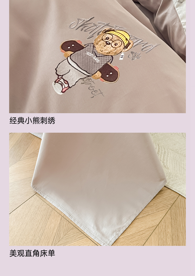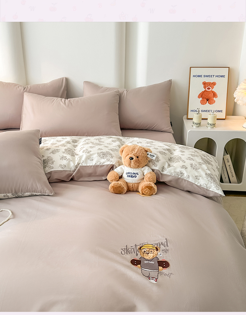 (总)泰迪爱兰Teddy ISLAND 2025新款牛奶绒绣花四件套,粉色+杏仁色,可可色+杏仁色,雾霾灰+神秘灰,香芋紫+神秘灰,杏仁色+可可色,杏仁色+神秘灰