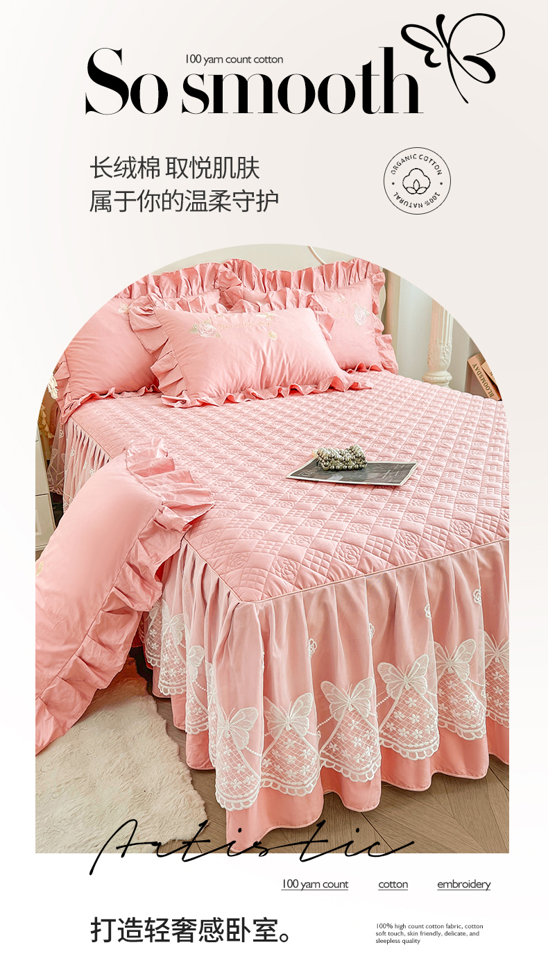当前位置: 91家纺网 > 商品网购 > 床品套件 > 三件套 > 宜凡家纺 2025新款长绒棉绣花夹棉床裙三件套--蝶恋笙花系列 蝶恋笙花 芙绒玉
