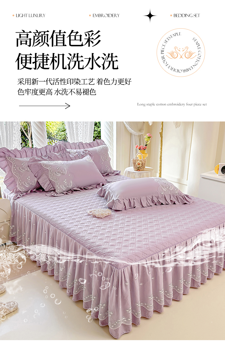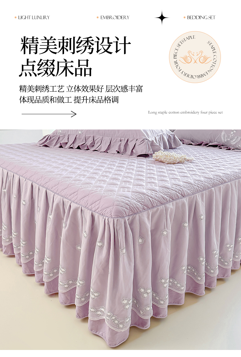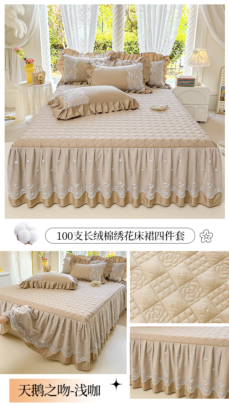 当前位置: 91家纺网 > 商品网购 > 床品套件 > 三件套 > 宜凡家纺 2025新款长绒棉绣花夹棉床裙三件套--天鹅之吻系列 天鹅之吻-蜜粉