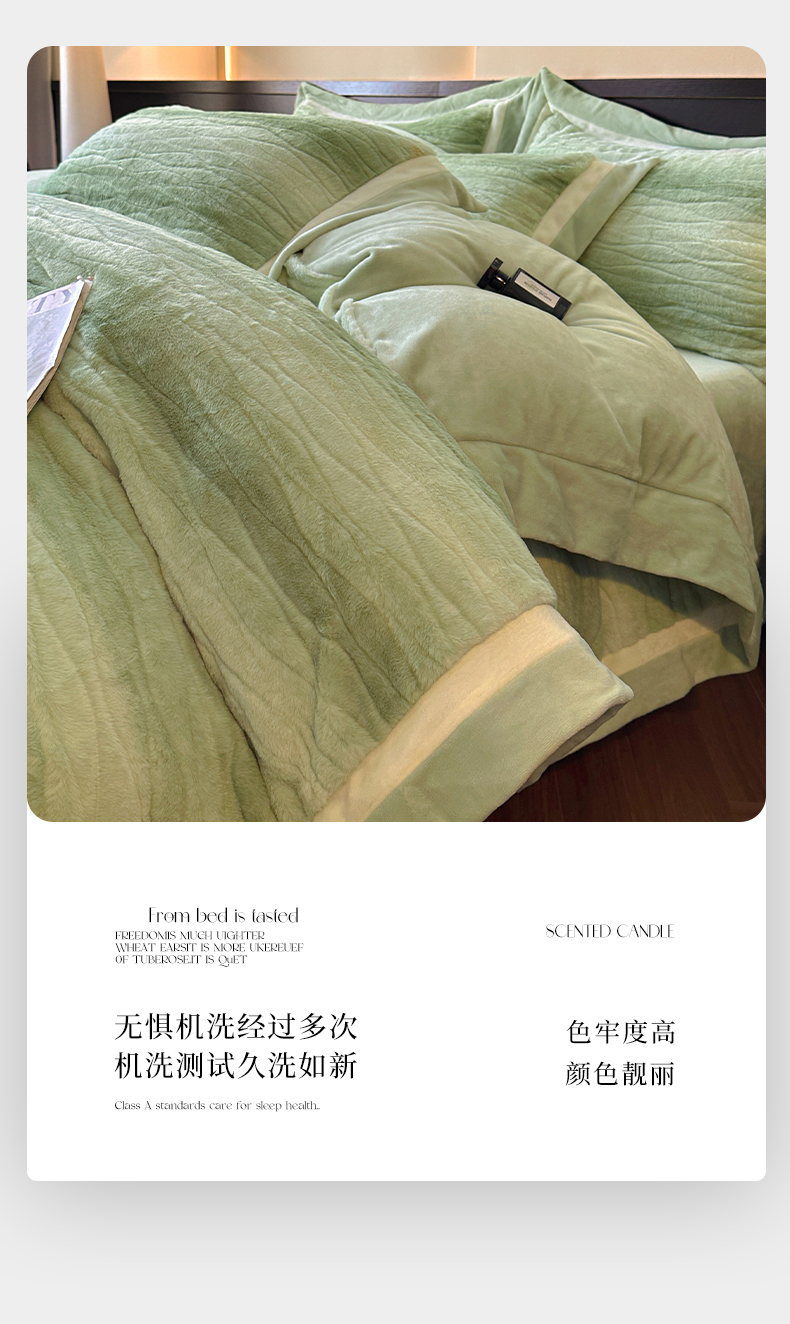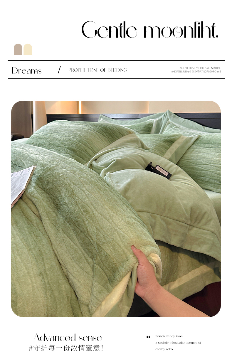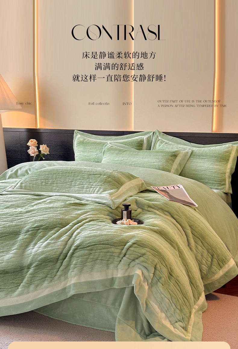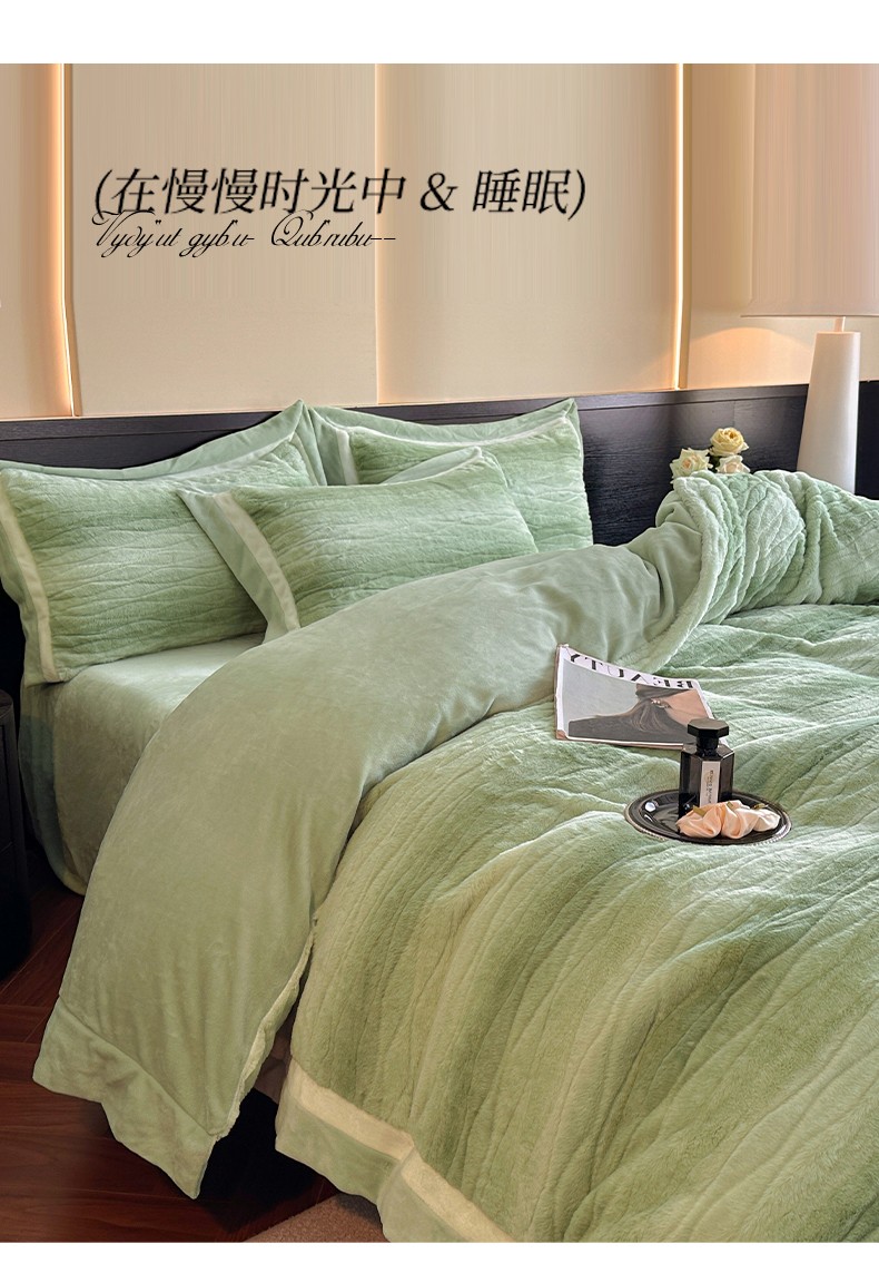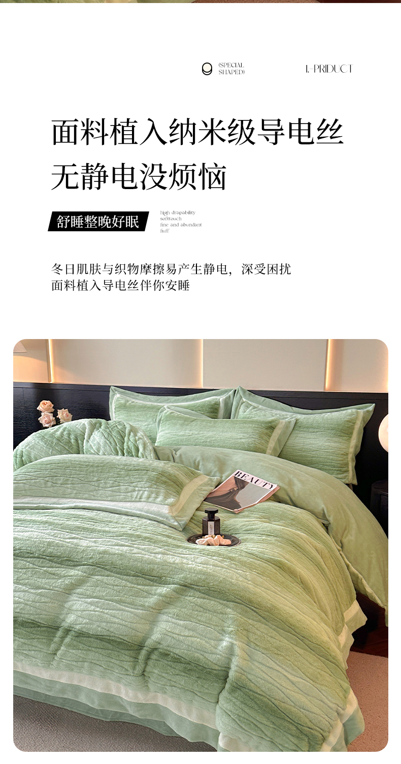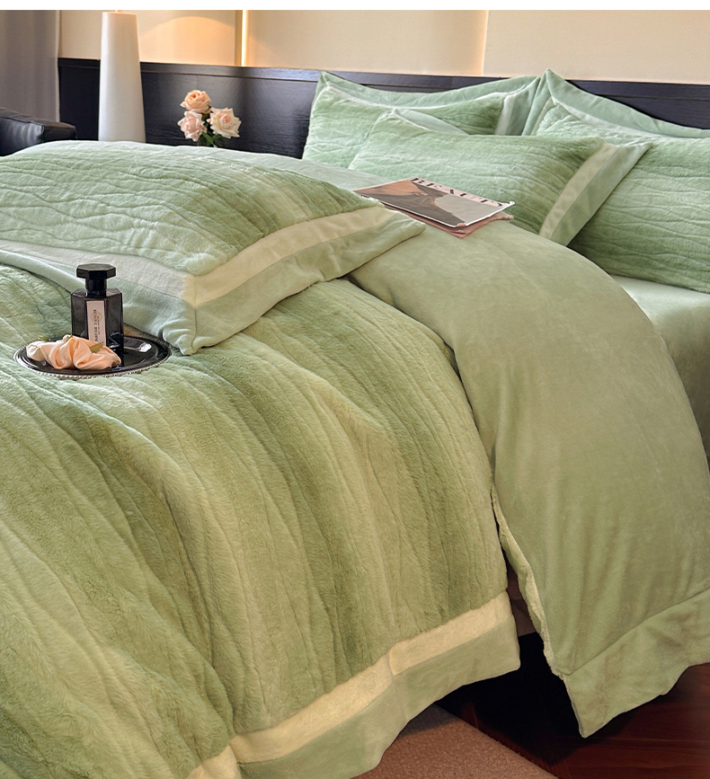 商品名称:绘萱家居 2025新款亲肤舒适双拼边雕花兔毛绒四件套-爱丁堡 爱丁堡-绿