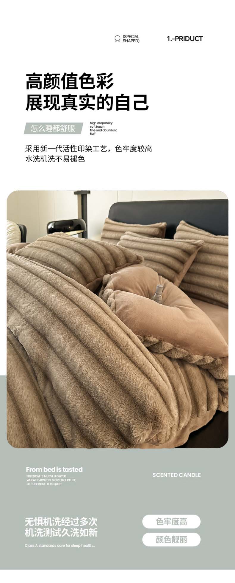 商品名称:居易简 2025新款亲肤保暖皮草绒牛奶绒AB面美拉德抽条兔毛绒四件套 奶油咖