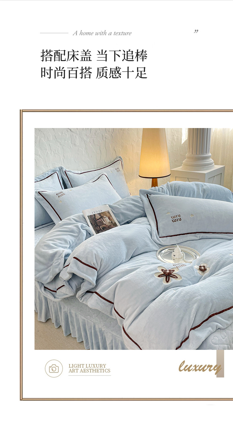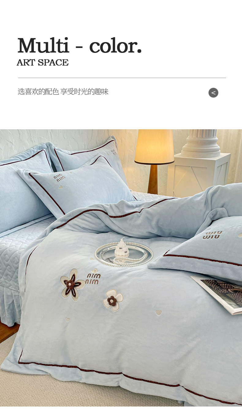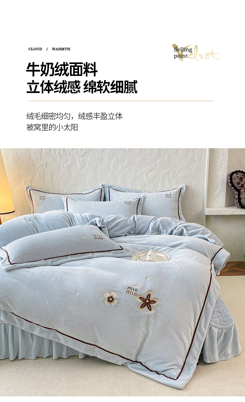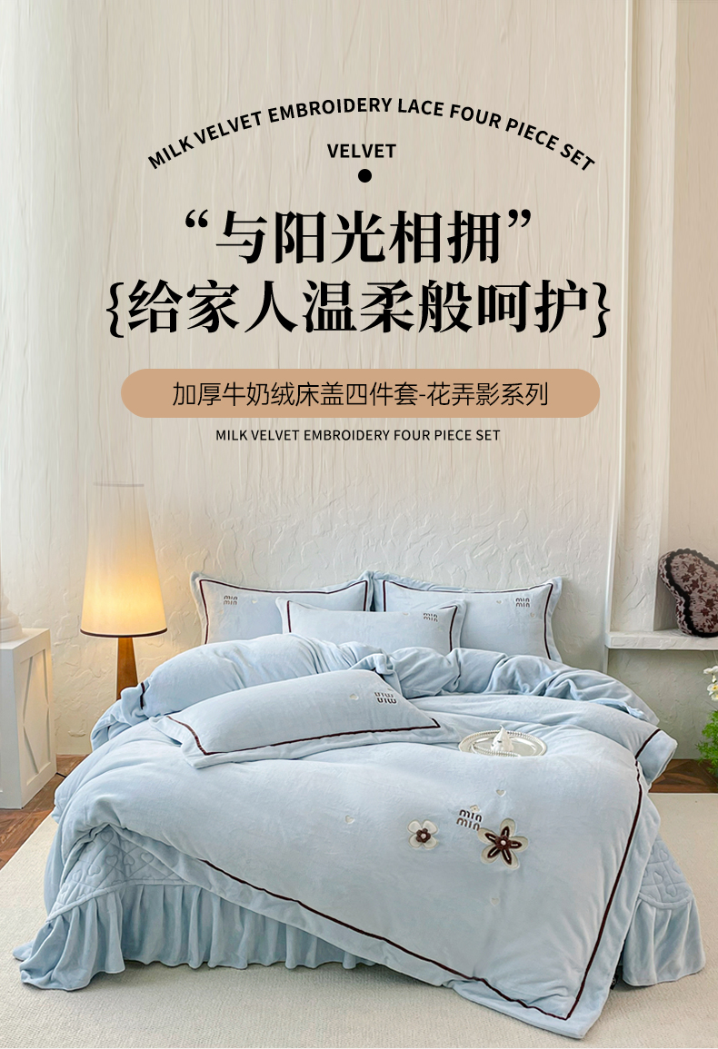 商品名称:金绣美居 2025新款加厚牛奶绒韩版床盖款绣花手工花保暖四件套-花弄影 花弄影-浅湖蓝