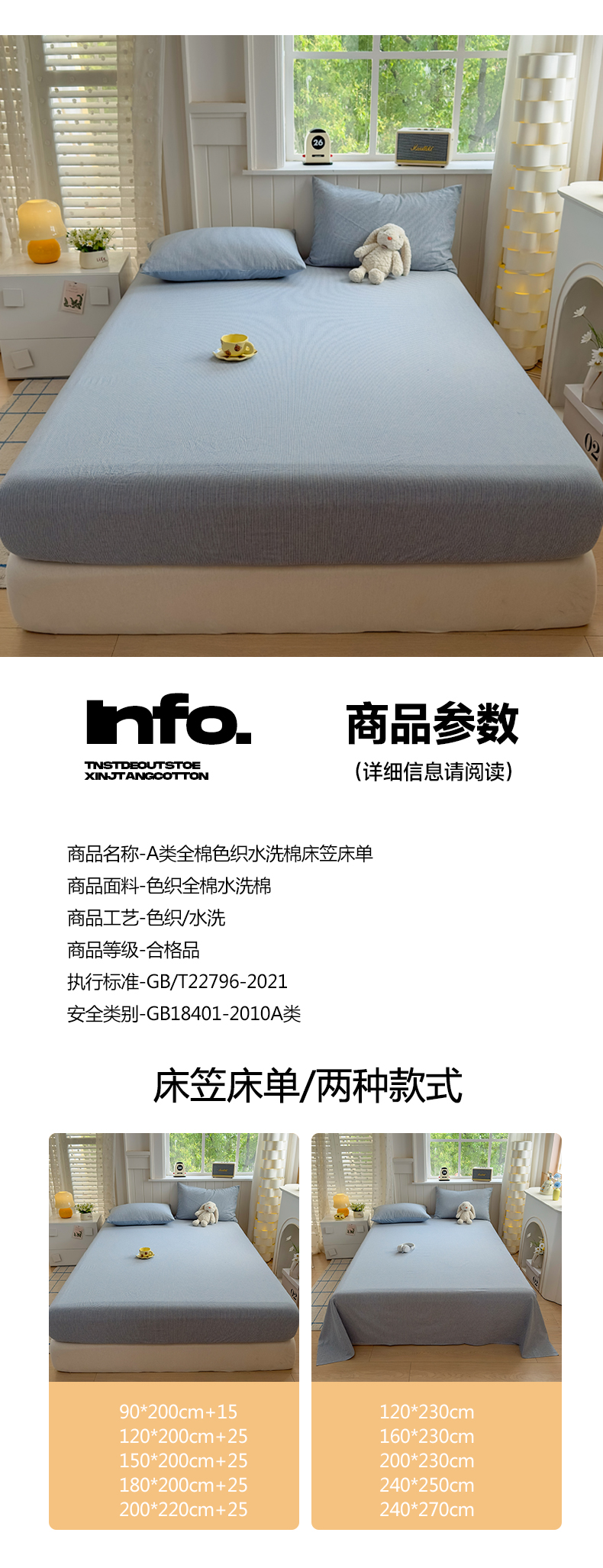 • 91家纺网 家纺一手货源 找家纺 宜家坊 2025新款A类色织全棉水洗棉床笠单件纯棉格子纯色学生宿舍定制定做 密条-浅蓝