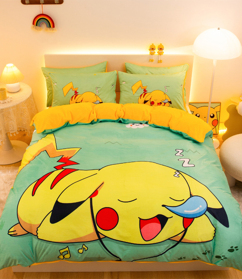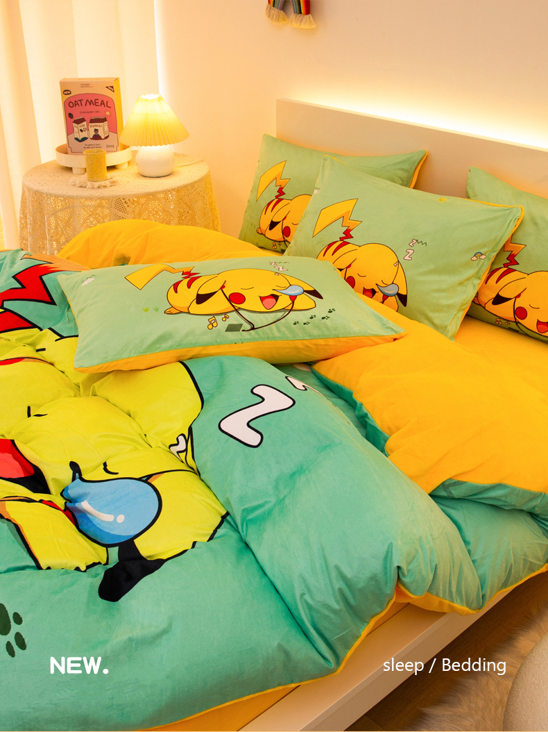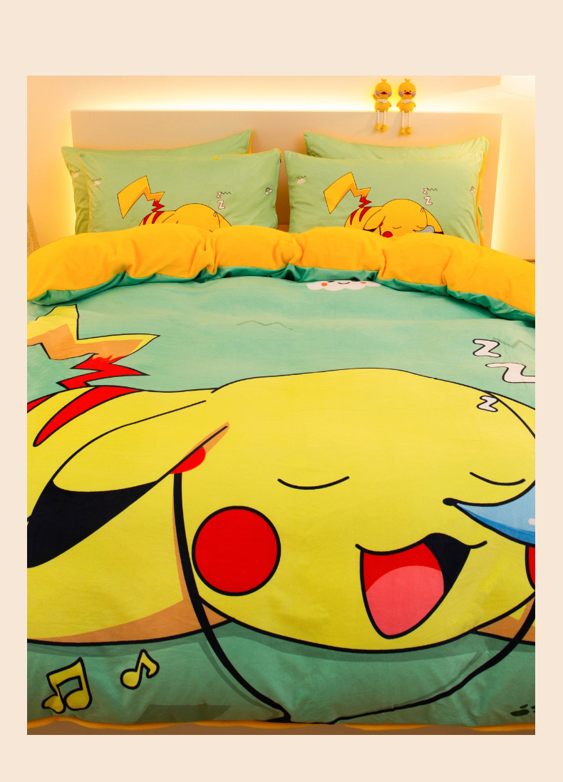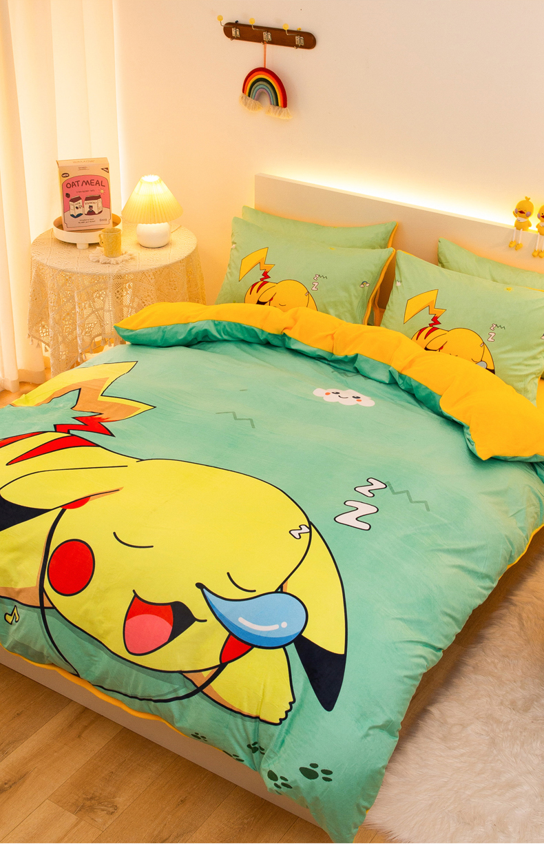 一电 2025外贸跨境电商儿童卡通床上四件套亲肤牛奶绒学生三件床单被套加大珊瑚宝宝卡通 呼呼皮卡丘