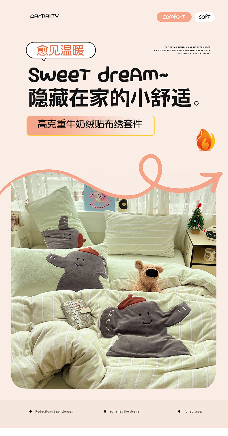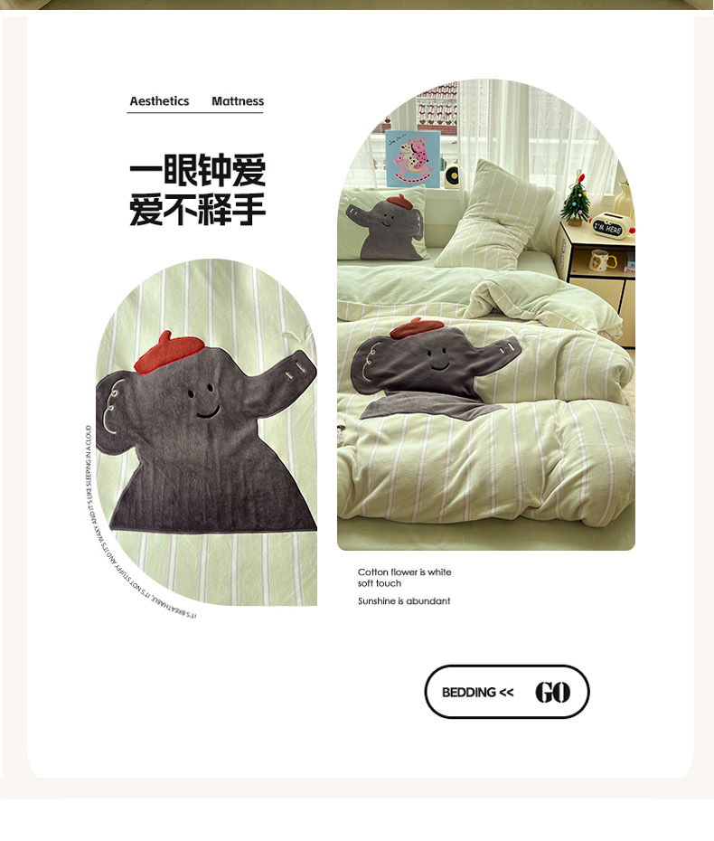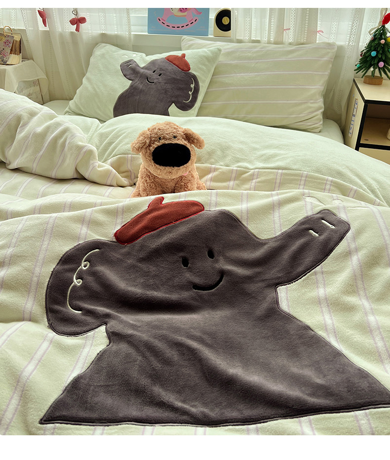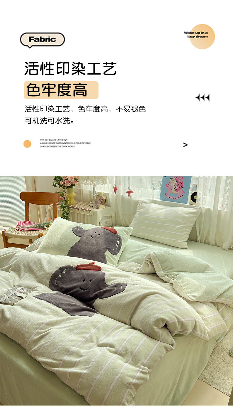 品乐家纺 2025秋冬新款高克重牛奶绒贴布绣四件套 条纹小象-绿