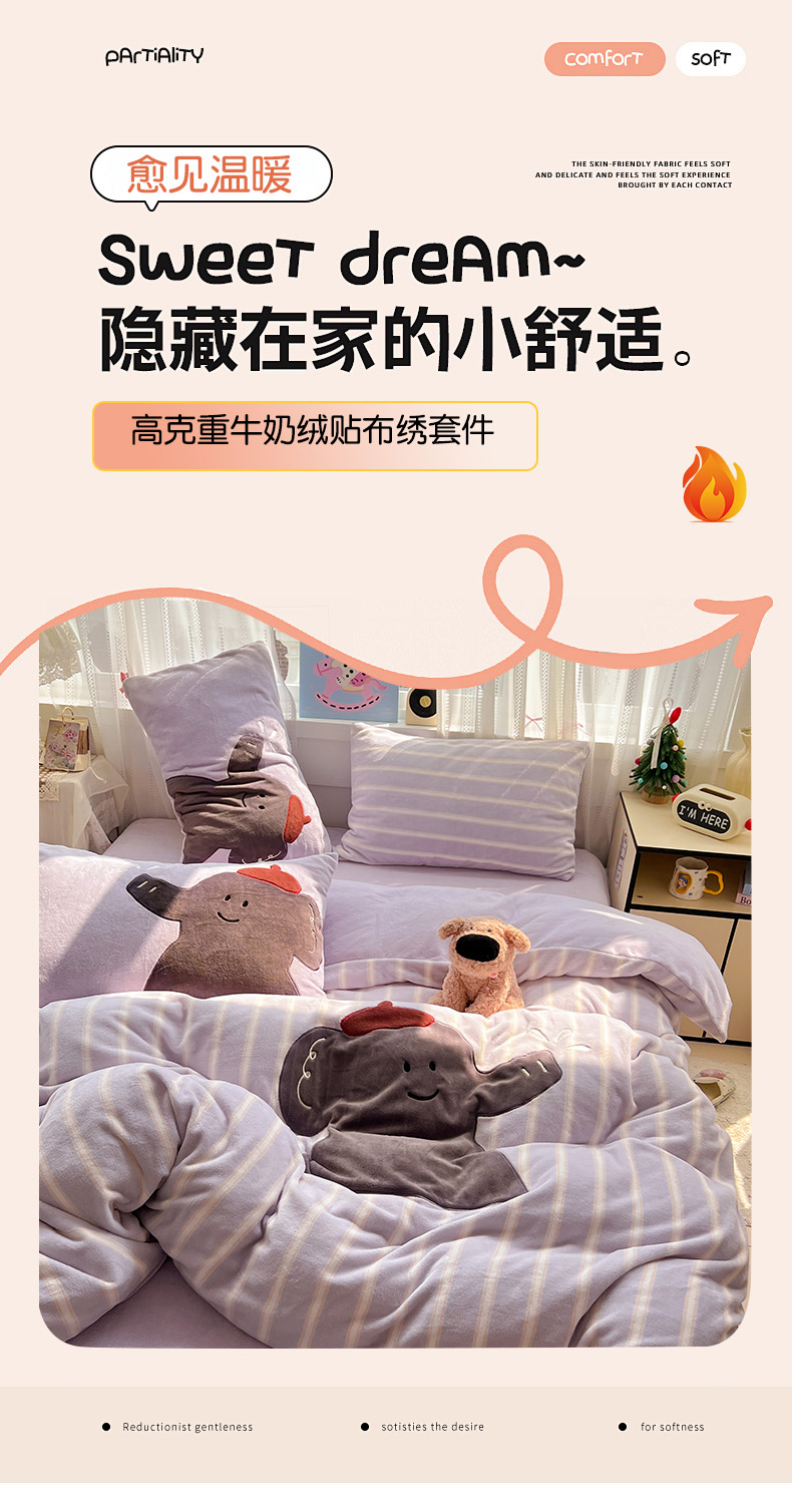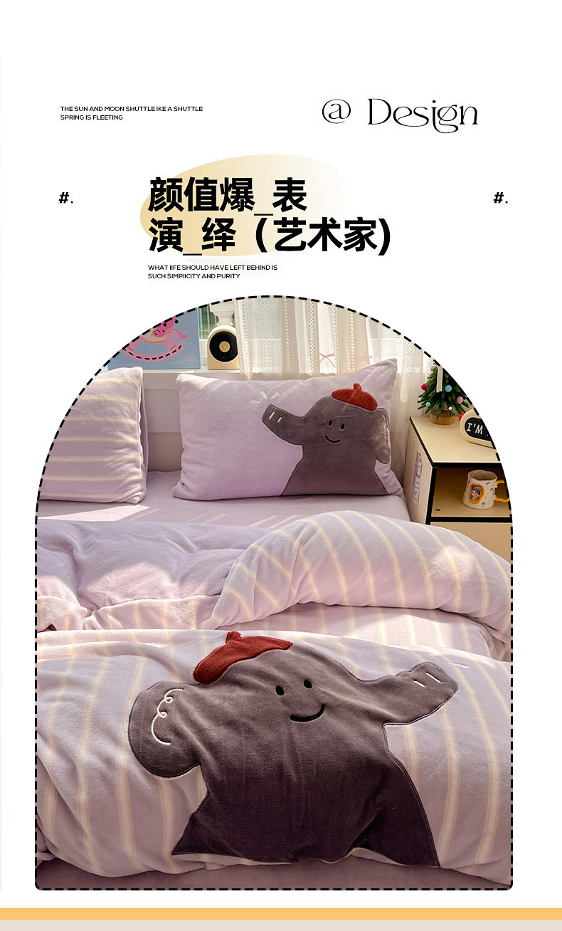 (总)品乐家纺 2025秋冬新款高克重牛奶绒贴布绣四件套,条纹狗狗-粉,条纹狗狗-黄,条纹狗狗-咖,条纹狗狗-绿,条纹小象-粉,条纹小象-黄,条纹小象-蓝,条纹小象-绿,条纹小象-紫