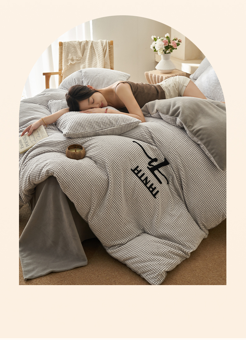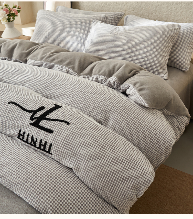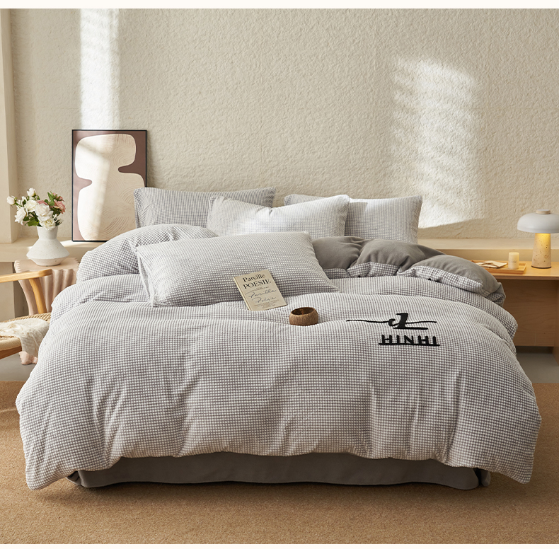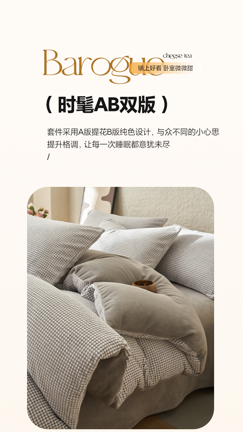 商品名称:早晨家纺 2025新款深蓝款阳离子提花牛奶绒四件套 深蓝-灰