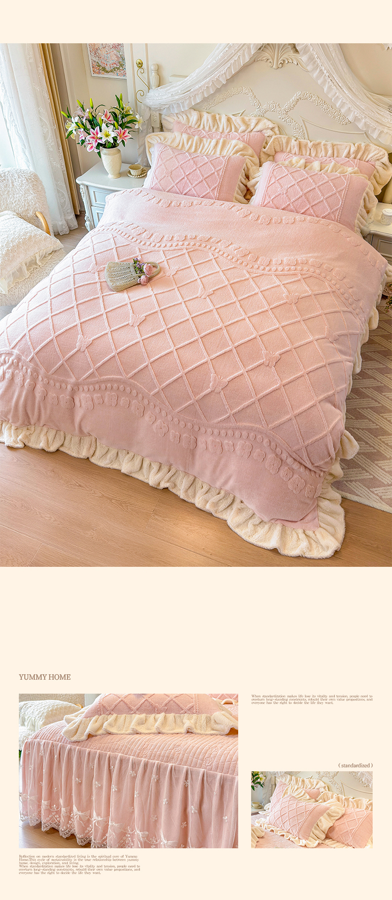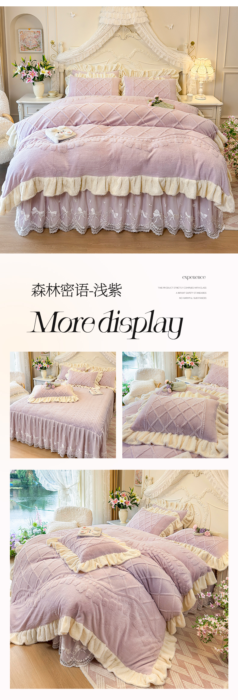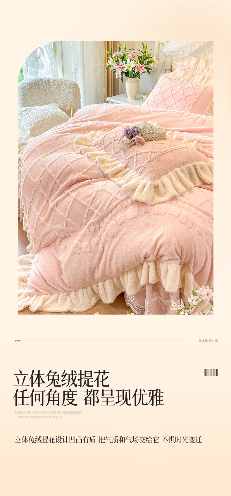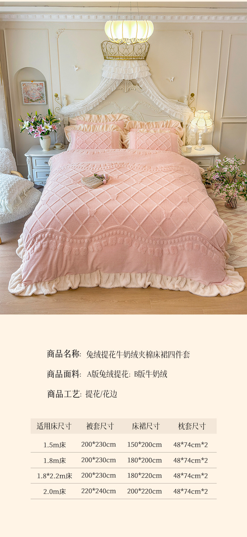(总)宜凡家纺 2025新款兔绒提花牛奶绒夹棉床裙四件套,爱心 少女粉,爱心 粉紫,爱心 驼色,蝶舞 大红,蝶舞 米色,蝶舞 浅紫,蝶舞 玉色,简爱 苍青,简爱 豆沙紫,简爱 玉色,樱桃 苍青,樱桃 豆沙紫,樱桃 奶油白