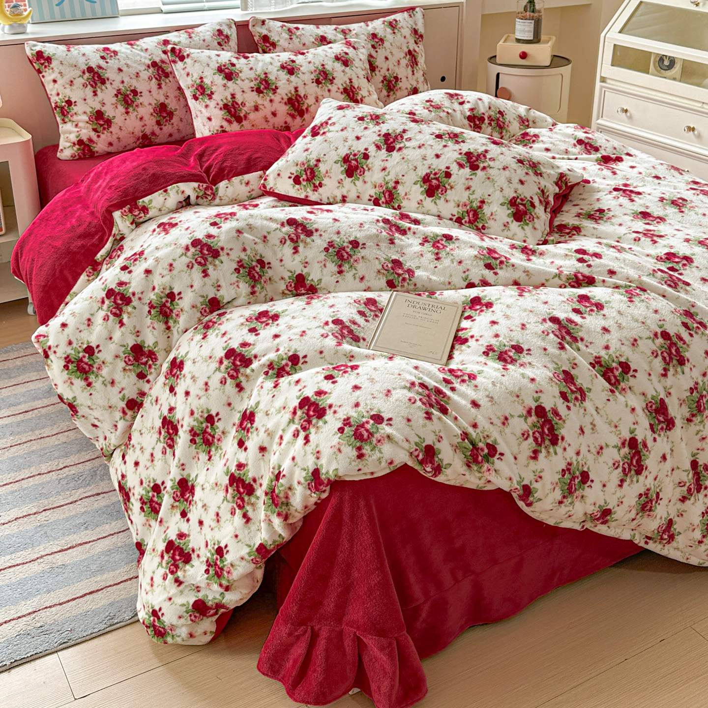 梦莱斯 2025新款加厚保暖双面牛奶绒四件套 玫瑰之约 - 白
