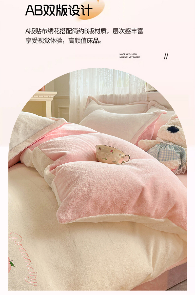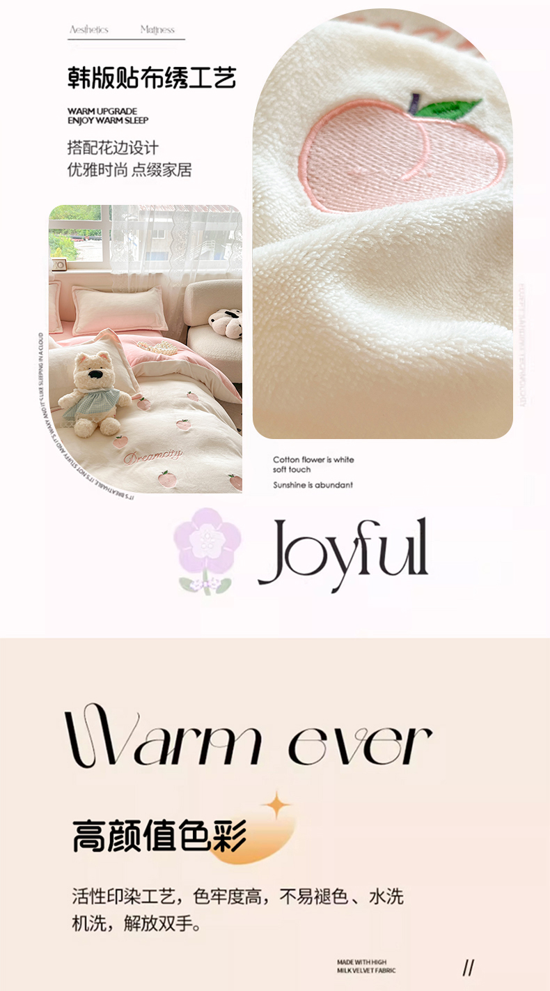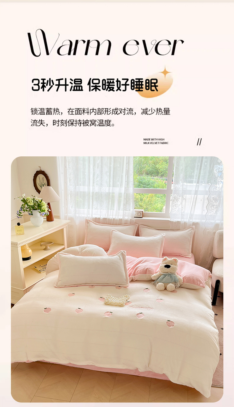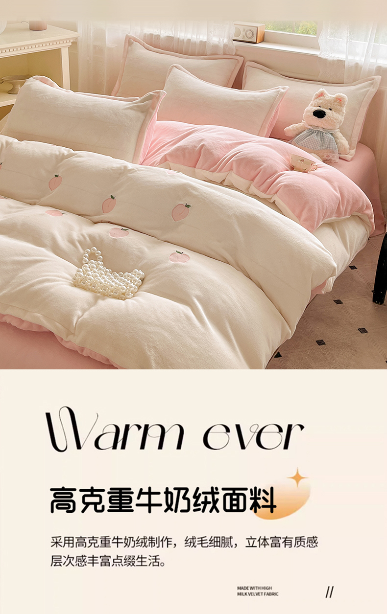 伊梵居2025新款加厚贴布绣牛奶绒四件套 桃子-奶白粉