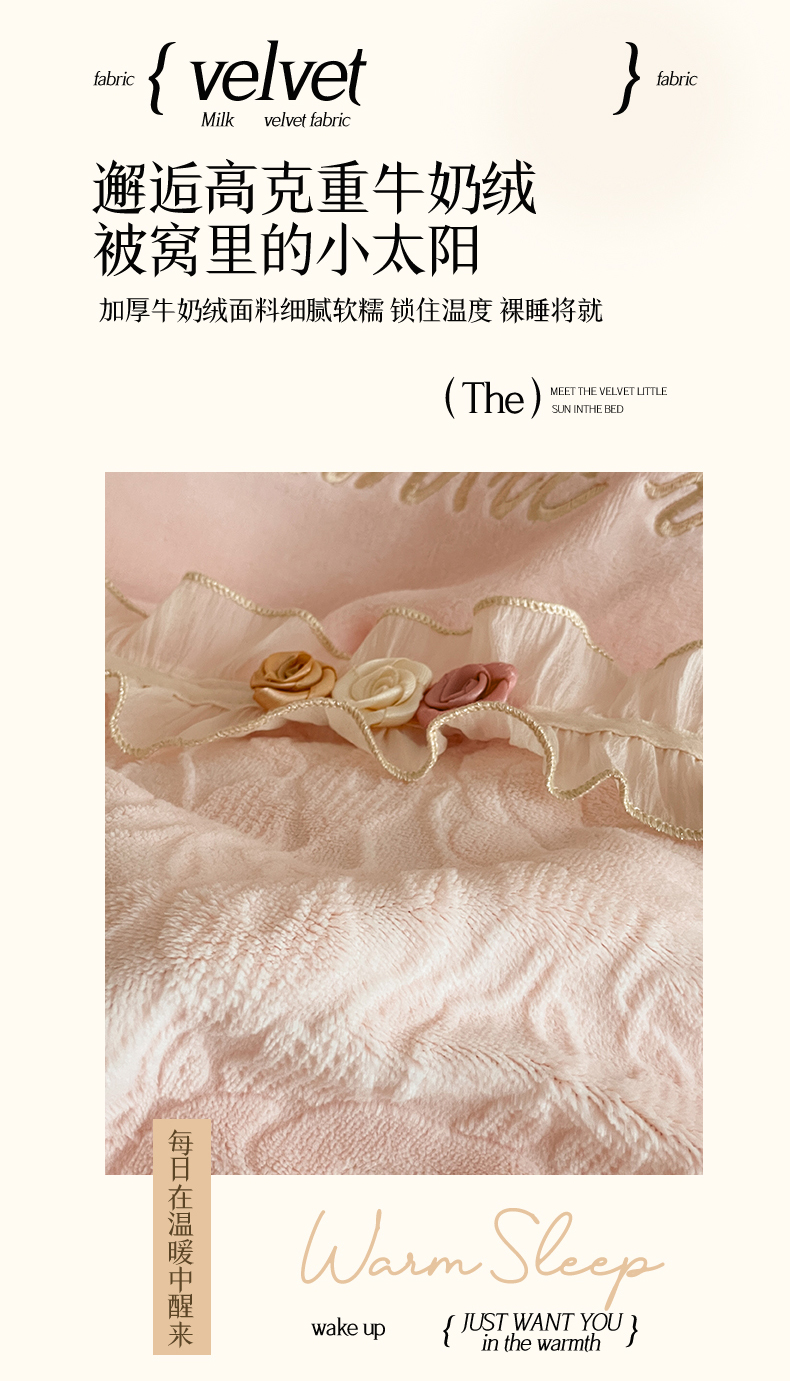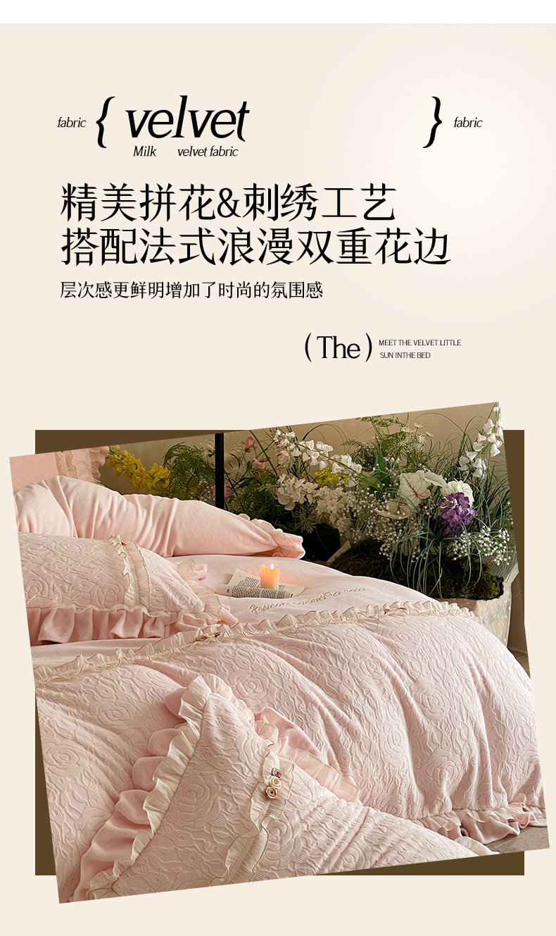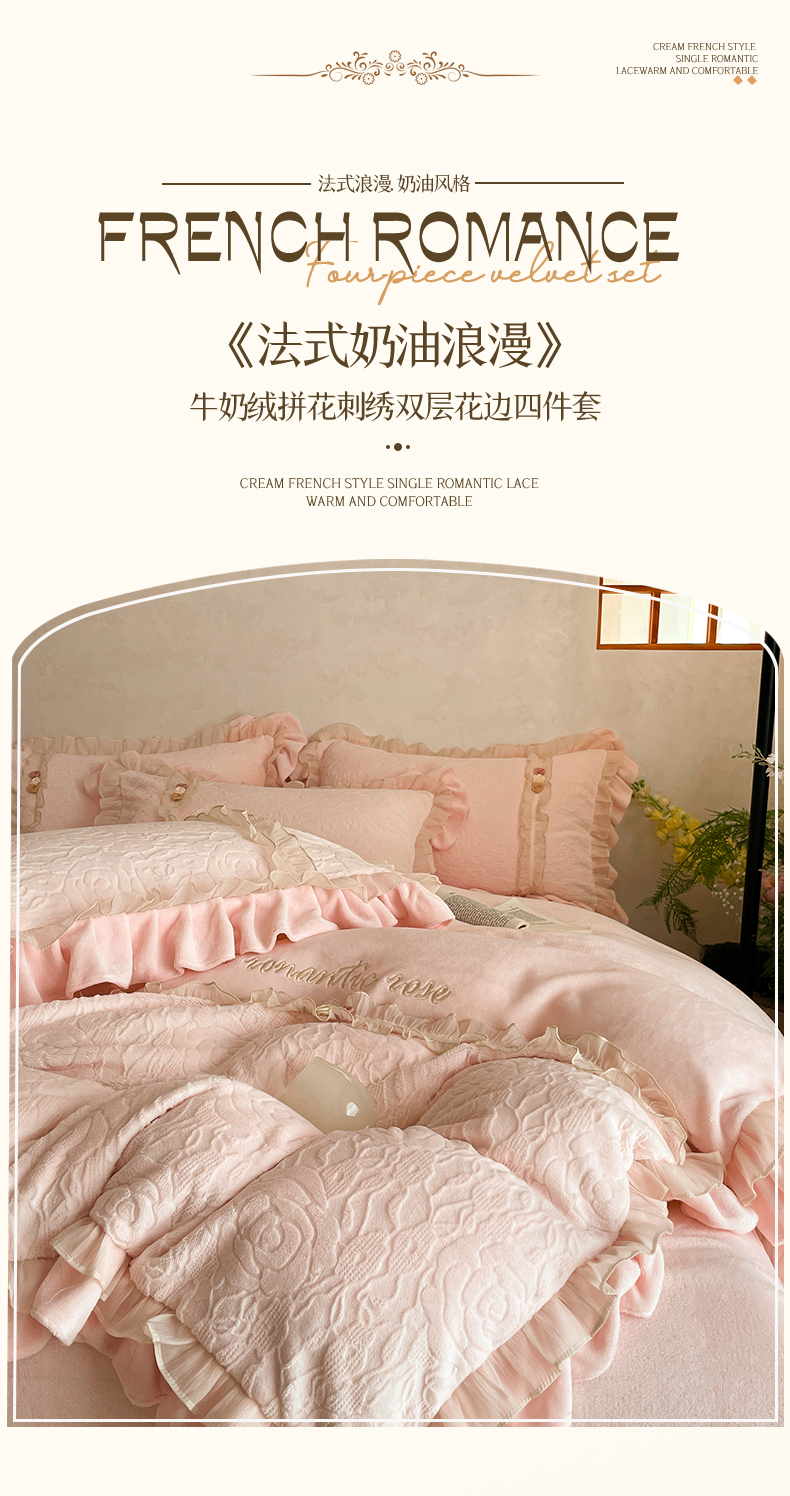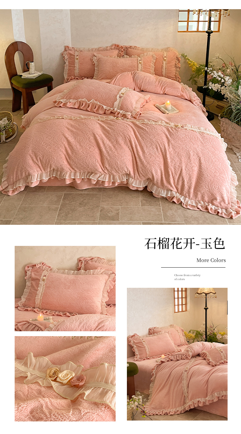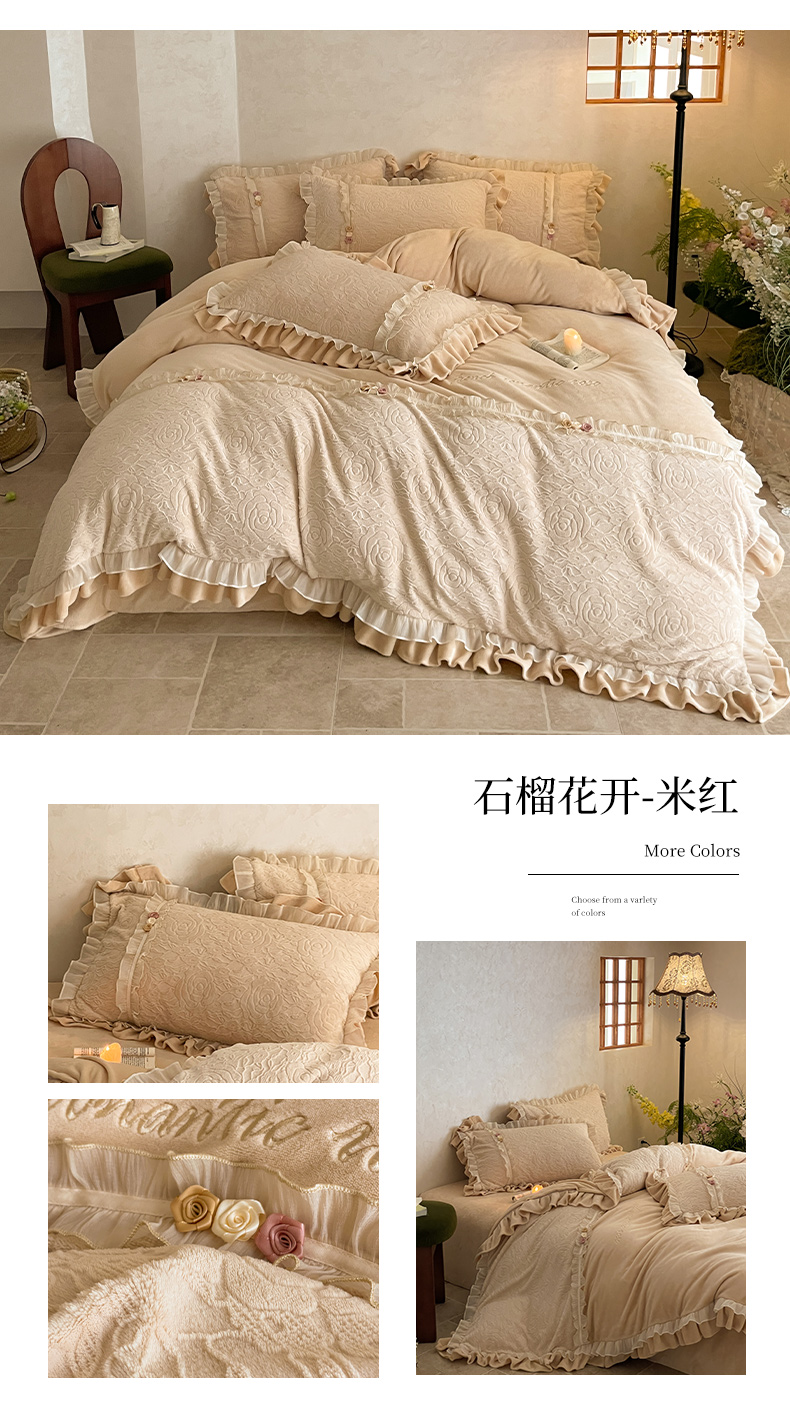 商品名称:(总)蓝邻家纺 2025新款牛奶绒拼花刺绣双层花边四件套-石榴花开系列