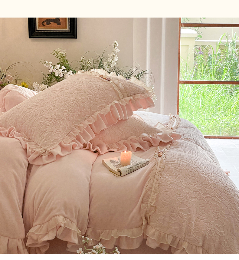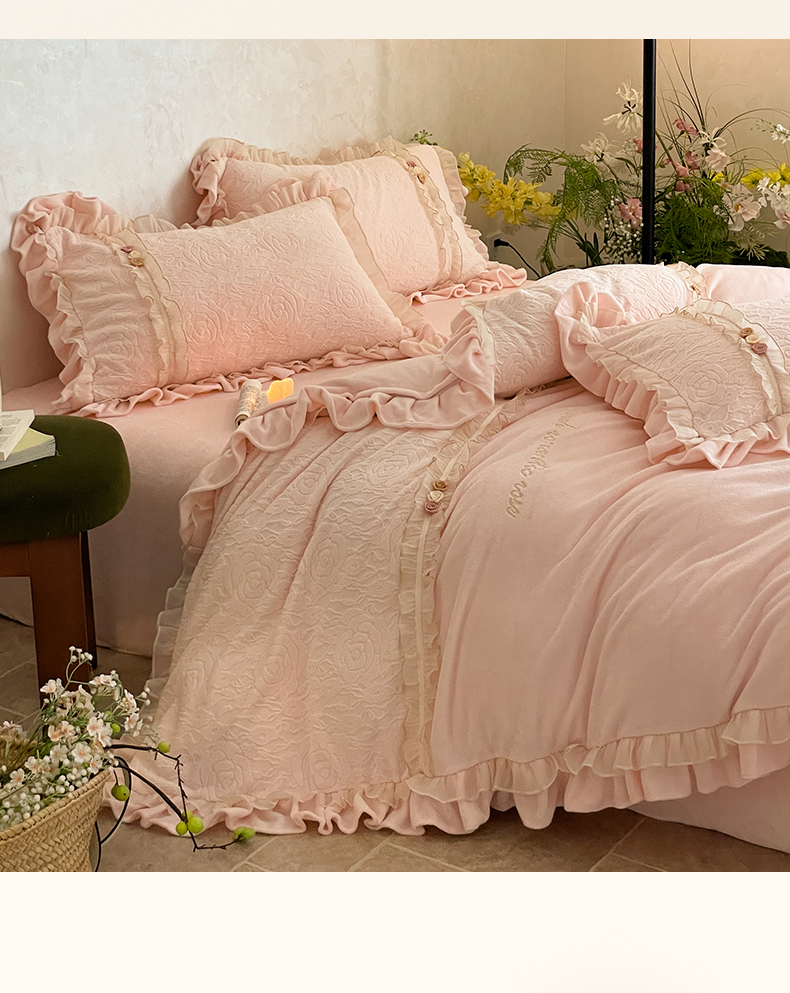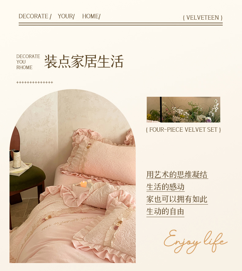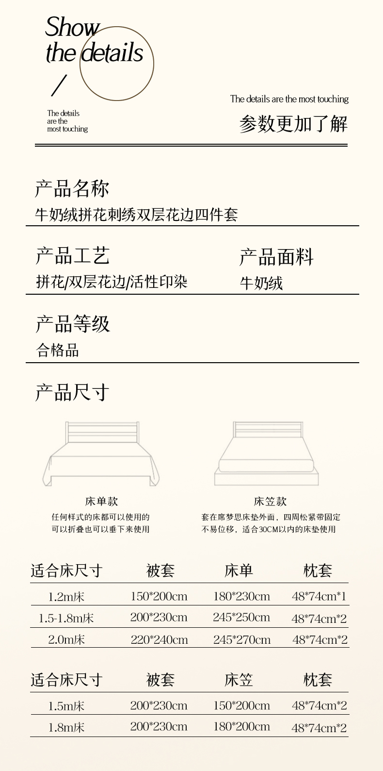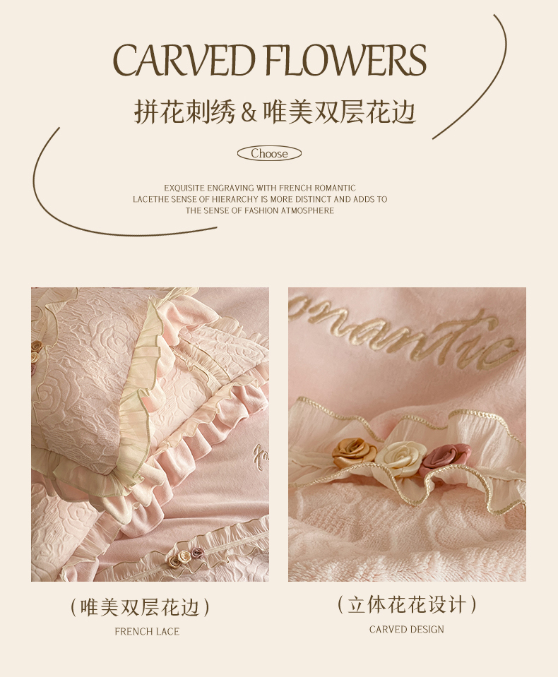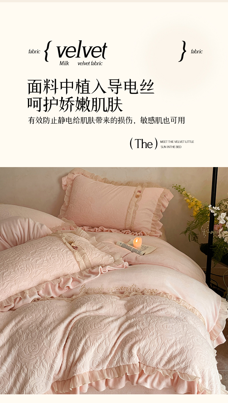 商品名称:(总)蓝邻家纺 2025新款牛奶绒拼花刺绣双层花边四件套-石榴花开系列