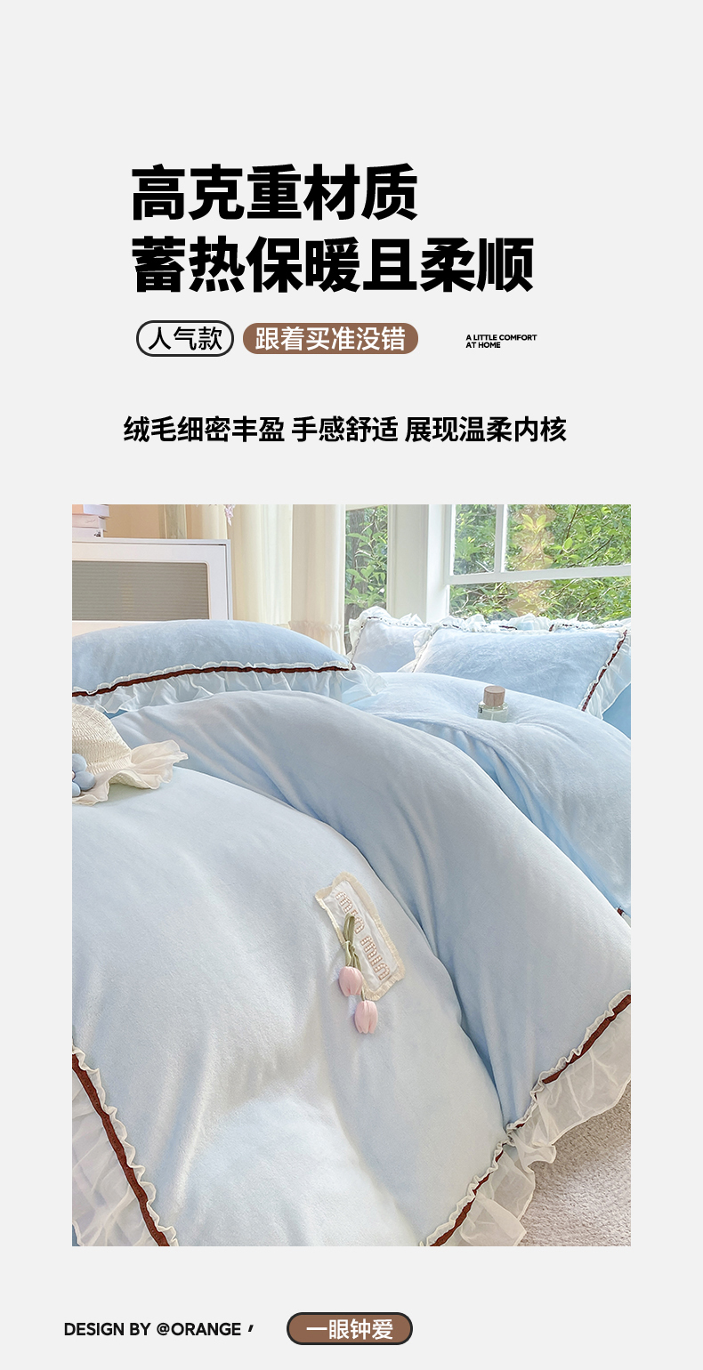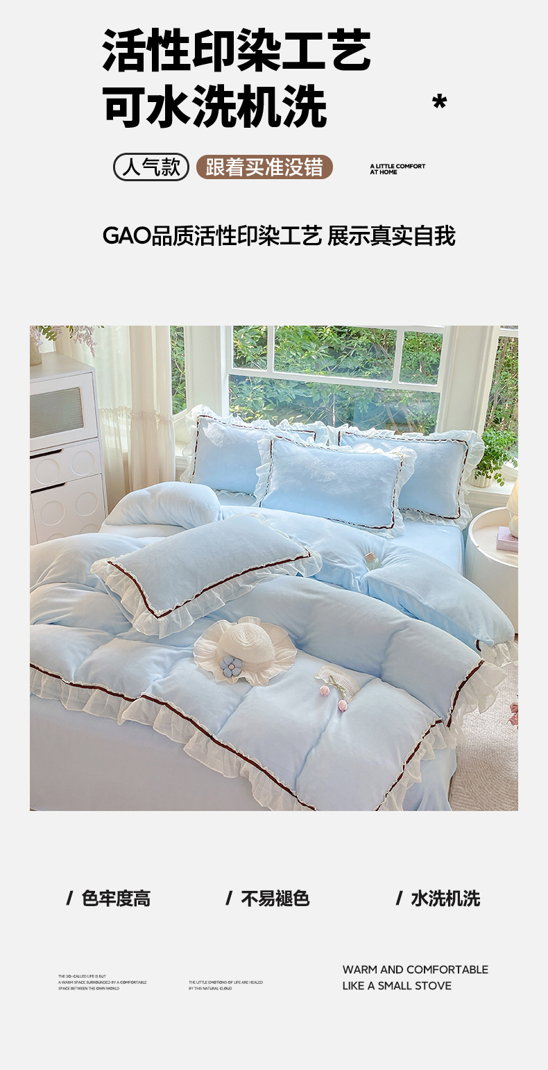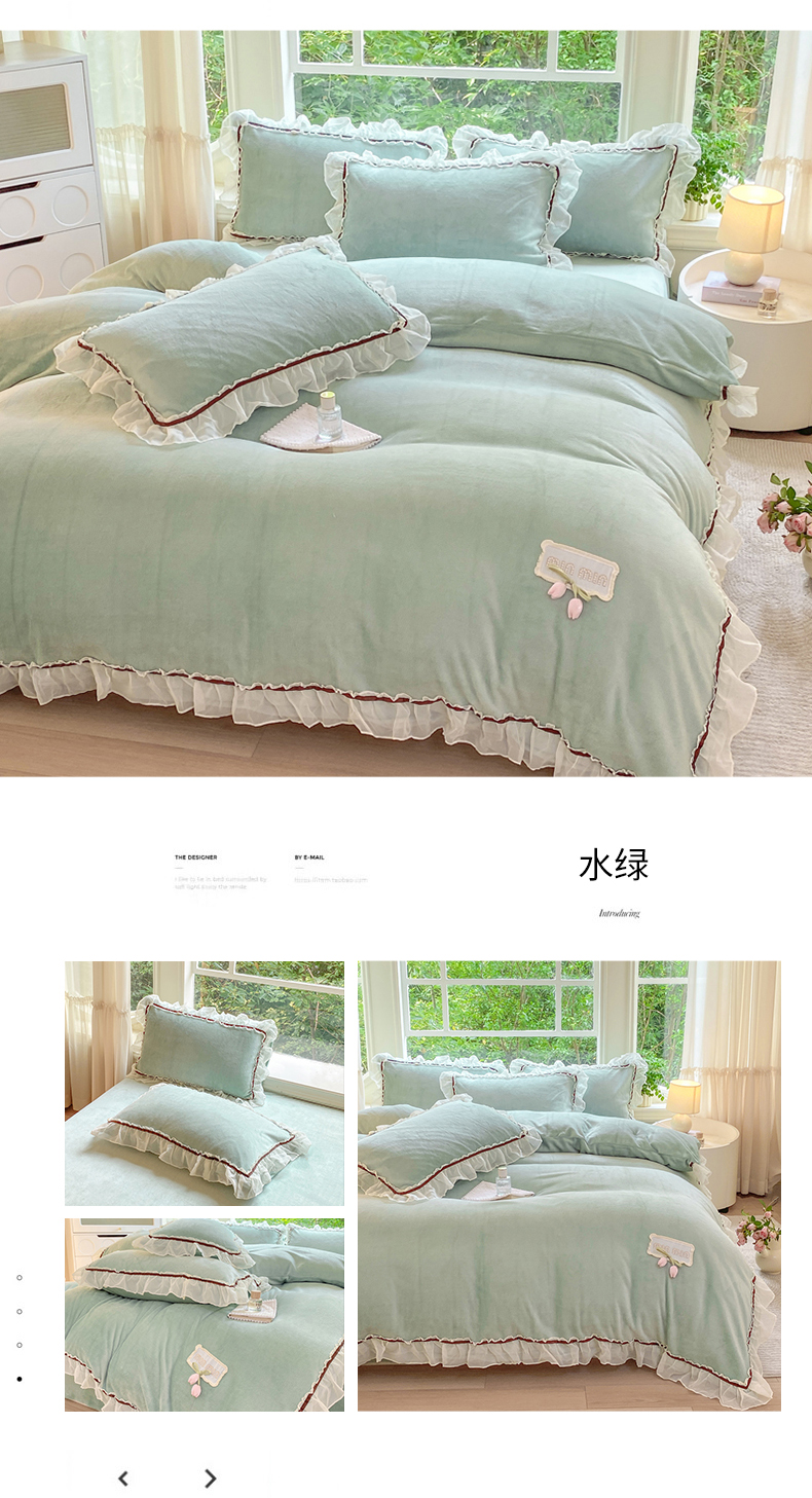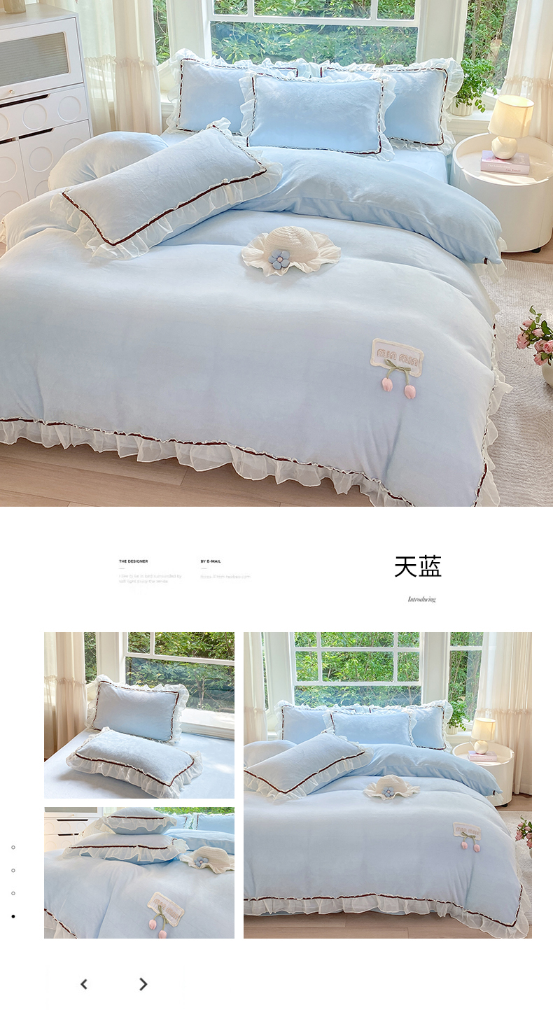 (总)二八年华 2025新款韩式花边款牛奶绒四件套,天蓝,豆沙,鹅黄,粉玉,水绿,鸢紫