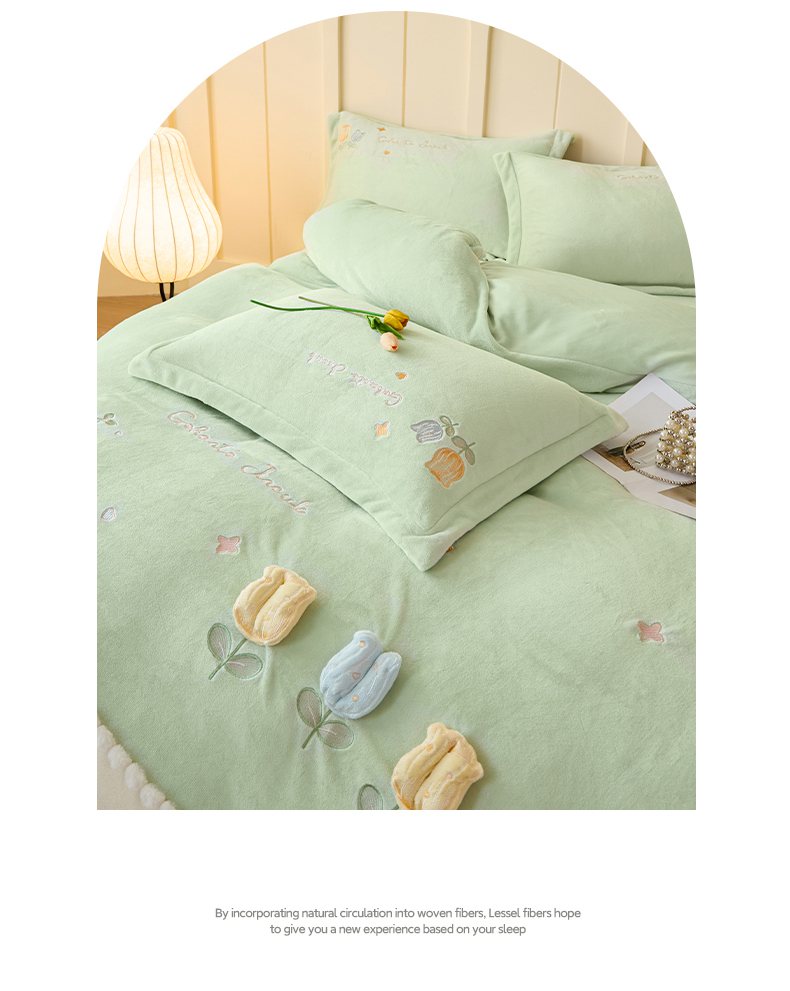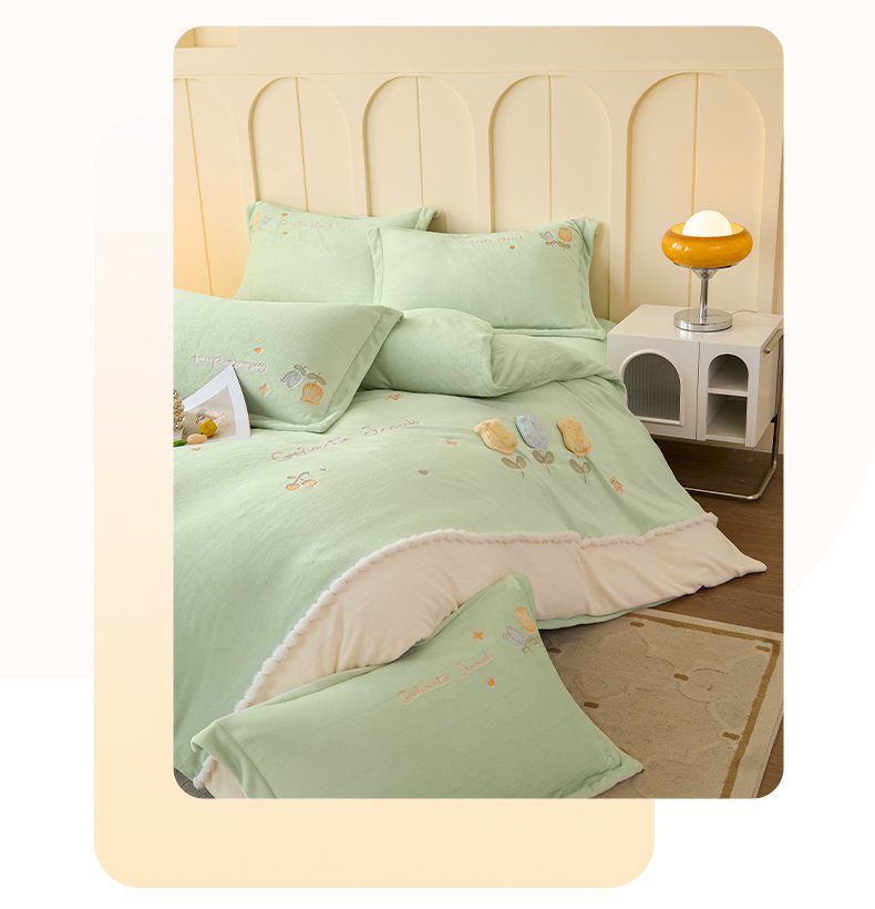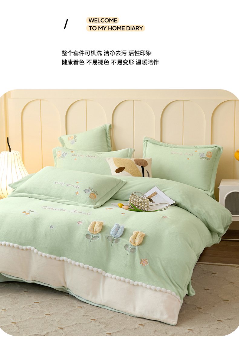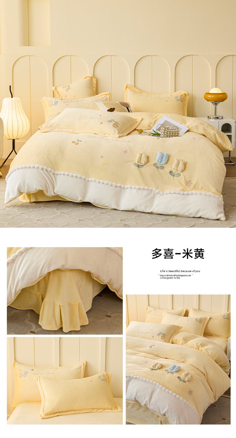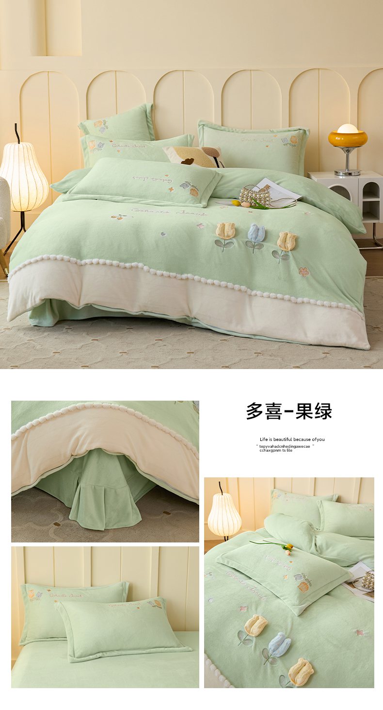 (总)卡初家居(原微来) 2025新款秋冬亲肤牛奶绒绣花四件套-多喜系列,多喜-豆沙,多喜-果绿,多喜-米黄,多喜-浅紫,多喜-桃粉,多喜-天蓝