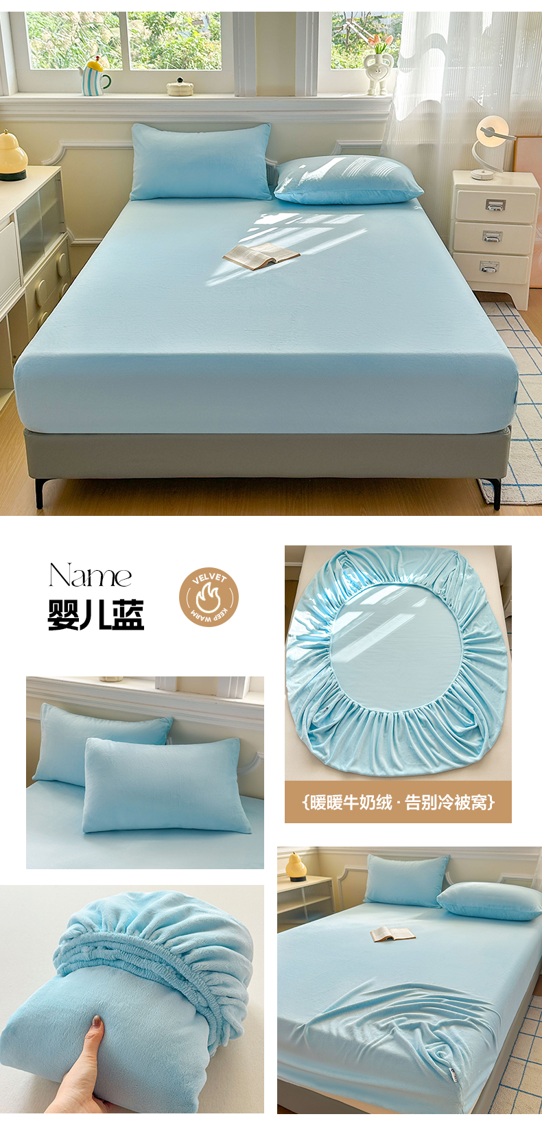 佳笠家居 2025新款正宗250g全消光牛奶绒床笠 婴儿蓝