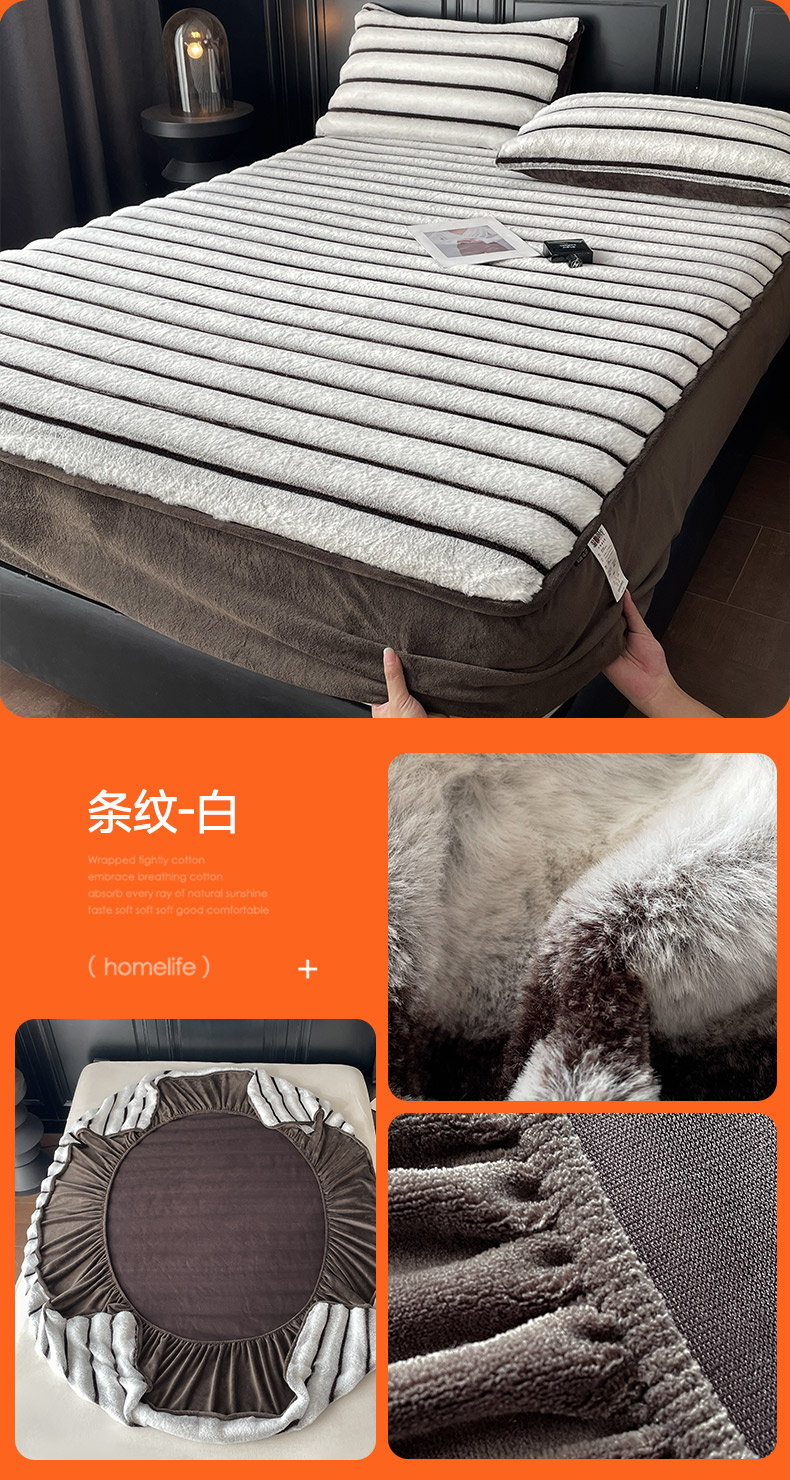 商品名称:库里梦家纺 2025新款美拉德托卡斯獭兔毛绒床笠三件套 条纹-白