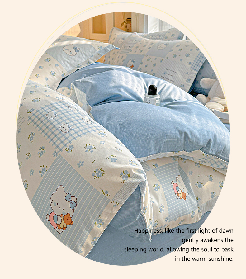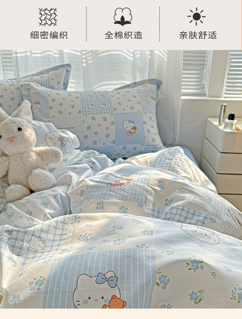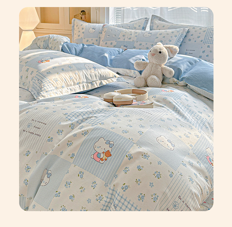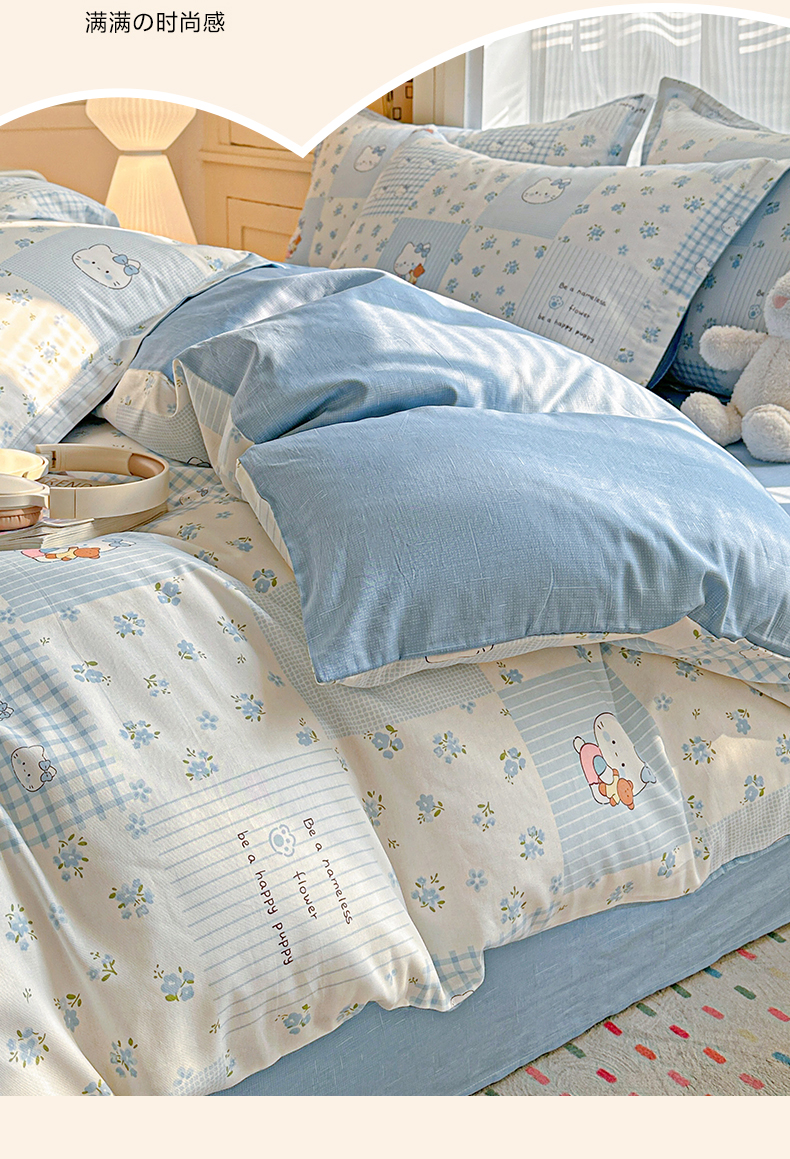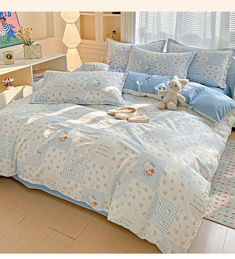 当前位置: 91家纺网 > 商品网购 > 床品套件 > 四件套 > 全棉普通四件套 > 春雨家居 2026新款全棉纯棉花ins减龄可爱小清新四件套 蓝拼KT-兰