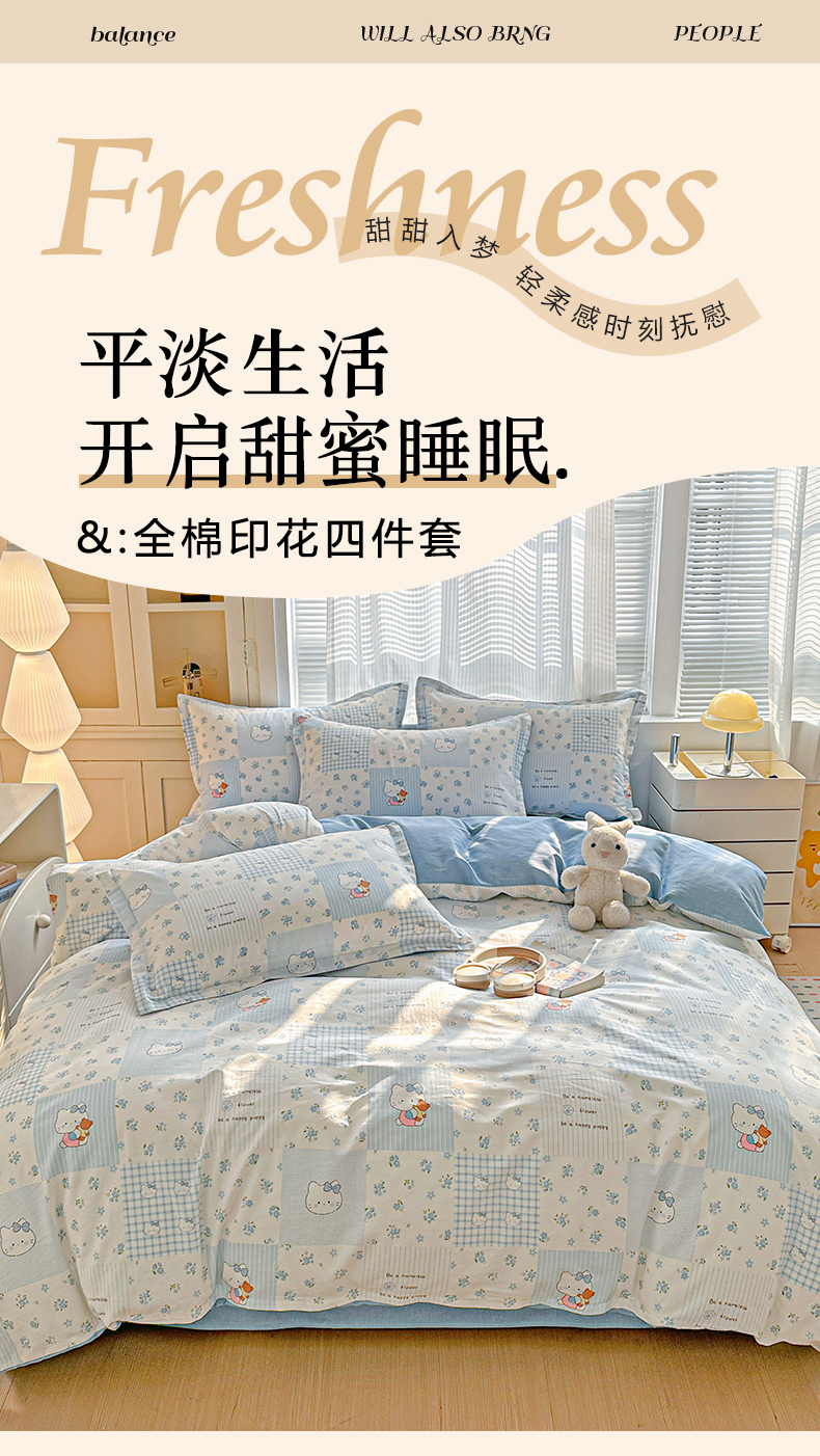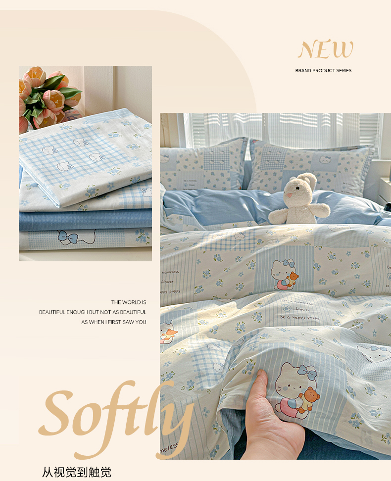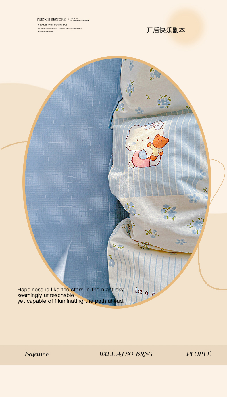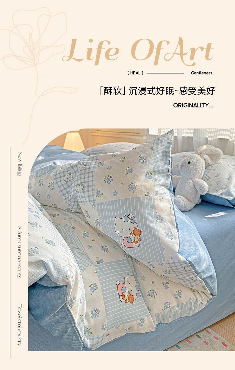 当前位置: 91家纺网 > 商品网购 > 床品套件 > 四件套 > 全棉普通四件套 > 春雨家居 2026新款全棉纯棉花ins减龄可爱小清新四件套 蓝拼KT-兰