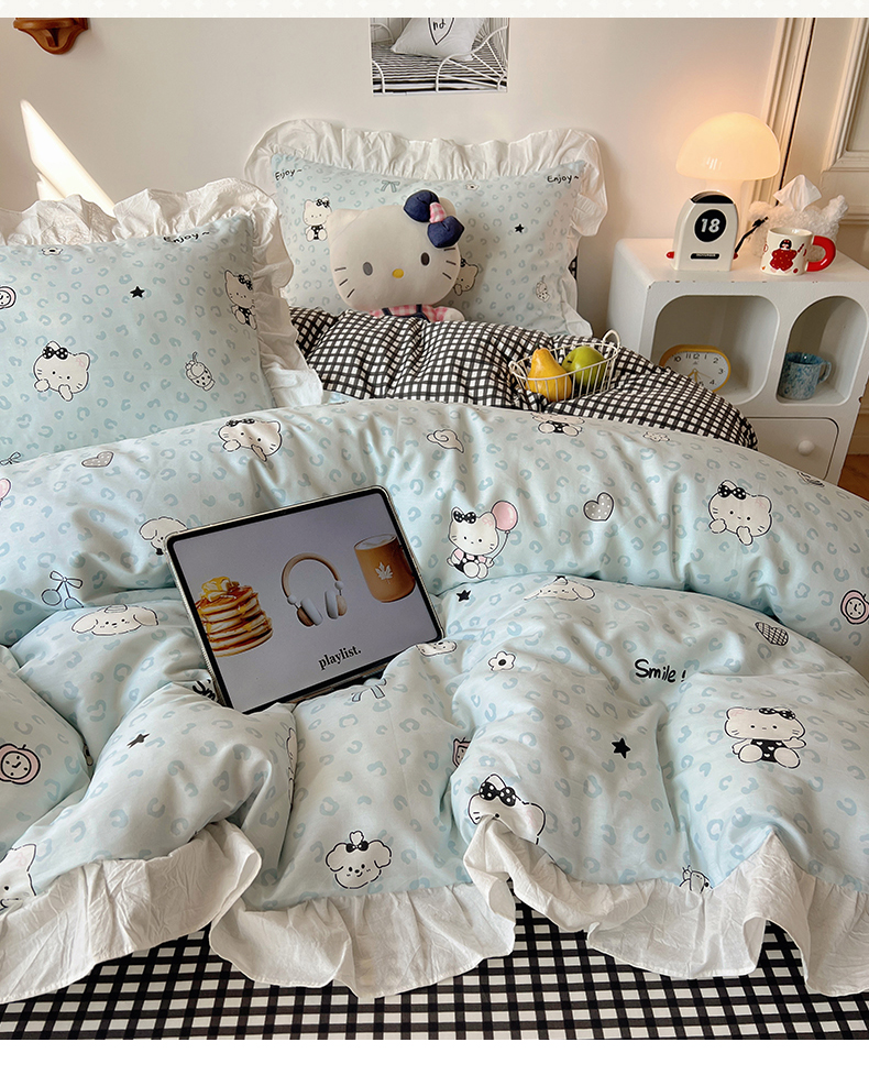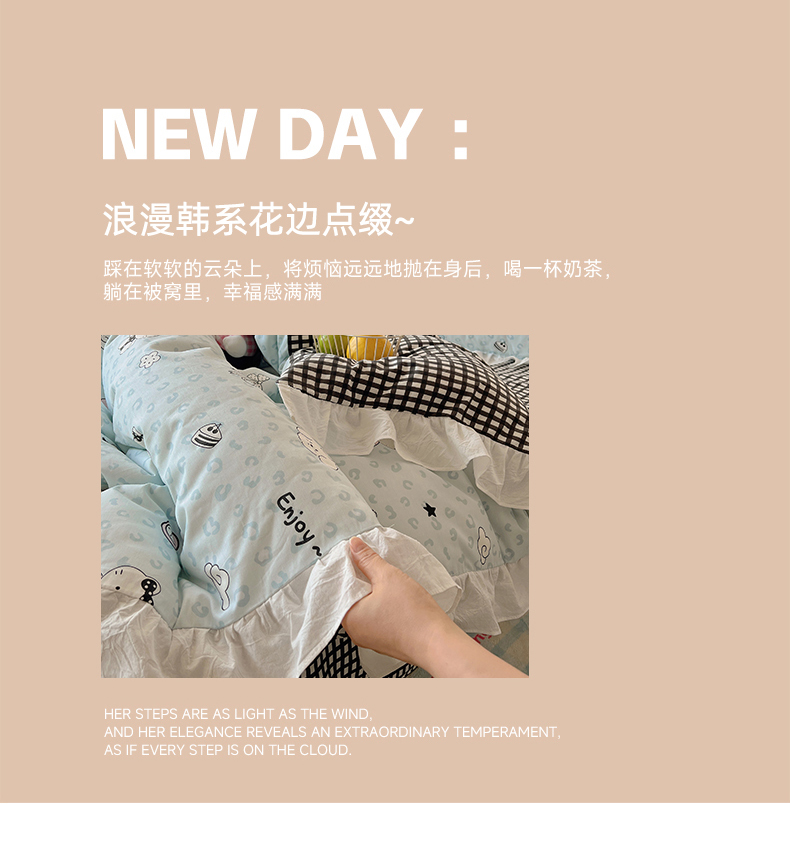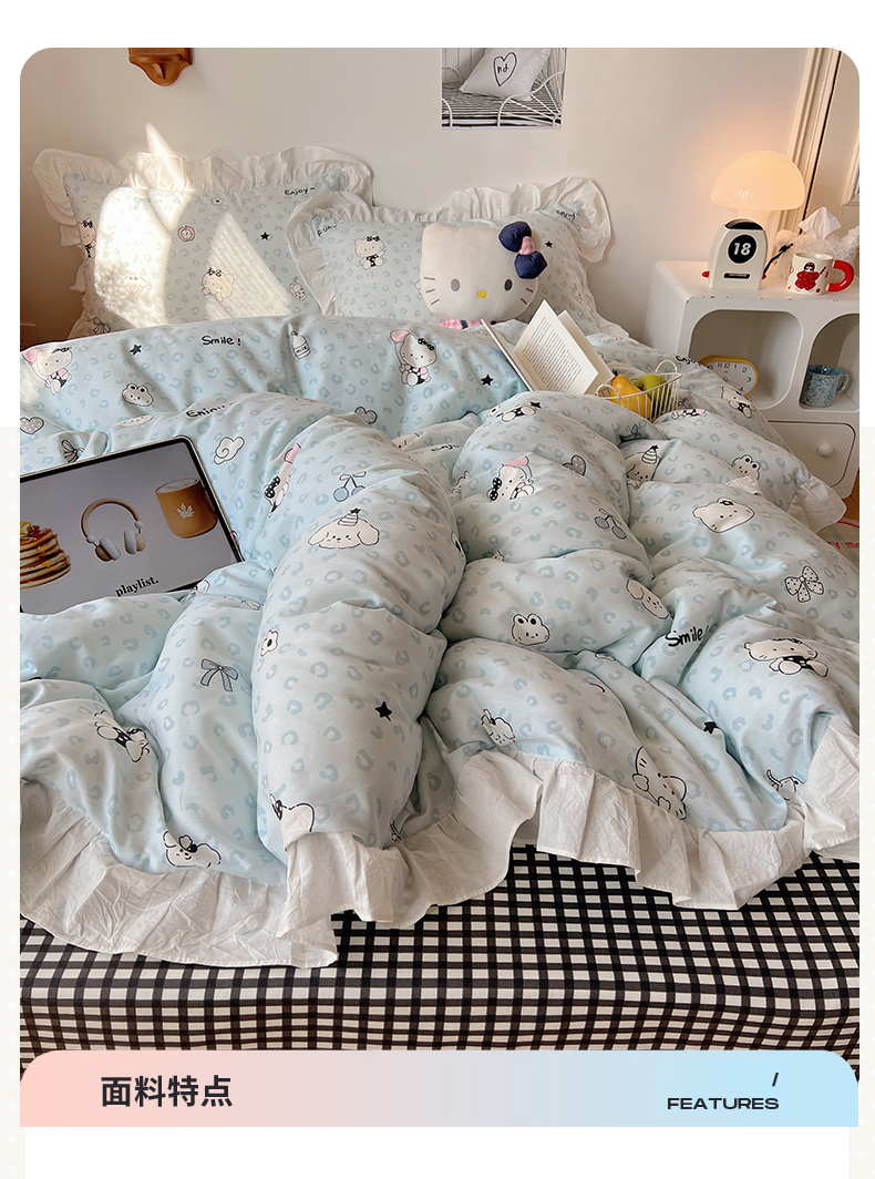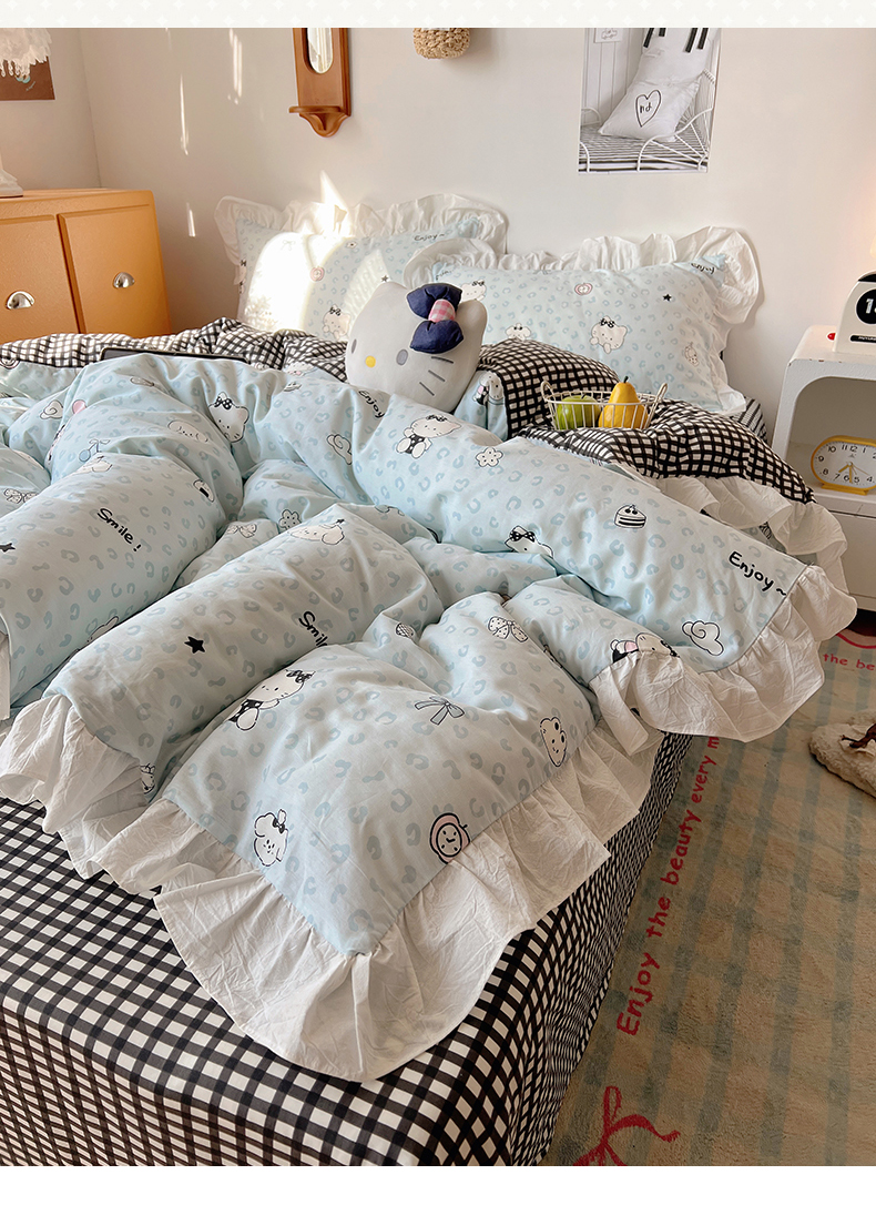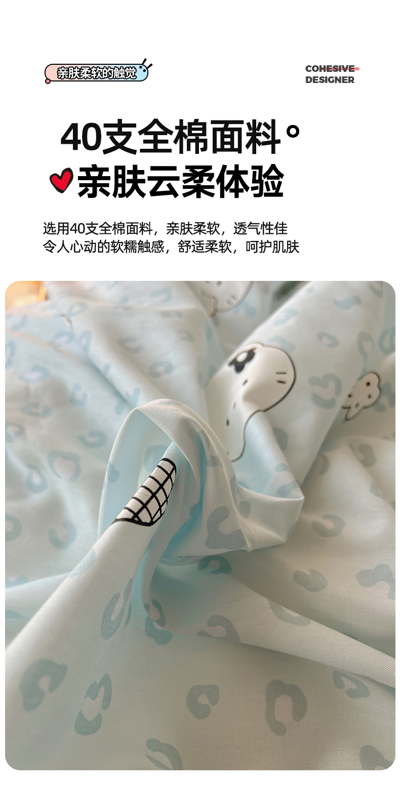 商品名称:六巷胡同 2026春夏新款韩系可爱风花边款卡通全棉四件套(第一系列) 花边海盐豹纹猫