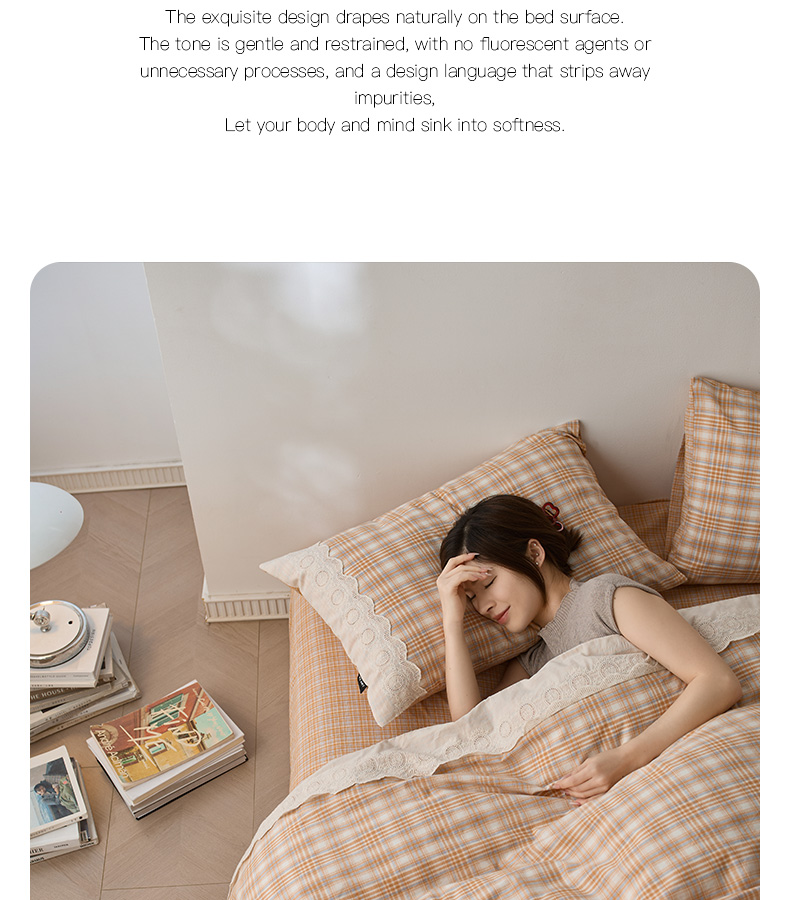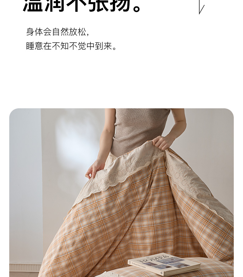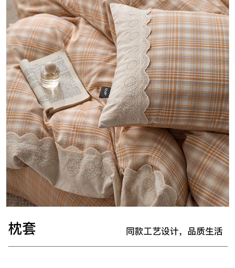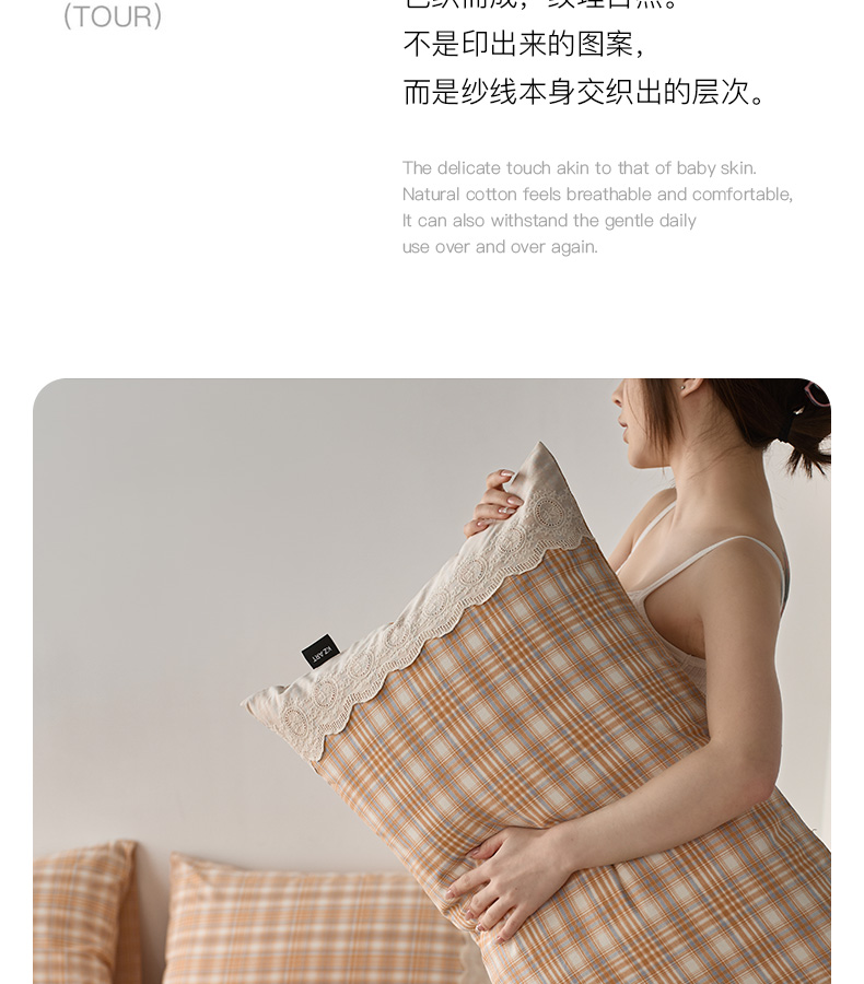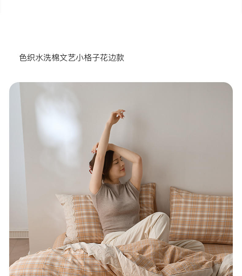 商品名称:卡姿家纺 2026春夏色织水洗棉文艺小格子花边款 利奥-暖桔